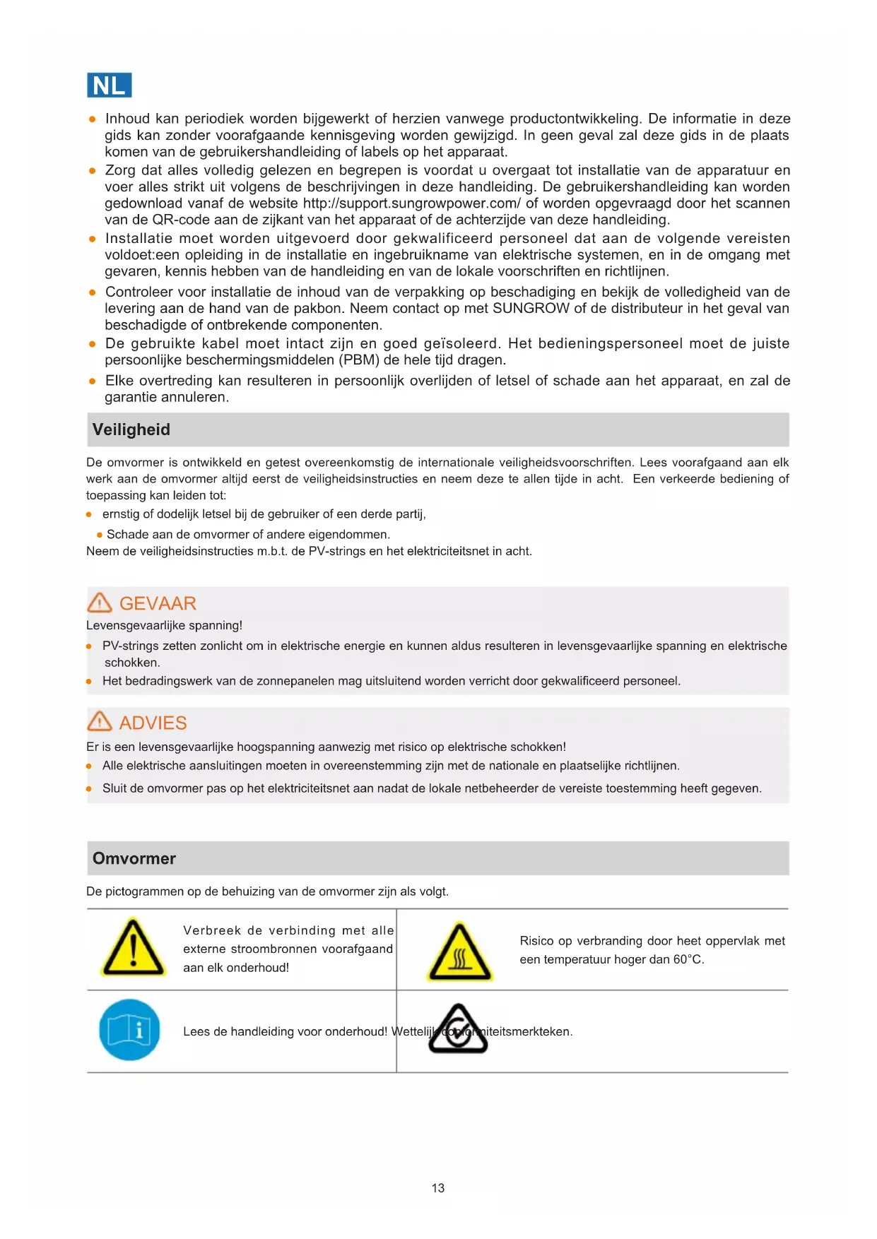 ● Inhoud kan periodiek worden bijgewerkt of herzien vanwege productontwikkeling. De informatie in deze gids kan zonder voorafgaande kennisgeving worden gewijzigd. In geen geval zal deze gids in de plaats komen van de gebruikershandleiding of labels op het apparaat. ● Zorg dat alles volledig gelezen en begrepen is voordat u overgaat tot installatie van de apparatuur en voer alles strikt uit volgens de beschrijvingen in deze handleiding. De gebruikershandleiding kan worden gedownload vanaf de website http://support.sungrowpower.com/ of worden opgevraagd door het scannen van de QR-code aan de zijkant van het apparaat of de achterzijde van deze handleiding. ● Installatie moet worden uitgevoerd door gekwalificeerd personeel dat aan de volgende vereisten voldoet:een opleiding in de installatie en ingebruikname van elektrische systemen, en in de omgang met gevaren, kennis hebben van de handleiding en van de lokale voorschriften en richtlijnen. ● Controleer voor installatie de inhoud van de verpakking op beschadiging en bekijk de volledigheid van de levering aan de hand van de pakbon. Neem contact op met SUNGROW of de distributeur in het geval van beschadigde of ontbrekende componenten. ● De gebruikte kabel moet intact zijn en goed geïsoleerd. Het bedieningspersoneel moet de juiste persoonlijke beschermingsmiddelen (PBM) de hele tijd dragen. ● Elke overtreding kan resulteren in persoonlijk overlijden of letsel of schade aan het apparaat, en zal de garantie annuleren. Veiligheid De omvormer is ontwikkeld en getest overeenkomstig de internationale veiligheidsvoorschriften. Lees voorafgaand aan elk werk aan de omvormer altijd eerst de veiligheidsinstructies en neem deze te allen tijde in acht. Een verkeerde bediening of toepassing kan leiden tot: ● ernstig of dodelijk letsel bij de gebruiker of een derde partij, ● Schade aan de omvormer of andere eigendommen. Neem de veiligheidsinstructies m.b.t. de PV-strings en het elektriciteitsnet in acht. GEVAAR Levensgevaarlijke spanning! ● PV-strings zetten zonlicht om in elektrische energie en kunnen aldus resulteren in levensgevaarlijke spanning en elektrische schokken. ● Het bedradingswerk van de zonnepanelen mag uitsluitend worden verricht door gekwaliceerd personeel. ADVIES Er is een levensgevaarlijke hoogspanning aanwezig met risico op elektrische schokken! ● Alle elektrische aansluitingen moeten in overeenstemming zijn met de nationale en plaatselijke richtlijnen. ● Sluit de omvormer pas op het elektriciteitsnet aan nadat de lokale netbeheerder de vereiste toestemming heeft gegeven. Omvormer De pictogrammen op de behuizing van de omvormer zijn als volgt. Verbreek de verbinding met alle externe stroombronnen voorafgaand aan elk onderhoud! Risico op verbranding door heet oppervlak met een temperatuur hoger dan 60°C. Lees de handleiding voor onderhoud! Wettelijk conformiteitsmerkteken.14 Er is een levensgevaarlijke hoogspanning aanwezig! Alleen gekwaliceerd personeel mag de omvormer openen en onderhoud plegen! Er is een levensgevaarlijke hoogspanning aanwezig! Raak geen onderdelen aan die onder spanning staan tot 10 minuten na het afkoppelen van de stroombronnen! TÜV-conformiteitsmarkering. CE-conformiteitsmarkering. EU/EER-importeur. Gooi de omvormer niet weg bij het huishoudelijk afval. De omvormer heeft geen transformator. Extra aardingspunt. UKCA-conformiteitsmarkering. RoHS-labeling Het product voldoet aan de vereisten van de van toepassing zijnde EU- richtlijnen. CMIM-conformiteitsmarkering. Gebruikers kunnen ook andere waarschuwingstekens aanbrengen overeenkomstig de lokale normen of installatiespecicaties. Veiligheidsverklaring ● Voor meer informatie over hoe het product reageert op kwetsbaarheden in de netwerkbeveiliging en over de openbaarmaking van kwetsbaarheden, kunt u de QR-code aan de rechterkant scannen of de volgende website bezoeken: https://en.sungrowpower.com/security-vulnerability- management ● Meer informatie over netwerkbeveiliging vindt u in de gebruikershandleiding van de communicatiemodule of de datalogger die bij het product wordt geleverd. EU-conformiteitsverklaring binnen het bereik van de EU-richtlijnen: ● Laagspanningsrichtlijn 2014/35/EU (LSR) ● Elektromagnetische compatibiliteit 2014/30/EU (EMC) ● Beperking van het gebruik van bepaalde gevaarlijke stoen 2011/65/EU en 2015/863/EU (RoHS) ● SUNGROW bevestigt hierbij dat de in dit document beschreven producten voldoen aan de essentiële eisen en andere relevante bepalingen van de hierboven genoemde richtlijnen. De volledige EU-conformiteitsverklaring vindt u op support. sungrowpower.com. ● De communicatiemodule die bij de omvormer wordt geleverd en de technische parameters voor draadloze communicatie staan in de onderstaande tabel. Het model van de daadwerkelijk geleverde communicatiemodule is doorslaggevend.De volledige EU-conformiteitsverklaring voor de communicatiemodule vindt u op support.sungrowpower.com. WiNet-S/WiNet-S2:15 Radiotechnologie WLANI 802.11b/g/n20/n40 Radiospectrum 802.11b/g/n 802.11n40 2412 MHz ~ 2472 MHz 2422 MHz ~ 2462 MHz Maximaal zendvermogen ≤ 20 dBm Bovenstaande technische parameters gelden alleen voor EU-landen. Fabrikant : Sungrow Power Supply Co., Ltd. No 1699. Xiyou Road,Hefei 230088.P.R.China Alleen voor de EU EU/EEA importeur: Sungrow Deutschland GmbH Balanstraße 59, 81541 München, Duitsland GEVAAR Er is een levensgevaarlijke hoogspanning aanwezig met risico op elektrische schokken! ● De behuizing niet openen. Indien de behuizing onrechtmatig wordt geopend, komt het recht op garantie te vervallen en wordt de gebruikslicentie in de meeste gevallen beëindigd. ● Wanneer de behuizingsdeksel wordt verwijderd, is direct contact mogelijk met onder spanning staande delen. Dit kan leiden tot ernstig of dodelijk letsel als gevolg van elektrische schokken. Risico op levensgevaarlijke elektrische schokken door mogelijke beschadiging van omvormer ● Gebruik de omvormer uitsluitend wanneer deze in een techni