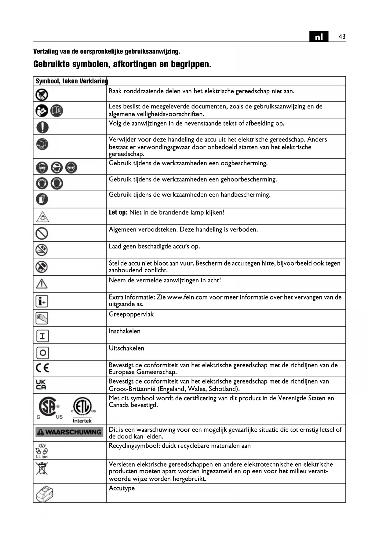 Vertaling van de oorspronkelijke gebruiksaanwijzing. Gebruikte symbolen, afkortingen en begrippen. Symbool, teken Verklaring Raak ronddraaiende delen van het elektrische gereedschap niet aan. Lees beslist de meegeleverde documenten, zoals de gebruiksaanwijzing en de algemene veiligheidsvoorschriften. Volg de aanwijzingen in de nevenstaande tekst of afbeelding op. Verwijder voor deze handeling de accu uit het elektrische gereedschap. Anders bestaat er verwondingsgevaar door onbedoeld starten van het elektrische gereedschap. Gebruik tijdens de werkzaamheden een oogbescherming. Gebruik tijdens de werkzaamheden een gehoorbescherming. Gebruik tijdens de werkzaamheden een handbescherming. Let op: Niet in de brandende lamp kijken! Algemeen verbodsteken. Deze handeling is verboden. Laad geen beschadigde accu’s op. Stel de accu niet bloot aan vuur. Bescherm de accu tegen hitte, bijvoorbeeld ook tegen aanhoudend zonlicht. Neem de vermelde aanwijzingen in acht! Extra informatie: Zie www.fein.com voor meer informatie over het vervangen van de uitgaande as. Greepoppervlak Inschakelen Uitschakelen Bevestigt de conformiteit van het elektrische gereedschap met de richtlijnen van de Europese Gemeenschap. Bevestigt de conformiteit van het elektrische gereedschap met de richtlijnen van Groot-Brittannië (Engeland, Wales, Schotland). Met dit symbool wordt de certificering van dit product in de Verenigde Staten en Canada bevestigd. Dit is een waarschuwing voor een mogelijk gevaarlijke situatie die tot ernstig letsel of de dood kan leiden. Recyclingsymbool: duidt recyclebare materialen aan Versleten elektrische gereedschappen en andere elektrotechnische en elektrische producten moeten apart worden ingezameld en op een voor het milieu verant- woorde wijze worden hergebruikt. Accutype44