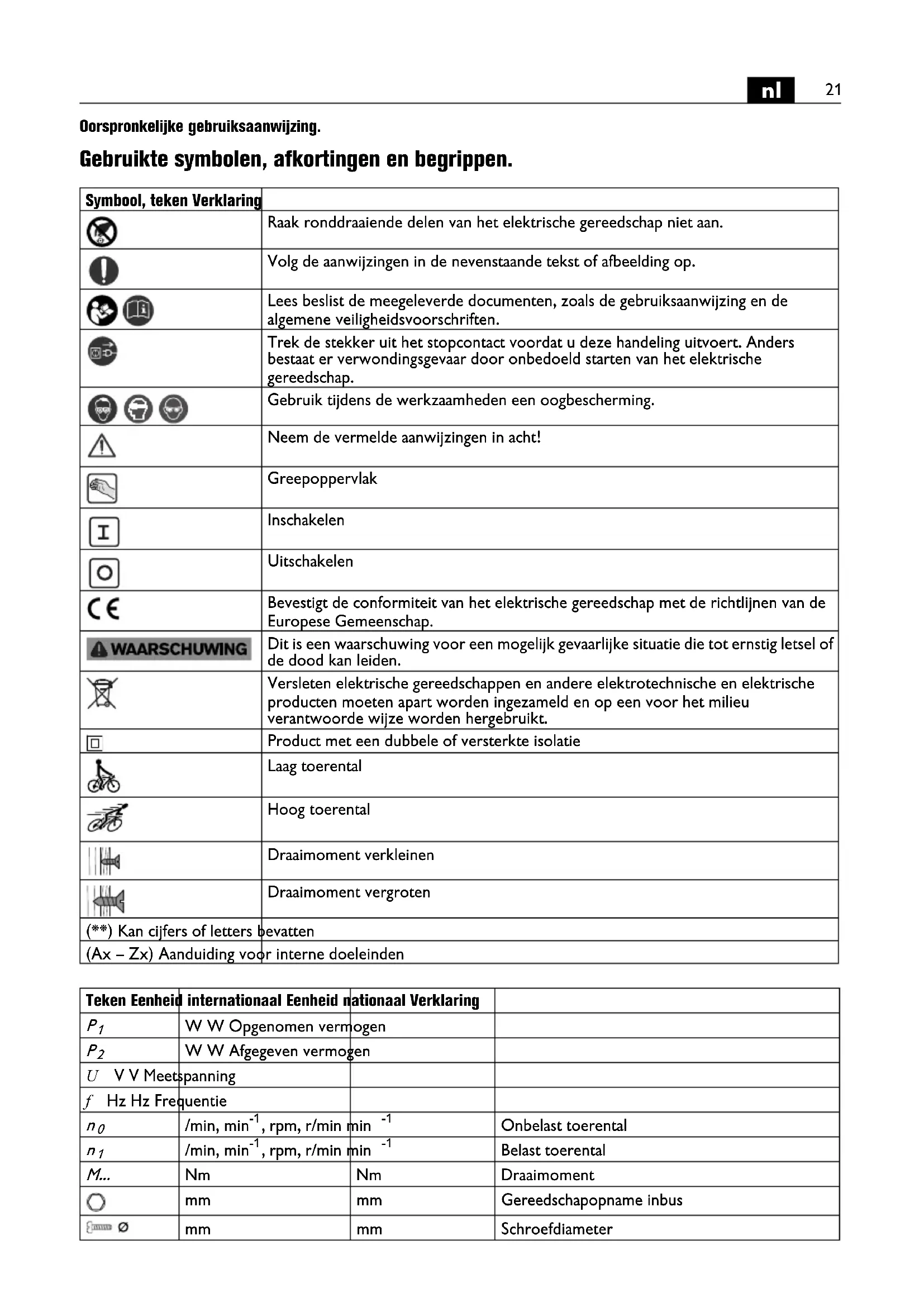 Oorspronkelijke gebruiksaanwijzing. Gebruikte symbolen, afkortingen en begrippen. Symbool, teken Verklaring Raak ronddraaiende delen van het elektrische gereedschap niet aan. Volg de aanwijzingen in de nevenstaande tekst of afbeelding op. Lees beslist de meegeleverde documenten, zoals de gebruiksaanwijzing en de algemene veiligheidsvoorschriften. Trek de stekker uit het stopcontact voordat u deze handeling uitvoert. Anders bestaat er verwondingsgevaar door onbedoeld starten van het elektrische gereedschap. Gebruik tijdens de werkzaamheden een oogbescherming. Neem de vermelde aanwijzingen in acht! Greepoppervlak Inschakelen Uitschakelen Bevestigt de conformiteit van het elektrische gereedschap met de richtlijnen van de Europese Gemeenschap. Dit is een waarschuwing voor een mogelijk gevaarlijke situatie die tot ernstig letsel of de dood kan leiden. Versleten elektrische gereedschappen en andere elektrotechnische en elektrische producten moeten apart worden ingezameld en op een voor het milieu verantwoorde wijze worden hergebruikt. Product met een dubbele of versterkte isolatie Laag toerental Hoog toerental Draaimoment verkleinen Draaimoment vergroten (**) Kan cijfers of letters bevatten (Ax – Zx) Aanduiding voor interne doeleinden Teken Eenheid internationaal Eenheid nationaal Verklaring