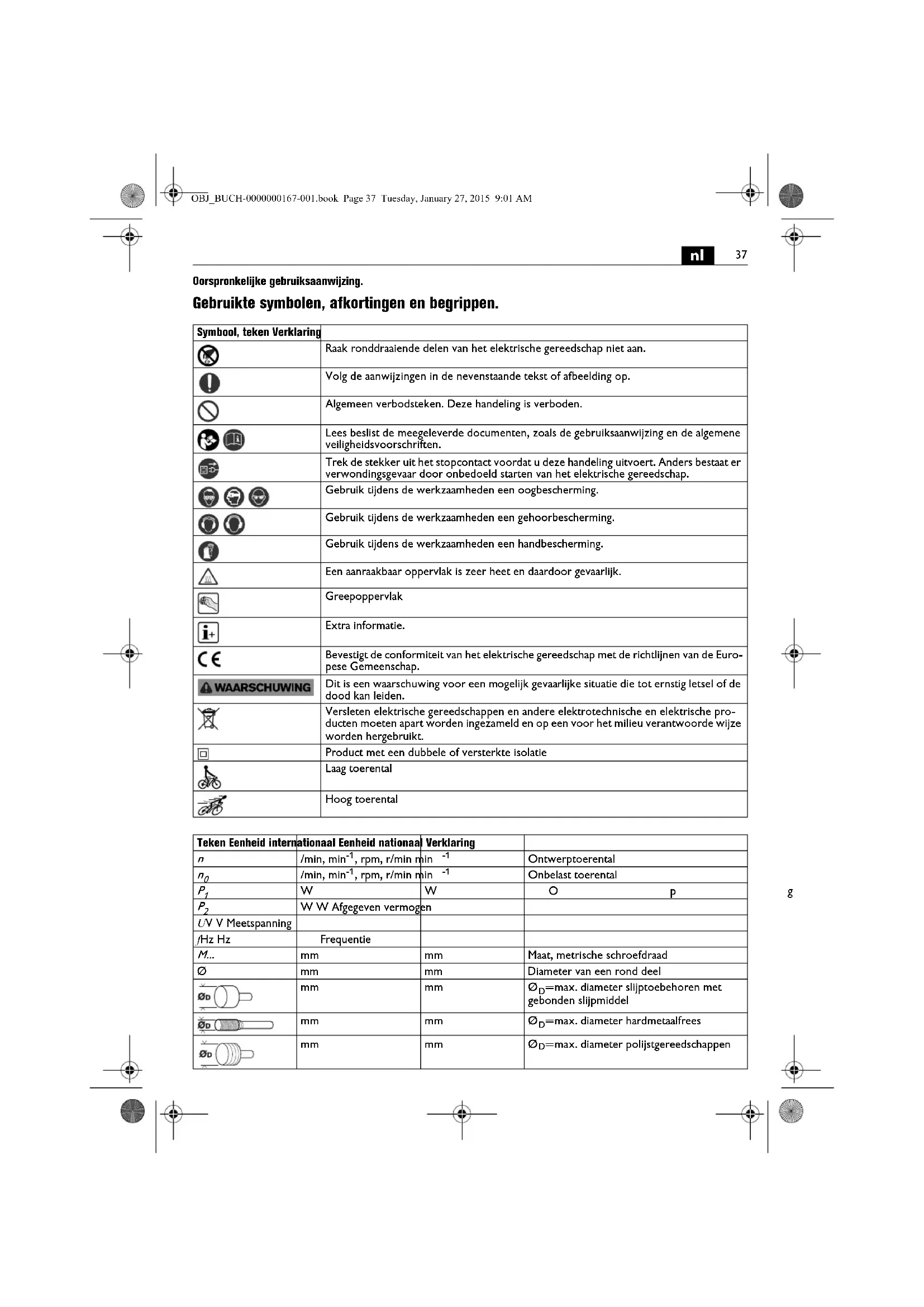 Oorspronkelijke gebruiksaanwijzing. Gebruikte symbolen, afkortingen en begrippen. Symbool, teken Verklaring Raak ronddraaiende delen van het elektrische gereedschap niet aan. Volg de aanwijzingen in de nevenstaande tekst of afbeelding op. Algemeen verbodsteken. Deze handeling is verboden. Lees beslist de meegeleverde documenten, zoals de gebruiksaanwijzing en de algemene veiligheidsvoorschriften. Trek de stekker uit het stopcontact voordat u deze handeling uitvoert. Anders bestaat er verwondingsgevaar door onbedoeld starten van het elektrische gereedschap. Gebruik tijdens de werkzaamheden een oogbescherming. Gebruik tijdens de werkzaamheden een gehoorbescherming. Gebruik tijdens de werkzaamheden een handbescherming. Een aanraakbaar oppervlak is zeer heet en daardoor gevaarlijk. Greepoppervlak Extra informatie. Bevestigt de conformiteit van het elektrische gereedschap met de richtlijnen van de Euro- pese Gemeenschap. Dit is een waarschuwing voor een mogelijk gevaarlijke situatie die tot ernstig letsel of de dood kan leiden. Versleten elektrische gereedschappen en andere elektrotechnische en elektrische pro- ducten moeten apart worden ingezameld en op een voor het milieu verantwoorde wijze worden hergebruikt. Product met een dubbele of versterkte isolatie Laag toerental Hoog toerental Teken Eenheid internationaal Eenheid nationaal Verklaring