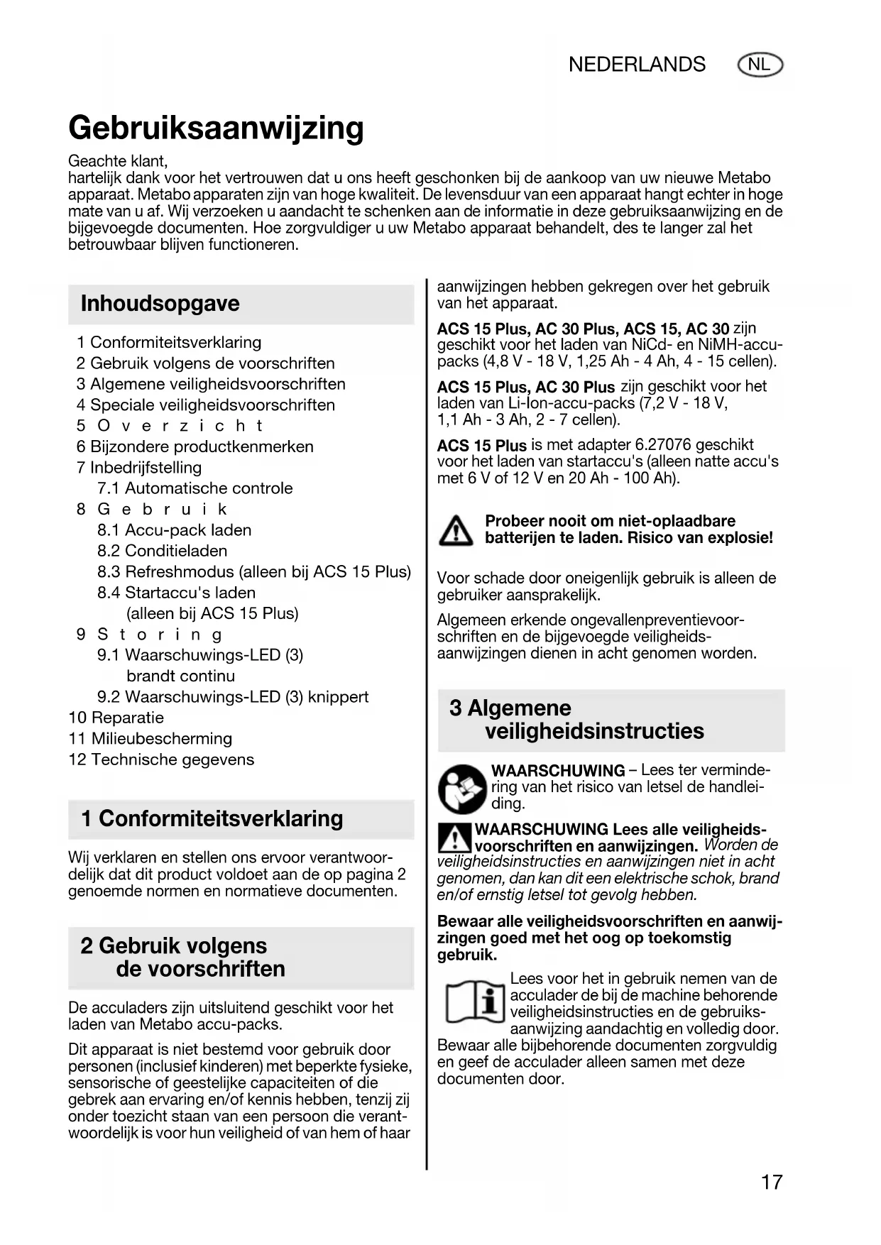 10 Reparatie 11 Milieubescherming 12 Technische gegevens Wij verklaren en stellen ons ervoor verantwoor- delijk dat dit product voldoet aan de op pagina 2 genoemde normen en normatieve documenten. De acculaders zijn uitsluitend geschikt voor het laden van Metabo accu-packs. Dit apparaat is niet bestemd voor gebruik door personen (inclusief kinderen) met beperkte fysieke, sensorische of geestelijke capaciteiten of die gebrek aan ervaring en/of kennis hebben, tenzij zij onder toezicht staan van een persoon die verant- woordelijk is voor hun veiligheid of van hem of haar aanwijzingen hebben gekregen over het gebruik van het apparaat. ACS 15 Plus, AC 30 Plus, ACS 15, AC 30 zijn geschikt voor het laden van NiCd- en NiMH-accu- packs (4,8 V - 18 V, 1,25 Ah - 4 Ah, 4 - 15 cellen). ACS 15 Plus, AC 30 Plus zijn geschikt voor het laden van Li-Ion-accu-packs (7,2 V - 18 V, 1,1 Ah - 3 Ah, 2 - 7 cellen). ACS 15 Plus is met adapter 6.27076 geschikt voor het laden van startaccu's (alleen natte accu's met 6 V of 12 V en 20 Ah - 100 Ah). Probeer nooit om niet-oplaadbare batterijen te laden. Risico van explosie! Voor schade door oneigenlijk gebruik is alleen de gebruiker aansprakelijk. Algemeen erkende ongevallenpreventievoor- schriften en de bijgevoegde veiligheids- aanwijzingen dienen in acht genomen worden. WAARSCHUWING – Lees ter verminde- ring van het risico van letsel de handlei- ding. WAARSCHUWING Lees alle veiligheids- voorschriften en aanwijzingen. Worden de veiligheidsinstructies en aanwijzingen niet in acht genomen, dan kan dit een elektrische schok, brand en/of ernstig letsel tot gevolg hebben. Bewaar alle veiligheidsvoorschriften en aanwij- zingen goed met het oog op toekomstig gebruik. Lees voor het in gebruik nemen van de acculader de bij de machine behorende veiligheidsinstructies en de gebruiks- aanwijzing aandachtig en volledig door. Bewaar alle bijbehorende documenten zorgvuldig en geef de acculader alleen samen met deze documenten door. Gebruiksaanwijzing Geachte klant, hartelijk dank voor het vertrouwen dat u ons heeft geschonken bij de aankoop van uw nieuwe Metabo apparaat. Metabo apparaten zijn van hoge kwaliteit. De levensduur van een apparaat hangt echter in hoge mate van u af. Wij verzoeken u aandacht te schenken aan de informatie in deze gebruiksaanwijzing en de bijgevoegde documenten. Hoe zorgvuldiger u uw Metabo apparaat behandelt, des te langer zal het betrouwbaar blijven functioneren. Inhoudsopgave 1 Conformiteitsverklaring 2 Gebruik volgens de voorschriften 3 Algemene veiligheidsinstructies 17024963_0309 ACS 15 AC 30.book Seite 17 Mittwoch, 4. März 2009 4:29 1618 NEDERLANDS