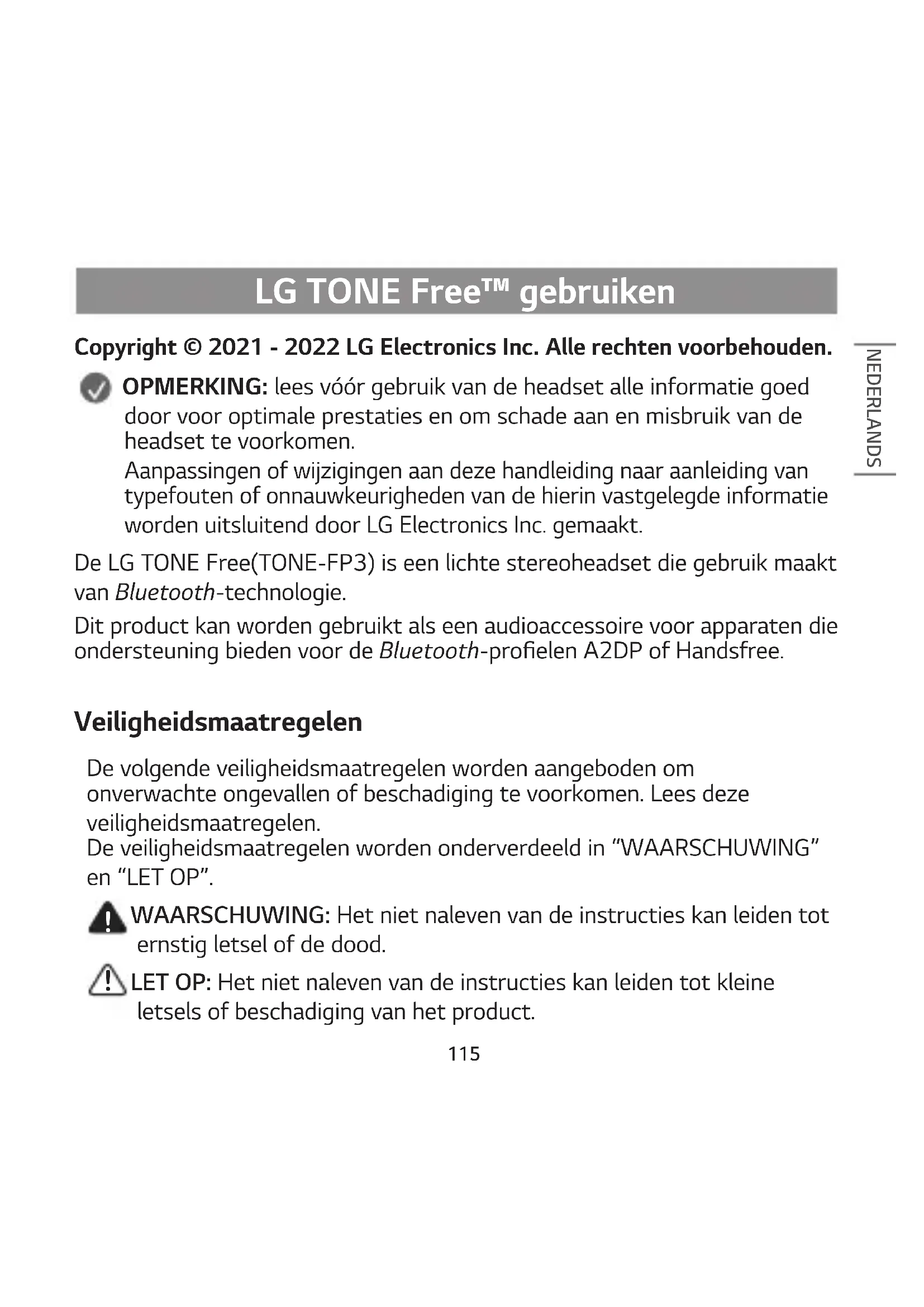Copyright © 2021 - 2022 LG Electronics Inc. Alle rechten voorbehouden. OPMERKING: lees vóór gebruik van de headset alle informatie goed door voor optimale prestaties en om schade aan en misbruik van de headset te voorkomen. Aanpassingen of wijzigingen aan deze handleiding naar aanleiding van typefouten of onnauwkeurigheden van de hierin vastgelegde informatie worden uitsluitend door LG Electronics Inc. gemaakt. De LG TONE Free(TONE-FP3) is een lichte stereoheadset die gebruik maakt van Bluetooth-technologie. Dit product kan worden gebruikt als een audioaccessoire voor apparaten die ondersteuning bieden voor de Bluetooth-proelen A2DP of Handsfree. Veiligheidsmaatregelen De volgende veiligheidsmaatregelen worden aangeboden om onverwachte ongevallen of beschadiging te voorkomen. Lees deze veiligheidsmaatregelen. De veiligheidsmaatregelen worden onderverdeeld in “WAARSCHUWING” en “LET OP”.
