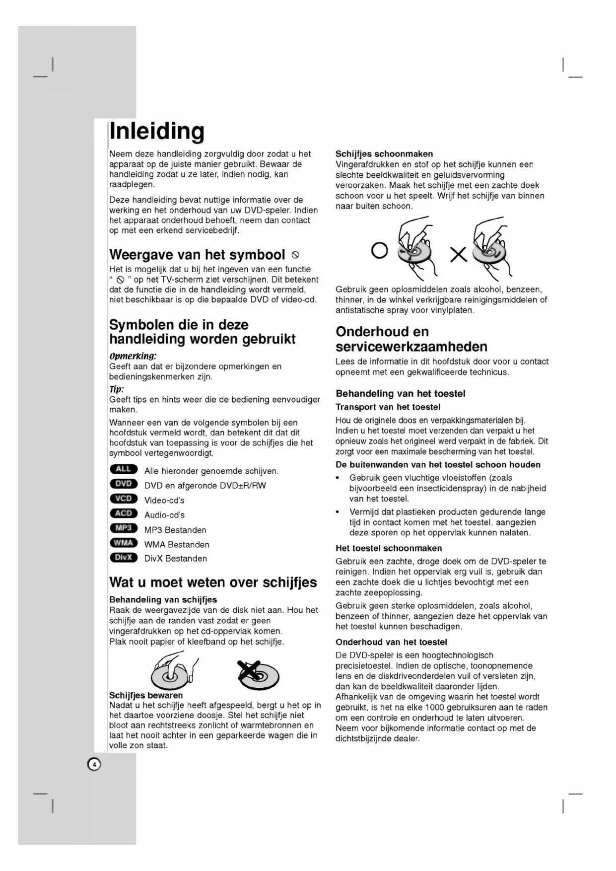 deze handleiding worden gebruikt Opmerking: Geeftaandaterbijzondereopmerkingenenbedieningskenmerkenzijn. Tip: Geefttipsenhintsweerdiedebedieningeenvoudigermaken.Wanneereen vandevolgendesymbolenbijeenhoofdstukvermeldwordt,danbetekentditdatdithoofdstukvantoepassingisvoordeschijfjesdiehetsymboolvertegenwoordigt.Allehierondergenoemdeschijven.DVDenafgerondeDVD±R/RWVideo-cd'sAudio-cd'sMP3BestandenWMABestandenDivXBestanden Wat moet weten over schijfjes Behandelingvan schijfjes Raakdeweergavezijdevandedisknietaan.Houhetschijfjeaande randenvastzodatergeenvingerafdrukkenophetcd-oppervlakkomen.Plaknooitpapierofkleefbandophetschijfje. Schijfjes bewarenNadatuhetschijfjeheeftafgespeeld,bergtuhetopinhetdaartoevoorzienedoosje.Stelhetschijfjenietblootaanrechtstreekszonlichtofwarmtebronnenenlaathetnooitachterineengeparkeerdewagendieinvollezonstaat. Schijfjes schoonmakenVingerafdrukkenenstofophetschijfjekunneneenslechtebeeldkwaliteitengeluidsvervormingveroorzaken.Maakhetschijfjemeteenzachtedoekschoonvooruhetspeelt.Wrijfhetschijfjevanbinnennaarbuitenschoon.Gebruikgeenoplosmiddelenzoalsalcohol,benzeen,thinner,indewinkelverkrijgbarereinigingsmiddelenofantistatischesprayvoorvinylplaten. Onderhoud servicewerkzaamheden Leesdeinformatieindithoofdstukdoorvoorucontactopneemtmeteengekwalificeerdetechnicus. Behandeling vanhettoestelTransportvanhettoestelHoudeorigineledoosenverpakkingsmaterialenbij.Indienuhettoestelmoetverzendendanverpaktuhetopnieuwzoalshetorigineelwerdverpaktindefabriek.Ditzorgtvooreenmaximalebeschermingvanhettoestel.Debuitenwandenvanhettoestelschoonhouden?Gebruikgeenvluchtigevloeistoffen(zoalsbijvoorbeeldeeninsecticidenspray)indenabijheidvanhettoestel.?Vermijddatplastiekenproductengedurendelangetijdincontactkomenmethettoestel,aangeziendezesporenophetoppervlakkunnennalaten.HettoestelschoonmakenGebruikeenzachte,drogedoekomdeDVD-spelertereinigen.Indienhetoppervlakergvuilis,gebruikdaneenzachtedoekdieulichtjesbevochtigtmeteenzachtezeepoplossing.Gebruikgeensterkeoplosmiddelen,zoalsalcohol,benzeenofthinner,aangeziendezehetoppervlakvanhettoestelkunnenbeschadigen.OnderhoudvanhettoestelDeDVD-speleriseenhoogtechnologischprecisietoestel.Indiendeoptische,toonopnemendelensendediskdriveonderdelenvuilofversletenzijn,dankandebeeldkwaliteitdaaronderlijden.Afhankelijkvandeomgevingwaarinhettoestelwordtgebruikt,ishetnaelke1000gebruiksurenaanteradenomeencontroleenonderhoudtelatenuitvoeren.Neemvoorbijkomendeinformatiecontactopmetdedichtstbijzijndedealer.DivXWMAMP3ACDVCDDVDALL Inleiding5 Soorten afspeelbare schijfjes DVD cm/12cm schijfje) Video-cd (VCD/SVCD)