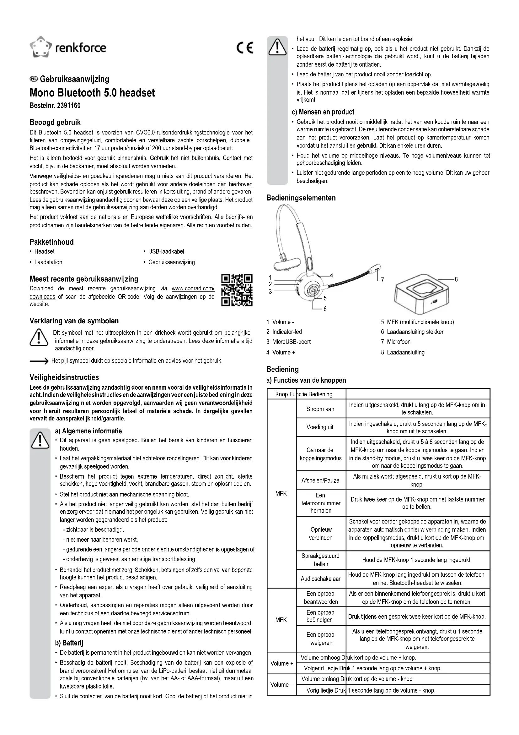 10, Mac OS X 10.1, Android 8.0, iOS 13.1, iPad OS 13.1 of hoger Geluidsdruk .................................. max. 80,34 dB Bereik ........................................... 10 m Ruisonderdrukking ........................ CVC6.0 Batterijgebruik per lading .............. 17 uur praten/muziek 200 uur stand-by Frequentie .................................... 2,402 - 2,480 GHz Zendvermogen ............................. max. -1,64 dBm Bereik ........................................... max. 10 m Bedrijfs-/opslagcondities ............... 0 tot +40 °C (gebruik) -10 tot +50 °C (opslag) 10 tot 85 % RRV (niet condenserend) Afmetingen (B x H x D) ................. 142 x 49 x 163 mm Gewicht ......................................... 242 g (headset, laadstation, kabel) 54 g (headset) Dit is een publicatie van Conrad Electronic SE, Klaus-Conrad-Str. 1, D-92240 Hirschau (www.conrad.com). Alle rechten, vertaling inbegrepen, voorbehouden. Reproducties van welke aard dan ook, bijvoorbeeld fotokopie, microverlming of de registratie in elektronische gegevensverwerkingsapparatuur, vereisen de schriftelijke toestemming van de uitgever. Nadruk, ook van uittreksels, verboden. De publicatie voldoet aan de technische stand bij het in druk bezorgen. Copyright 2022 by Conrad Electronic SE. *2391160_V4_0122_02_dm_mh_NL