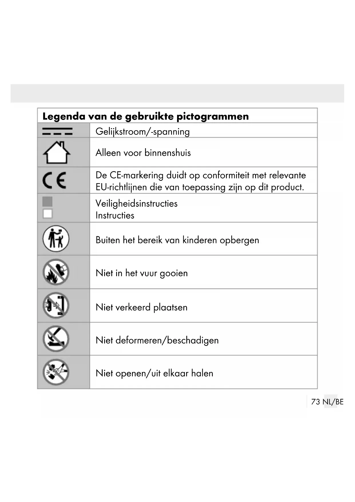 BEWAREN! Het inslikken kan chemische brandwonden, perforatie van zacht weefsel en de dood veroorzaken. Ernstige brandwonden kunnen binnen 2 uur na het inslikken opt- reden. Neem direct contact op met een arts. LEVENSGEVAAR! Houd batterijen/accu‘s buiten het bereik van kinderen. Raadpleeg bij inslikken onmiddellijk een arts! Inslikken kan leiden tot inwendige verbrandingen, perforatie van zacht weefsel en tot de dood. Ernstige inwendige verbrandingen kunnen binnen 2 uur na het inslikken optreden.82 NL/BE EXPLOSIEGEVAAR! Laad niet oplaadbare batterijen nooit op. Sluit de batterijen/accu‘s niet kort en/of open deze niet. Daardoor kan de batterij oververhit raken, in brand vliegen of exploderen. Gooi batterijen/accu‘s nooit in het vuur of water. Stel batterijen/accu‘s nooit bloot aan mechanische belastingen. Risico dat de batterijen/accu’s lekken Vermijd extreme omstandigheden en temperaturen die invloed op de batterijen/accu‘s zouden kunnen hebben bijv. radiatoren/ direct zonlicht. Bij lekkende batterijen/accu‘s het contact van de chemicaliën met de huid, ogen en slijmvliezen vermijden! Spoel de desbetreffende plek- ken direct af met schoon water en raadpleeg onmiddellijk een arts! DRAAG VEILIGHEIDSHANDSCHOENEN! Lekkende of beschadigde batterijen/accu‘s kunnen in geval van huidcontact chemische brandwonden veroorza- ken. Draag daarom in dit geval geschikte veiligheidshandschoenen. Als de batterijen/accu‘s lekken, dient u deze direct uit het product te halen om beschadigingen te vermijden.83 NL/BE Gebruik alleen batterijen/accu‘s van hetzelfde type. Gebruik nooit nieuwe en oude batterijen/accu‘s door elkaar! Verwijder de batterijen/accu‘s, als u het product gedurende een langere periode niet gebruikt. Risico op beschadiging van het product Gebruik uitsluitend het aangegeven type batterij/accu! Plaats de batterijen/accu‘s volgens de weergegeven polariteit (+) en (-) op batterij/accu en op product. Reinig de contacten van de batterij/accu en in het batterijvak voor het plaatsen met een droge, pluisvrije doek of wattenstaafje! Verwijder verbruikte batterijen/accu‘s direct uit het product. Niet-duidelijke symptomen die door het inslikken van batterijen kunnen optreden Helaas is het niet altijd duidelijk wanneer er een knoopcelbatterij in de slokdarm van een kind aanwezig is. Er zijn geen specifieke symptomen die daarop wijzen. Het kind kan: