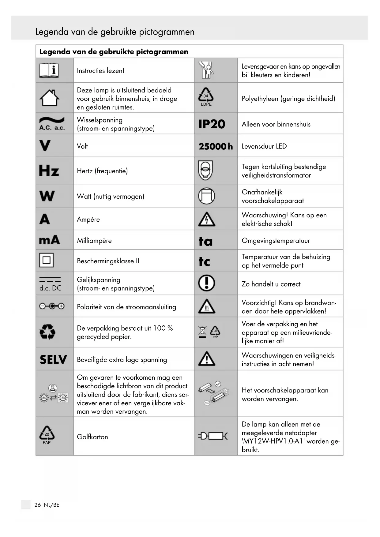 PAP Voer de verpakking en het apparaat op een milieuvriende- lijke manier af! SELV Beveiligde extra lage spanning Waarschuwingen en veiligheids- instructies in acht nemen! Om gevaren te voorkomen mag een beschadigde lichtbron van dit product uitsluitend door de fabrikant, diens ser- viceverlener of een vergelijkbare vak- man worden vervangen. Het voorschakelapparaat kan worden vervangen.