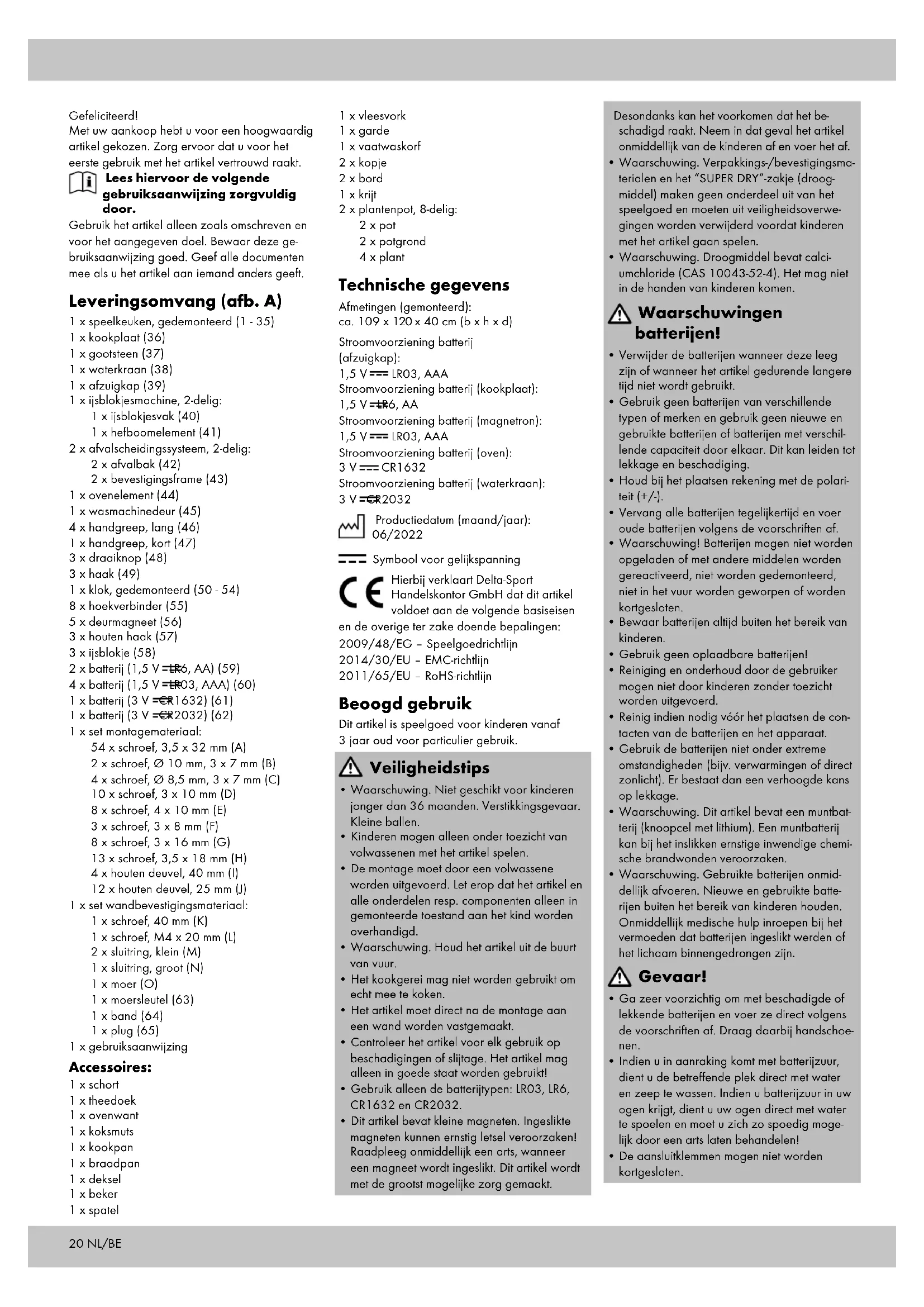 Het artikel en de verpakkingsmaterialen zijn recyclebaar; voer ze gescheiden af voor een be- tere afvalbehandeling. Het Triman-logo is alleen van toepassing voor Frankrijk. Informatie over de mogelijkheden om het afgedankte artikel af te voeren, wordt verstrekt door de gemeentelijke overheid. Opmerkingen over garantie en serviceafhandeling Het artikel werd met de grootste zorgvuldigheid en onder permanent toezicht geproduceerd. De firma DELTA-SPORT HANDELSKONTOR GmbH verleent particuliere eindklanten op dit artikel drie jaar garantie, te rekenen vanaf de datum van aankoop (garantietermijn) en dit op grond van de volgende bepalingen. De garantie geldt alleen voor materiaal- en verwerkingsfouten. De garantie is niet van toepassing op onderde- len die aan een normale slijtage onderhevig zijn en daarom als niet-slijtvaste onderdelen te beschouwen zijn (bv. batterijen) en evenmin op breekbare onderdelen, bv. schakelaars, accu’s of onderdelen die van glas gemaakt zijn. Uit de garantie voortvloeiende claims zijn uitge- sloten als het artikel onvakkundig, verkeerd of niet in het kader van de voorziene bepaling of in het kader van het voorziene gebruiksdoeleinde gebruikt werd of indien richtlijnen in de gebruiks- aanwijzing niet in acht genomen werden, tenzij de eindklant aantoont dat er sprake is van een materiaal- of verwerkingsfout die niet op één van de hoger vermelde omstandigheden gebaseerd is.22 NL/BE Uit de garantie voortvloeiende claims kunnen alleen tijdens de garantieperiode op vertoon van de originele kassabon ingediend wor- den. Gelieve daarom de originele kassabon te bewaren. De garantieperiode wordt door eventuele reparaties op grond van de garantie, wettelijke waarborg of coulance niet verlengd. Dit geldt ook voor vervangen en gerepareerde onderdelen. Gelieve u bij klachten in eerste instantie tot de hieronder vermelde servicehotline te richten of met ons per e-mail contact op te nemen. Is er sprake van een garantiegeval, dan wordt het ar- tikel door ons – naar onze keuze – voor u gratis gerepareerd, wordt het vervangen of wordt de aankoopsom terugbetaald. Verdere rechten op grond van de garantie bestaan niet. Uw wettelijke rechten, in het bijzonder rechten op garantie tegenover de betreffende verkoper, worden door deze garantie niet beperkt. IAN: 393059_2201 Service België Tel.: 0800 12089 E-Mail: deltasport@lidl.be Service Nederland Tel.: 08000249630 E-Mail: deltasport@lidl.nl23PL Gratulujemy! Decydując się na ten produkt, otrzymują Pań- stwo towar wysokiej jakości. Należy zapoznać się z produktem przed jego pierwszym użyciem. Należy uważnie przeczytać następującą instrukcję użytkowa- nia. Produkt ten należy użytkować wyłącznie w opisany sposób oraz zgodnie ze wskazanym przeznaczeniem. Niniejszą instrukcję użytko- wania należy przechowywać w bezpiecznym miejscu. Przekazując produkt innej osobie, należy upewnić się, że otrzyma ona także całą dokumentację dotyczącą produktu. Zakres dostawy (rys. A) 1 x zabawkowa kuchnia, do samodzielnego montażu (1–35) 1 x płyta grzewcza (36) 1 x zlewozmywak (37) 1 x kran (38) 1 x okap (39) 1 x kostkarka do lodu, 2-częściowa: 1 x pojemnik na lód (40) 1 x element dźwigni (41) 2 x system segregacji odpadów, 2-częściowy: 2 x pojemnik na odpady (42) 2 x rama mocująca (43) 1 x element piekarnika (44) 1 x iluminator (45) 4 x długi uchwyt (46) 1 x krótki uchwyt (47) 3 x pokrętło (48) 3 x haczyk (49) 1 x zegarek, do samodzielnego montażu (50–54) 8 x łącznik narożny (55) 5 x magnes drzwiowy (56) 3 x drewniany haczyk (57) 3 x kostka lodu (58) 2 x bateria (1,5 V LR6, AA) (59) 4 x bateria (1,5 V LR03, AAA) (60) 1 x bateria (3 V CR1632) (61) 1 x bateria (3 V CR2032) (62) 1 x zestaw materiałów do montażu: 54 x śruba, 3,5 x 32 mm (A) 2 x śruba, Ø 10 mm, 3 x 7 mm (B) 4 x śruba, Ø 8,5 mm, 3 x 7 mm (C) 10 x śruba, 3 x 10 mm (D) 8 x śruba, 4 x 10 mm (E) 3 x śruba, 3 x 8 mm (F) 8 x śruba, 3 x 16 mm (G) 13 x śruba, 3,5 x 18 mm (H) 4 x drewniany kołek, 40 mm (I) 12 x drewniany kołek, 25 mm (J) 1 x zestaw materiałów do montażu ściennego: 1 x śruba, 40 mm (K) 1 x śruba, M4 x 20 mm (L) 2 x podkładka, mała (M) 1 x podkładka, duża (N) 1 x nakrętka (O) 1 x klucz płaski (63) 1 x pasek (64) 1 x kołek rozporowy (65) 1 x instrukcja użytkowania Akcesoria: 1 x fartuch 1 x ścierka do naczyń 1 x rękawica kuchenna 1 x czapka szefa kuchni 1 x garnek 1 x brytfanna 1 x pokrywka 1 x kubek 1 x łopatka 1 x widelec do mięsa 1 x trzepaczka 1 x koszyk do zmywania 2 x filiżanka 2 x talerzyk 1 x kreda 2 x doniczka, 8-częściowa: 2 x doniczka 2 x ziemia 4 x roślina Dane techniczne Wymiary (po złożeniu): ok. 109 x 120 x 40 cm (szer. x wys. x gł.) Zasilanie bateriami (okap): 1,5 V LR03, AAA Zasilanie bateriami (płyta grzewcza): 1,5 V LR6, AA Zasilanie bateriami (mikrofalówka):