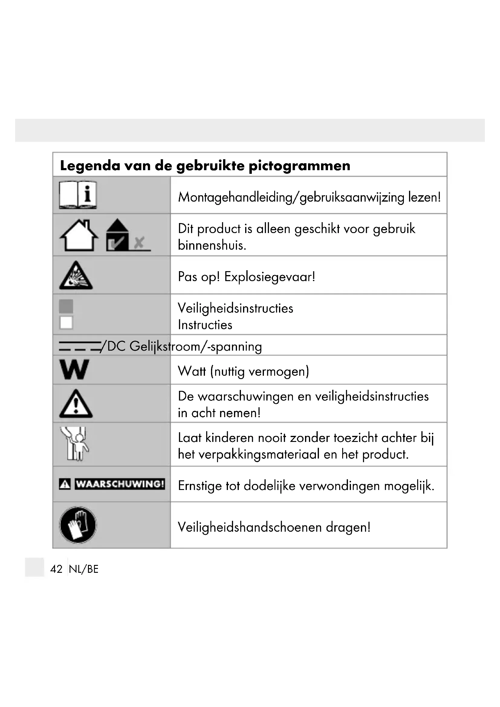 Legenda van de gebruikte pictogrammen .....Pagina 42 Inleiding ......................................................................................... Pagina 45 Correct en doelmatig gebruik ..........................................................Pagina 46 Beschrijving van de onderdelen ......................................................Pagina 46 Technische gegevens .......................................................................Pagina 46 Omvang van de levering .................................................................Pagina 46 Algemene veiligheidsinstructies ..............................Pagina 47 Veiligheidsinstructies voor batterijen/accu‘s ...................................Pagina 48 Ingebruikname ........................................................................Pagina 50 Batterijen plaatsen/vervangen ........................................................Pagina 51 Gebruik ..........................................................................................Pagina 52 Reiniging en onderhoud .................................................Pagina 53 Afvoer ..............................................................................................Pagina 53 Garantie en service .............................................................Pagina 55 Serviceadres .....................................................................................Pagina 56 Fabrikant ...........................................................................................Pagina 5742 NL/BE Legenda van de gebruikte pictogrammen Montagehandleiding/gebruiksaanwijzing lezen! Dit product is alleen geschikt voor gebruik binnenshuis. Pas op! Explosiegevaar! Veiligheidsinstructies Instructies /DC Gelijkstroom/-spanning Watt (nuttig vermogen) De waarschuwingen en veiligheidsinstructies in acht nemen! Laat kinderen nooit zonder toezicht achter bij het verpakkingsmateriaal en het product. Ernstige tot dodelijke verwondingen mogelijk. Veiligheidshandschoenen dragen!43 NL/BE Legenda van de gebruikte pictogrammen 6-uurs timer met automatische herhaling in een dagelijks ritme Werkt op batterijen Warm-wit licht Houd batterijen uit de buurt van kinderen. Gooi batterijen niet in het vuur. Plaats batterijen altijd met de juiste polariteit (+ en -). Beschadig batterijen niet. Open batterijen niet.44 NL/BE Legenda van de gebruikte pictogrammen Gebruik oplaadbare batterijen, zink-, koolstof-, alkaline- en lithium-batterijen niet door elkaar. Gebruik nooit gebruikte en nieuwe batterijen tegelijkertijd. Batterijen kunnen niet weer worden opgeladen. Laat batterijen niet met water in contact komen. Sluit batterijen niet kort.