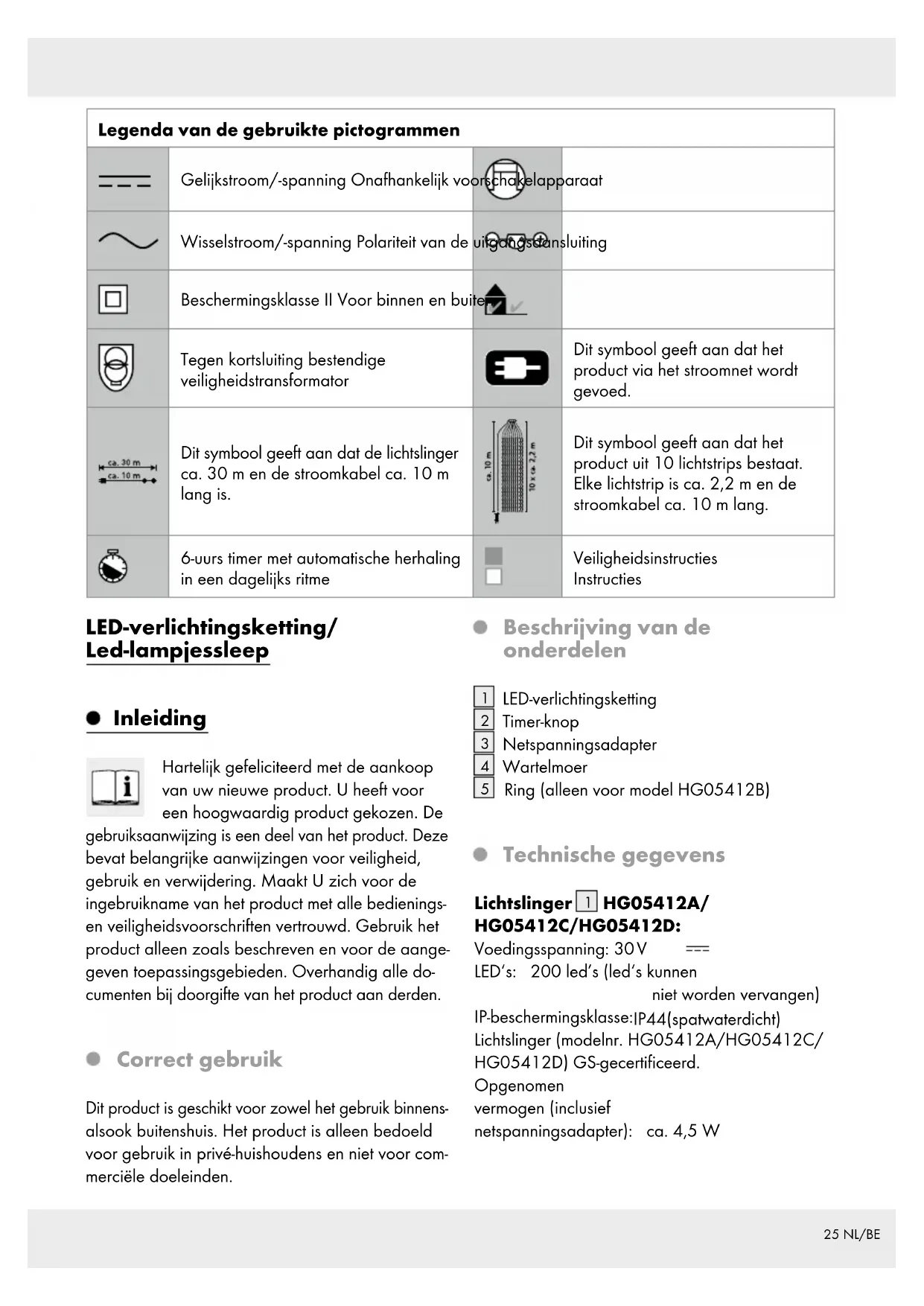 HG05412A/ HG05412C/HG05412D: Voedingsspanning: 30 V LED‘s: 200 led’s (led‘s kunnen niet worden vervangen) IP-beschermingsklasse: IP44 (spatwaterdicht) Lichtslinger (modelnr. HG05412A/HG05412C/ HG05412D) GS-gecertificeerd. Opgenomen vermogen (inclusief netspanningsadapter): ca. 4,5 W26 NL/BE HG05412B: Voedingsspanning: 30 V LED‘s: 180 led’s (de led‘s kunnen niet worden vervangen) IP-beschermingsklasse: IP44 (spatwaterdicht) Lichtslinger (modelnr.: HG05412B) GS-gecertificeerd. Totaal opgenomen stroom (meegeleverde netspanningsadapter): ca. 4,5 W Netspanningsadapter