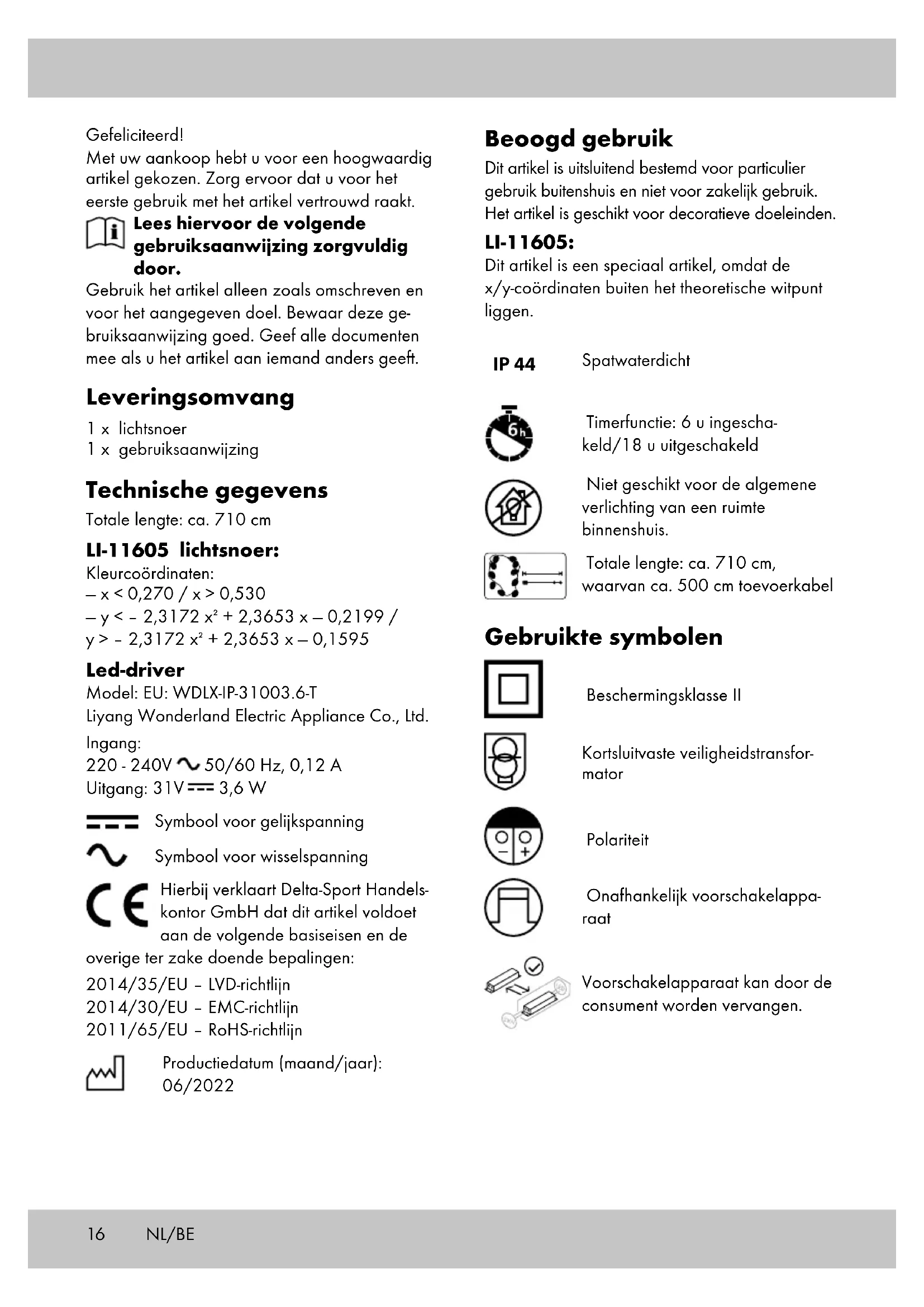 50/60 Hz, 0,12 A Uitgang: 31V 3,6 W Symbool voor gelijkspanning Symbool voor wisselspanning Hierbij verklaart Delta-Sport Handels- kontor GmbH dat dit artikel voldoet aan de volgende basiseisen en de overige ter zake doende bepalingen: 2014/35/EU – LVD-richtlijn 2014/30/EU – EMC-richtlijn 2011/65/EU – RoHS-richtlijn Productiedatum (maand/jaar): 06/2022 Beoogd gebruik Dit artikel is uitsluitend bestemd voor particulier gebruik buitenshuis en niet voor zakelijk gebruik. Het artikel is geschikt voor decoratieve doeleinden. LI-11605: Dit artikel is een speciaal artikel, omdat de x/y-coördinaten buiten het theoretische witpunt liggen. IP 44 Spatwaterdicht Timerfunctie: 6 u ingescha- keld/18 u uitgeschakeld Niet geschikt voor de algemene verlichting van een ruimte binnenshuis. Totale lengte: ca. 710 cm, waarvan ca. 500 cm toevoerkabel Gebruikte symbolen Beschermingsklasse II Kortsluitvaste veiligheidstransfor- mator Polariteit Onafhankelijk voorschakelappa- raat Voorschakelapparaat kan door de consument worden vervangen. NL/BE17NL/BE Veiligheidstips Belangrijk: lees deze gebruiksaanwij- zing zorgvuldig door en bewaar hem vervolgens goed! Levensgevaar!