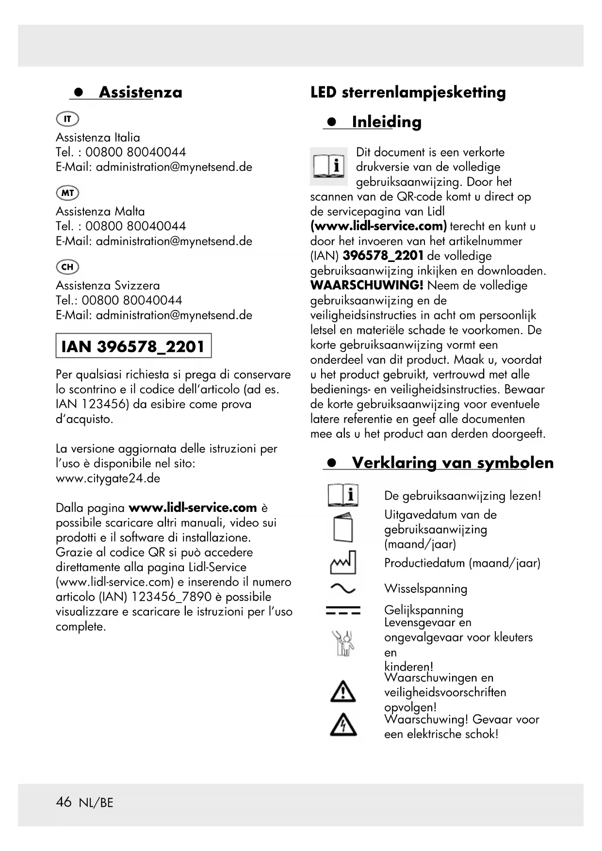 possibile scaricare altri manuali, video sui prodotti e il software di installazione. Grazie al codice QR si può accedere direttamente alla pagina Lidl-Service (www.lidl-service.com) e inserendo il numero articolo (IAN) 123456_7890 è possibile visualizzare e scaricare le istruzioni per l’uso complete. LED sterrenlampjesketting z Inleiding Dit document is een verkorte drukversie van de volledige gebruiksaanwijzing. Door het scannen van de QR-code komt u direct op de servicepagina van Lidl (www.lidl-service.com) terecht en kunt u door het invoeren van het artikelnummer (IAN) 396578_2201 de volledige gebruiksaanwijzing inkijken en downloaden. WAARSCHUWING! Neem de volledige gebruiksaanwijzing en de veiligheidsinstructies in acht om persoonlijk letsel en materiële schade te voorkomen. De korte gebruiksaanwijzing vormt een onderdeel van dit product. Maak u, voordat u het product gebruikt, vertrouwd met alle bedienings- en veiligheidsinstructies. Bewaar de korte gebruiksaanwijzing voor eventuele latere referentie en geef alle documenten mee als u het product aan derden doorgeeft. z Verklaring van symbolen De gebruiksaanwijzing lezen! Uitgavedatum van de gebruiksaanwijzing (maand/jaar) Productiedatum (maand/jaar) Wisselspanning Gelijkspanning Levensgevaar en ongevalgevaar voor kleuters