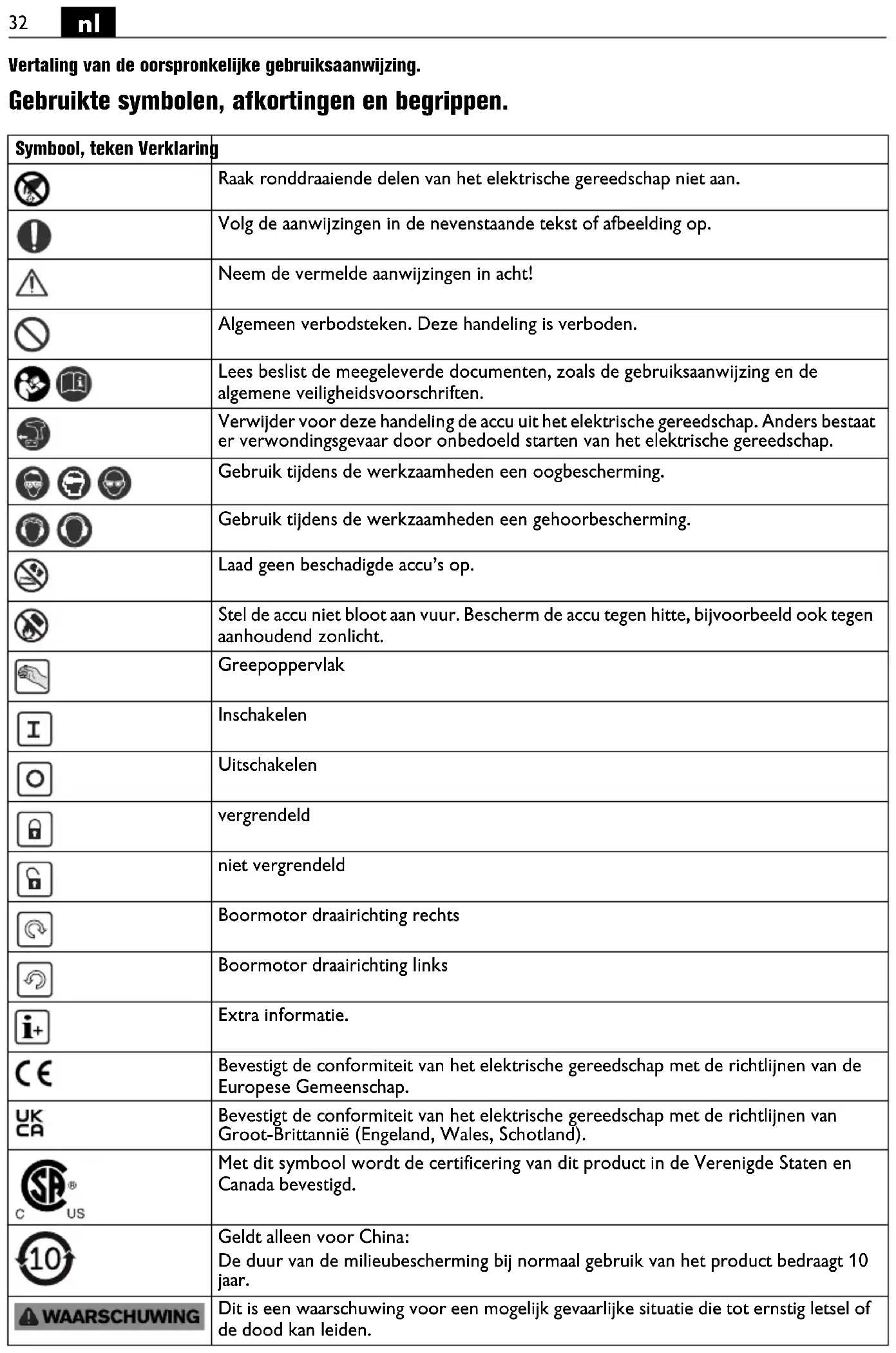 Vertaling van de oorspronkelijke gebruiksaanwijzing. Gebruikte symbolen, afkortingen en begrippen. Symbool, teken Verklaring Raak ronddraaiende delen van het elektrische gereedschap niet aan. Volg de aanwijzingen in de nevenstaande tekst of afbeelding op. Neem de vermelde aanwijzingen in acht! Algemeen verbodsteken. Deze handeling is verboden. Lees beslist de meegeleverde documenten, zoals de gebruiksaanwijzing en de algemene veiligheidsvoorschriften. Verwijder voor deze handeling de accu uit het elektrische gereedschap. Anders bestaat er verwondingsgevaar door onbedoeld starten van het elektrische gereedschap. Gebruik tijdens de werkzaamheden een oogbescherming. Gebruik tijdens de werkzaamheden een gehoorbescherming. Laad geen beschadigde accu’s op. Stel de accu niet bloot aan vuur. Bescherm de accu tegen hitte, bijvoorbeeld ook tegen aanhoudend zonlicht. Greepoppervlak Inschakelen Uitschakelen vergrendeld niet vergrendeld Boormotor draairichting rechts Boormotor draairichting links Extra informatie. Bevestigt de conformiteit van het elektrische gereedschap met de richtlijnen van de Europese Gemeenschap. Bevestigt de conformiteit van het elektrische gereedschap met de richtlijnen van Groot-Brittannië (Engeland, Wales, Schotland). Met dit symbool wordt de certificering van dit product in de Verenigde Staten en Canada bevestigd. Geldt alleen voor China: De duur van de milieubescherming bij normaal gebruik van het product bedraagt 10 jaar. Dit is een waarschuwing voor een mogelijk gevaarlijke situatie die tot ernstig letsel of de dood kan leiden.33