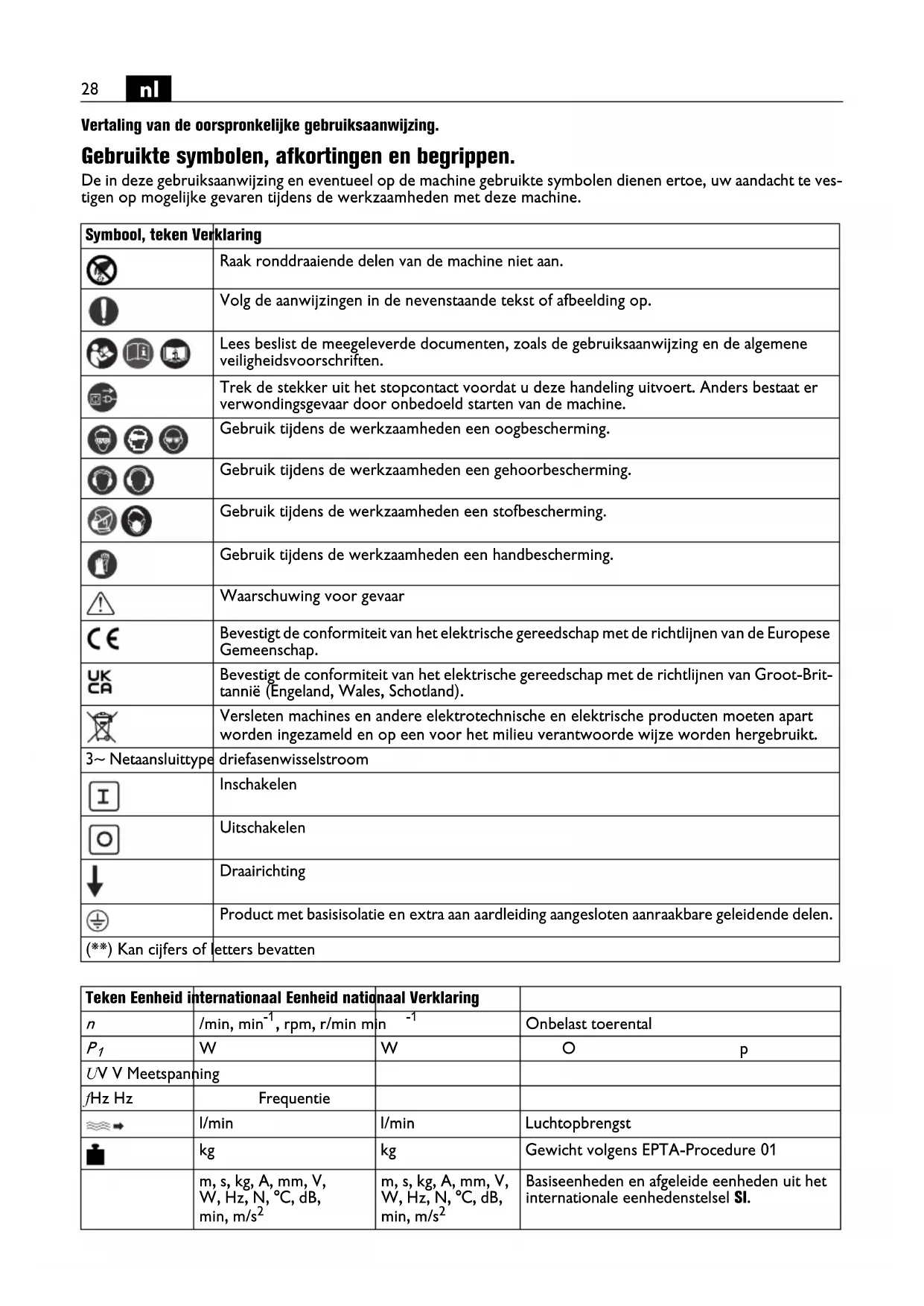 Vertaling van de oorspronkelijke gebruiksaanwijzing. Gebruikte symbolen, afkortingen en begrippen. De in deze gebruiksaanwijzing en eventueel op de machine gebruikte symbolen dienen ertoe, uw aandacht te ves- tigen op mogelijke gevaren tijdens de werkzaamheden met deze machine. Symbool, teken Verklaring Raak ronddraaiende delen van de machine niet aan. Volg de aanwijzingen in de nevenstaande tekst of afbeelding op. Lees beslist de meegeleverde documenten, zoals de gebruiksaanwijzing en de algemene veiligheidsvoorschriften. Trek de stekker uit het stopcontact voordat u deze handeling uitvoert. Anders bestaat er verwondingsgevaar door onbedoeld starten van de machine. Gebruik tijdens de werkzaamheden een oogbescherming. Gebruik tijdens de werkzaamheden een gehoorbescherming. Gebruik tijdens de werkzaamheden een stofbescherming. Gebruik tijdens de werkzaamheden een handbescherming. Waarschuwing voor gevaar Bevestigt de conformiteit van het elektrische gereedschap met de richtlijnen van de Europese Gemeenschap. Bevestigt de conformiteit van het elektrische gereedschap met de richtlijnen van Groot-Brit- tannië (Engeland, Wales, Schotland). Versleten machines en andere elektrotechnische en elektrische producten moeten apart worden ingezameld en op een voor het milieu verantwoorde wijze worden hergebruikt. 3~ Netaansluittype driefasenwisselstroom Inschakelen Uitschakelen Draairichting Product met basisisolatie en extra aan aardleiding aangesloten aanraakbare geleidende delen. (**) Kan cijfers of letters bevatten Teken Eenheid internationaal Eenheid nationaal Verklaring