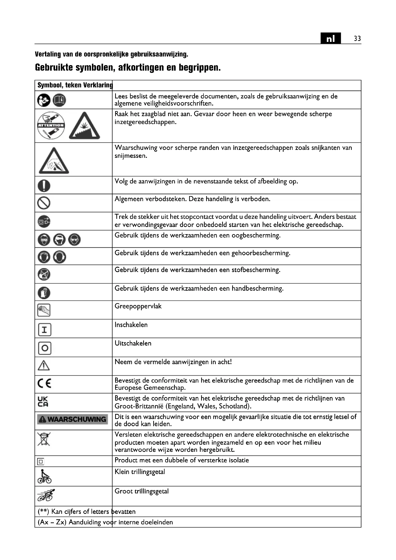 Vertaling van de oorspronkelijke gebruiksaanwijzing. Gebruikte symbolen, afkortingen en begrippen. Symbool, teken Verklaring Lees beslist de meegeleverde documenten, zoals de gebruiksaanwijzing en de algemene veiligheidsvoorschriften. Raak het zaagblad niet aan. Gevaar door heen en weer bewegende scherpe inzetgereedschappen. Waarschuwing voor scherpe randen van inzetgereedschappen zoals snijkanten van snijmessen. Volg de aanwijzingen in de nevenstaande tekst of afbeelding op. Algemeen verbodsteken. Deze handeling is verboden. Trek de stekker uit het stopcontact voordat u deze handeling uitvoert. Anders bestaat er verwondingsgevaar door onbedoeld starten van het elektrische gereedschap. Gebruik tijdens de werkzaamheden een oogbescherming. Gebruik tijdens de werkzaamheden een gehoorbescherming. Gebruik tijdens de werkzaamheden een stofbescherming. Gebruik tijdens de werkzaamheden een handbescherming. Greepoppervlak Inschakelen Uitschakelen Neem de vermelde aanwijzingen in acht! Bevestigt de conformiteit van het elektrische gereedschap met de richtlijnen van de Europese Gemeenschap. Bevestigt de conformiteit van het elektrische gereedschap met de richtlijnen van Groot-Brittannië (Engeland, Wales, Schotland). Dit is een waarschuwing voor een mogelijk gevaarlijke situatie die tot ernstig letsel of de dood kan leiden. Versleten elektrische gereedschappen en andere elektrotechnische en elektrische producten moeten apart worden ingezameld en op een voor het milieu verantwoorde wijze worden hergebruikt. Product met een dubbele of versterkte isolatie Klein trillingsgetal Groot trillingsgetal (**) Kan cijfers of letters bevatten (Ax – Zx) Aanduiding voor interne doeleinden34