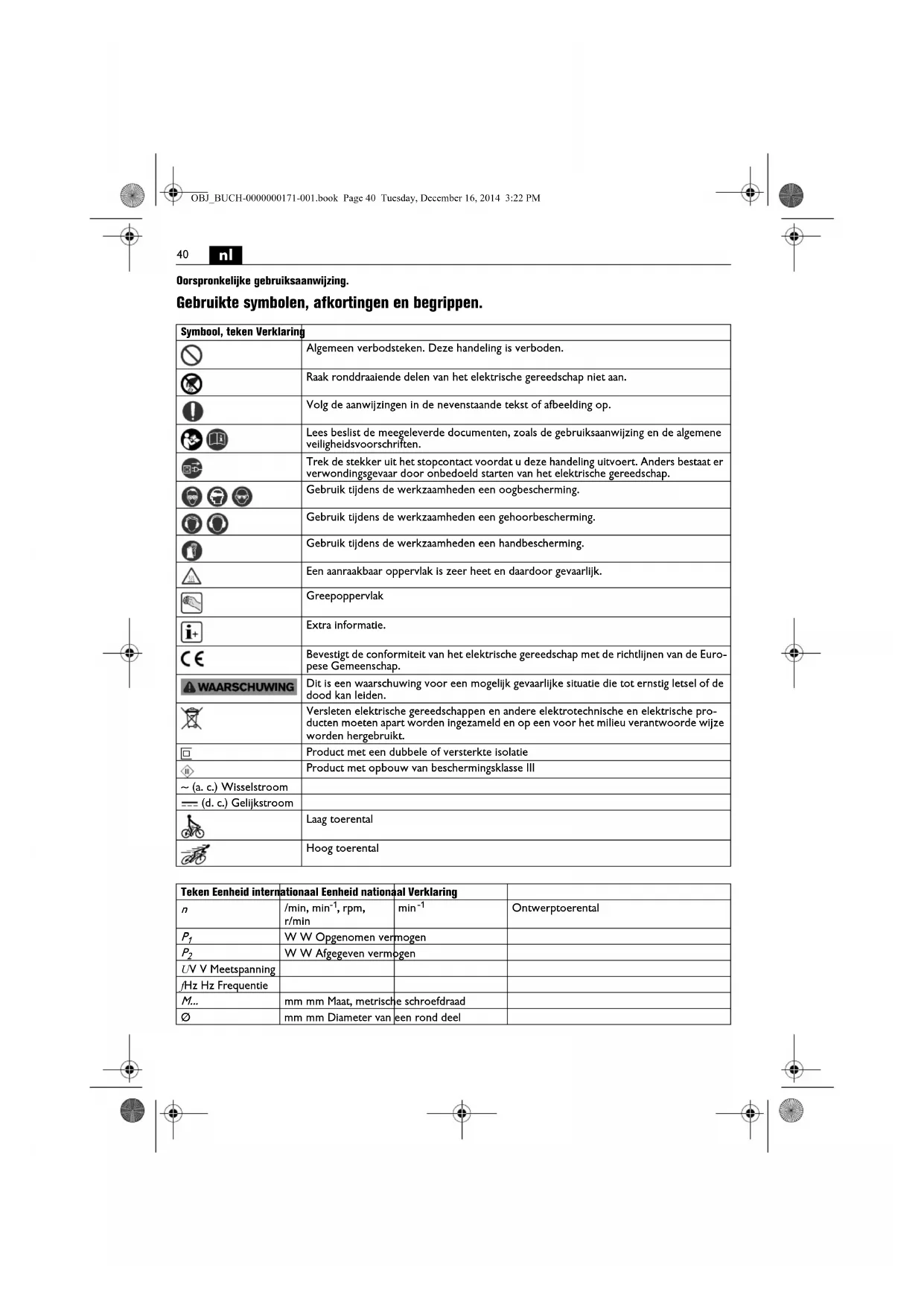 Oorspronkelijke gebruiksaanwijzing. Gebruikte symbolen, afkortingen en begrippen. Symbool, teken Verklaring Algemeen verbodsteken. Deze handeling is verboden. Raak ronddraaiende delen van het elektrische gereedschap niet aan. Volg de aanwijzingen in de nevenstaande tekst of afbeelding op. Lees beslist de meegeleverde documenten, zoals de gebruiksaanwijzing en de algemene veiligheidsvoorschriften. Trek de stekker uit het stopcontact voordat u deze handeling uitvoert. Anders bestaat er verwondingsgevaar door onbedoeld starten van het elektrische gereedschap. Gebruik tijdens de werkzaamheden een oogbescherming. Gebruik tijdens de werkzaamheden een gehoorbescherming. Gebruik tijdens de werkzaamheden een handbescherming. Een aanraakbaar oppervlak is zeer heet en daardoor gevaarlijk. Greepoppervlak Extra informatie. Bevestigt de conformiteit van het elektrische gereedschap met de richtlijnen van de Euro- pese Gemeenschap. Dit is een waarschuwing voor een mogelijk gevaarlijke situatie die tot ernstig letsel of de dood kan leiden. Versleten elektrische gereedschappen en andere elektrotechnische en elektrische pro- ducten moeten apart worden ingezameld en op een voor het milieu verantwoorde wijze worden hergebruikt. Product met een dubbele of versterkte isolatie Product met opbouw van beschermingsklasse III ~ (a. c.) Wisselstroom (d. c.) Gelijkstroom Laag toerental Hoog toerental Teken Eenheid internationaal Eenheid nationaal Verklaring