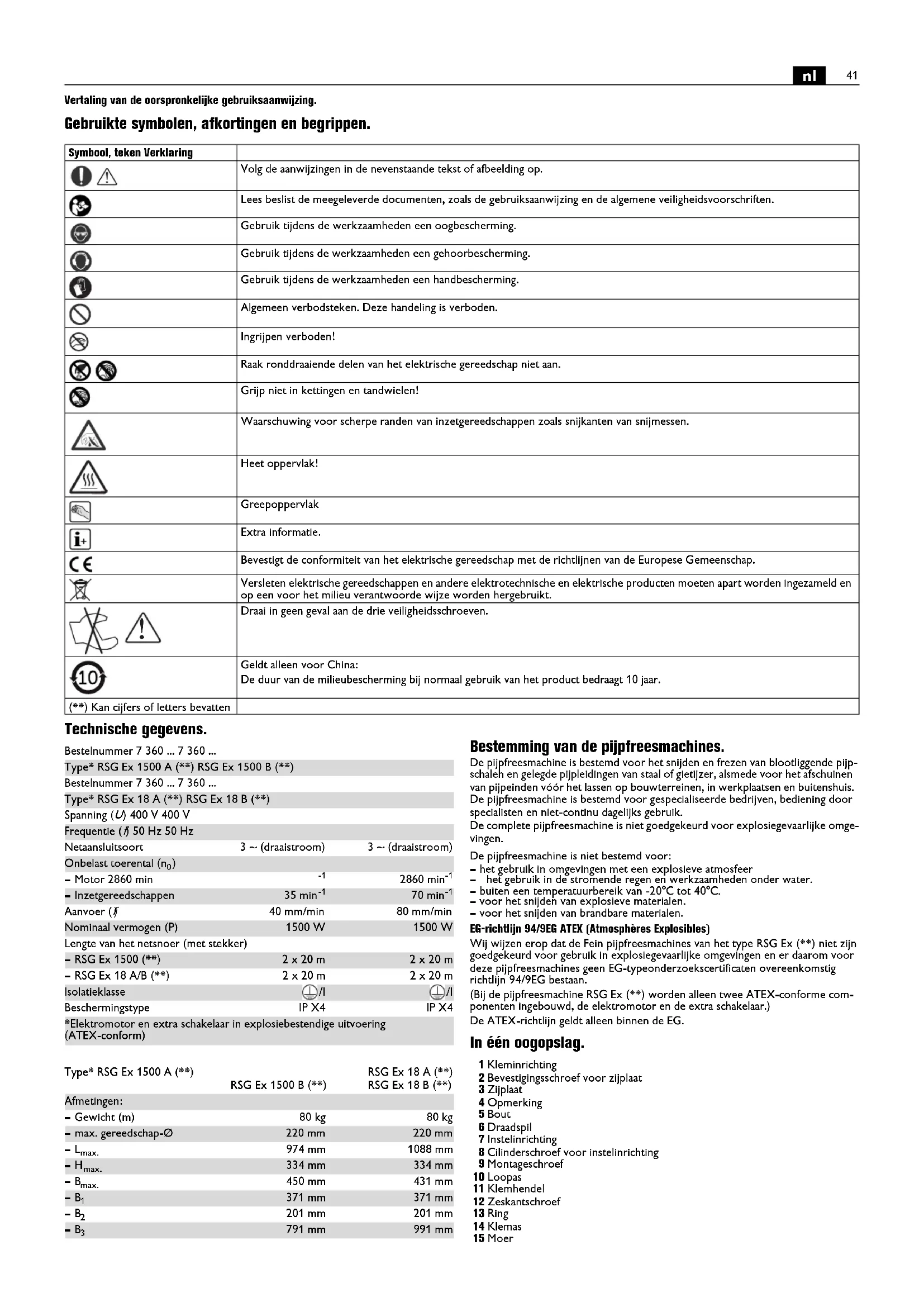 Wij wijzen erop dat de Fein pijpfreesmachines van het type RSG Ex (^**) Niet zich goedgekeurd voor gebruik In explosiegevaarlijke omgevingen en er daaramoor voor deze pijpfreesmachines geen EG-typeonderzoekscertificaten overeenkomstig richtlijn 94/9EG bestaan.