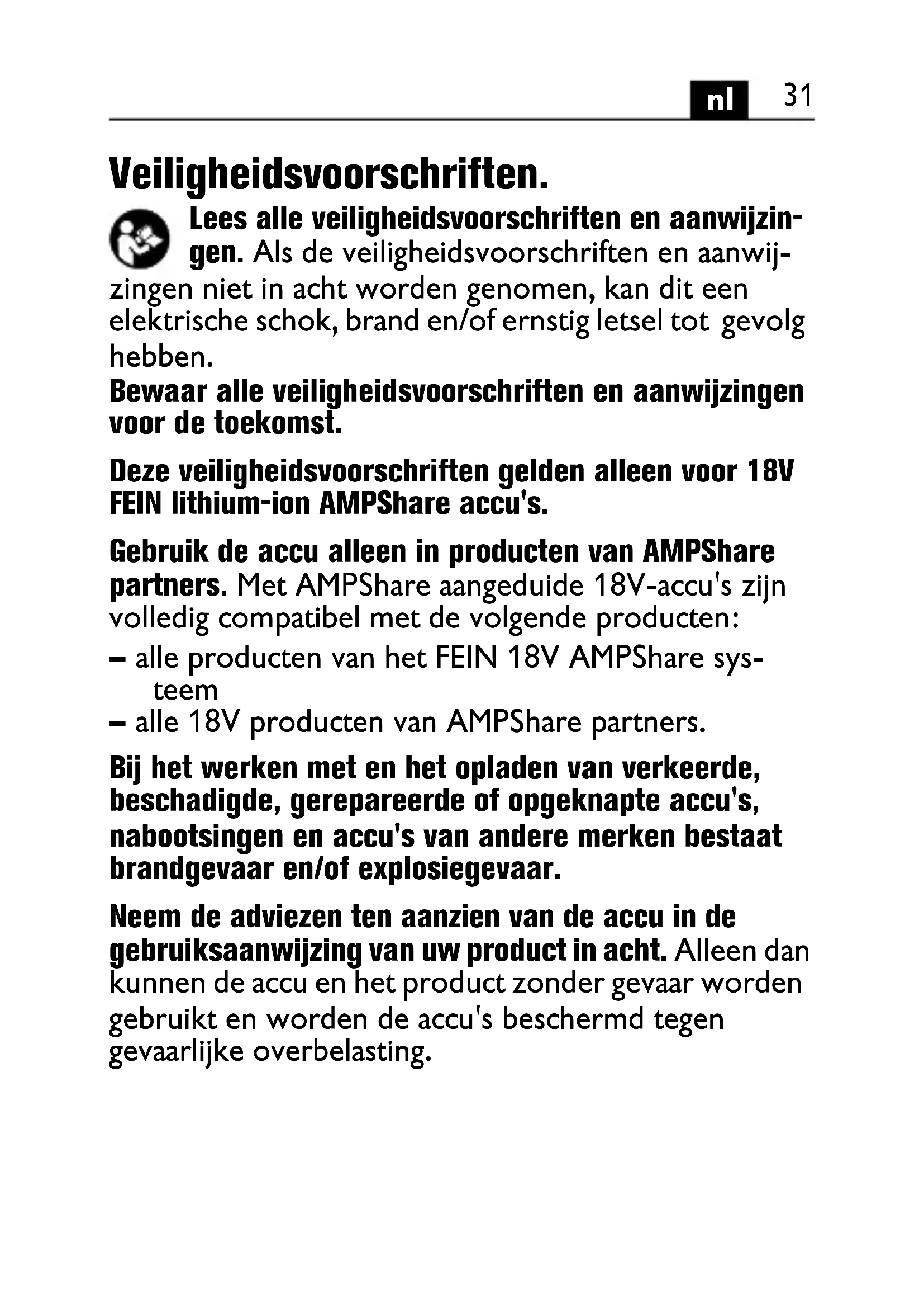 Veiligheidsvoorschriften. Lees alle veiligheidsvoorschriften en aanwijzin- gen. Als de veiligheidsvoorschriften en aanwij- zingen niet in acht worden genomen, kan dit een elektrische schok, brand en/of ernstig letsel tot gevolg hebben. Bewaar alle veiligheidsvoorschriften en aanwijzingen voor de toekomst. Deze veiligheidsvoorschriften gelden alleen voor 18V FEIN lithium-ion AMPShare accu's. Gebruik de accu alleen in producten van AMPShare partners. Met AMPShare aangeduide 18V-accu's zijn volledig compatibel met de volgende producten: – alle producten van het FEIN 18V AMPShare sys- teem – alle 18V producten van AMPShare partners. Bij het werken met en het opladen van verkeerde, beschadigde, gerepareerde of opgeknapte accu's, nabootsingen en accu's van andere merken bestaat brandgevaar en/of explosiegevaar. Neem de adviezen ten aanzien van de accu in de gebruiksaanwijzing van uw product in acht. Alleen dan kunnen de accu en het product zonder gevaar worden gebruikt en worden de accu's beschermd tegen gevaarlijke overbelasting.32