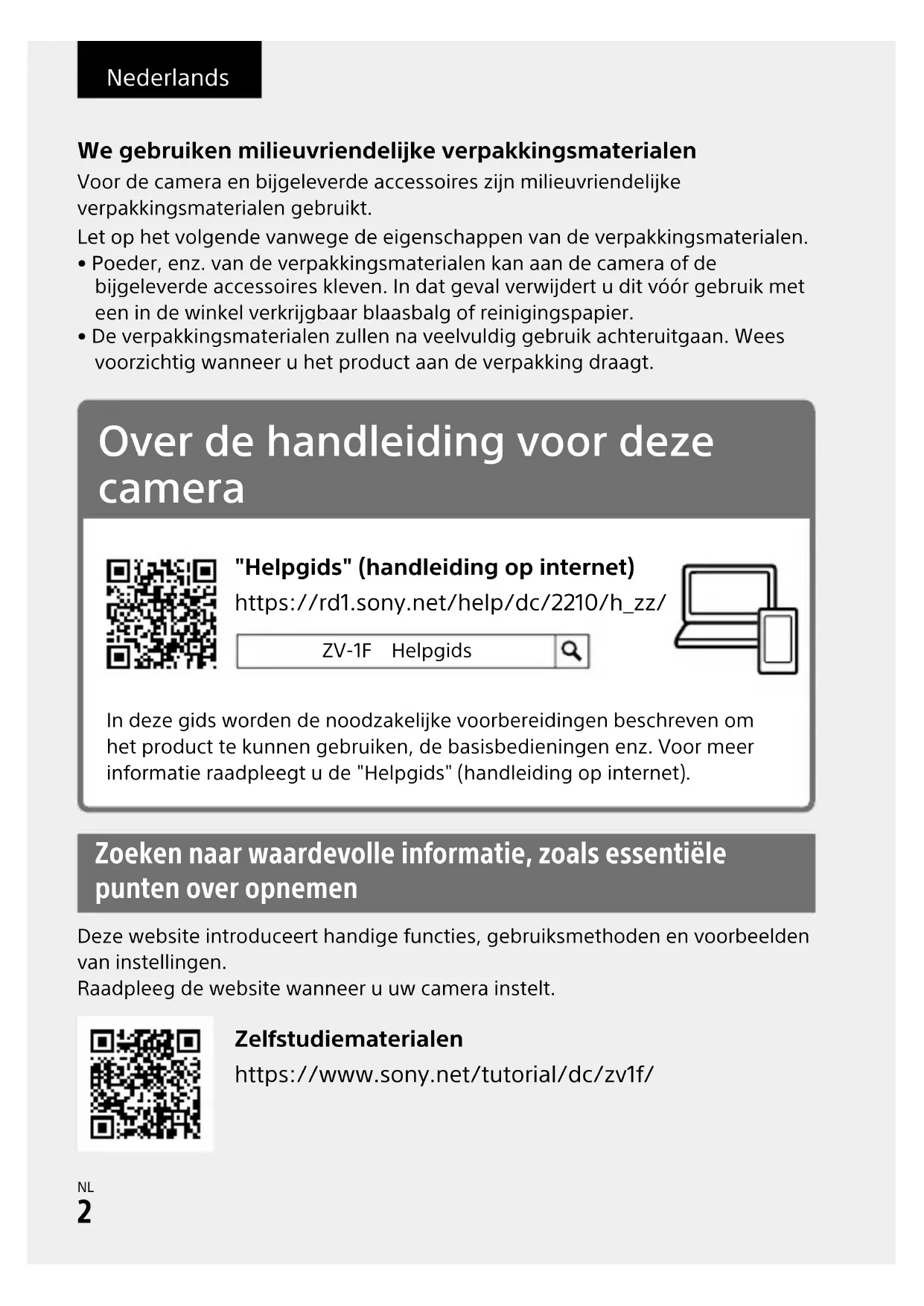 \\win-473\CAMERA\CX64700(YT)_SG\Multi\04_Compose\5041855311_17lang_STT\5041855311ZV1FCE3\07NL-ZV1FCE3\07NL.indd DTP data saved: 2022/07/06 12:47 PDF file created: 2022/07/06 12:48 Nederlands We gebruiken milieuvriendelijke verpakkingsmaterialen Voor de camera en bijgeleverde accessoires zijn milieuvriendelijke verpakkingsmaterialen gebruikt.Let op het volgende vanwege de eigenschappen van de verpakkingsmaterialen.• Poeder, enz. van de verpakkingsmaterialen kan aan de camera of de bijgeleverde accessoires kleven. In dat geval verwijdert u dit vóór gebruik met een in de winkel verkrijgbaar blaasbalg of reinigingspapier.• De verpakkingsmaterialen zullen na veelvuldig gebruik achteruitgaan. Wees voorzichtig wanneer u het product aan de verpakking draagt. Over de handleiding voor deze camera https://rd1.sony.net/help/dc/2210/h_zz/ "Helpgids" (handleiding op internet) ZV-1F HelpgidsIn deze gids worden de noodzakelijke voorbereidingen beschreven om het product te kunnen gebruiken, de basisbedieningen enz. Voor meer informatie raadpleegt u de "Helpgids" (handleiding op internet). Zoeken naar waardevolle informatie, zoals essentiële punten over opnemen Deze website introduceert handige functies, gebruiksmethoden en voorbeelden van instellingen.Raadpleeg de website wanneer u uw camera instelt. https://www.sony.net/tutorial/dc/zv1f/ ZelfstudiematerialenZV-1F 5-041-855-31(1)
