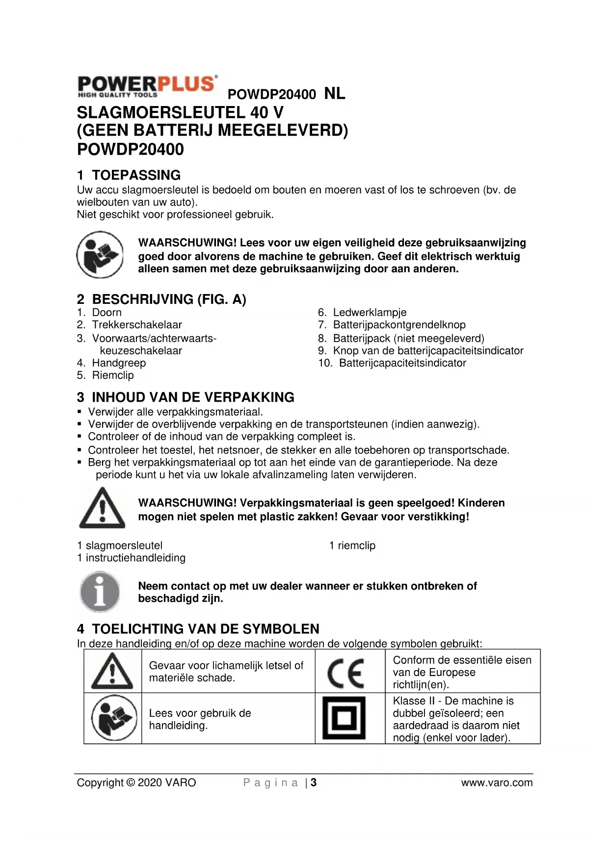 Klasse II - De machine is dubbel geïsoleerd; een aardedraad is daarom niet nodig (enkel voor lader).POWDP20400 NL Copyright © 2020 VARO P a g i n a | 4 www.varo.com