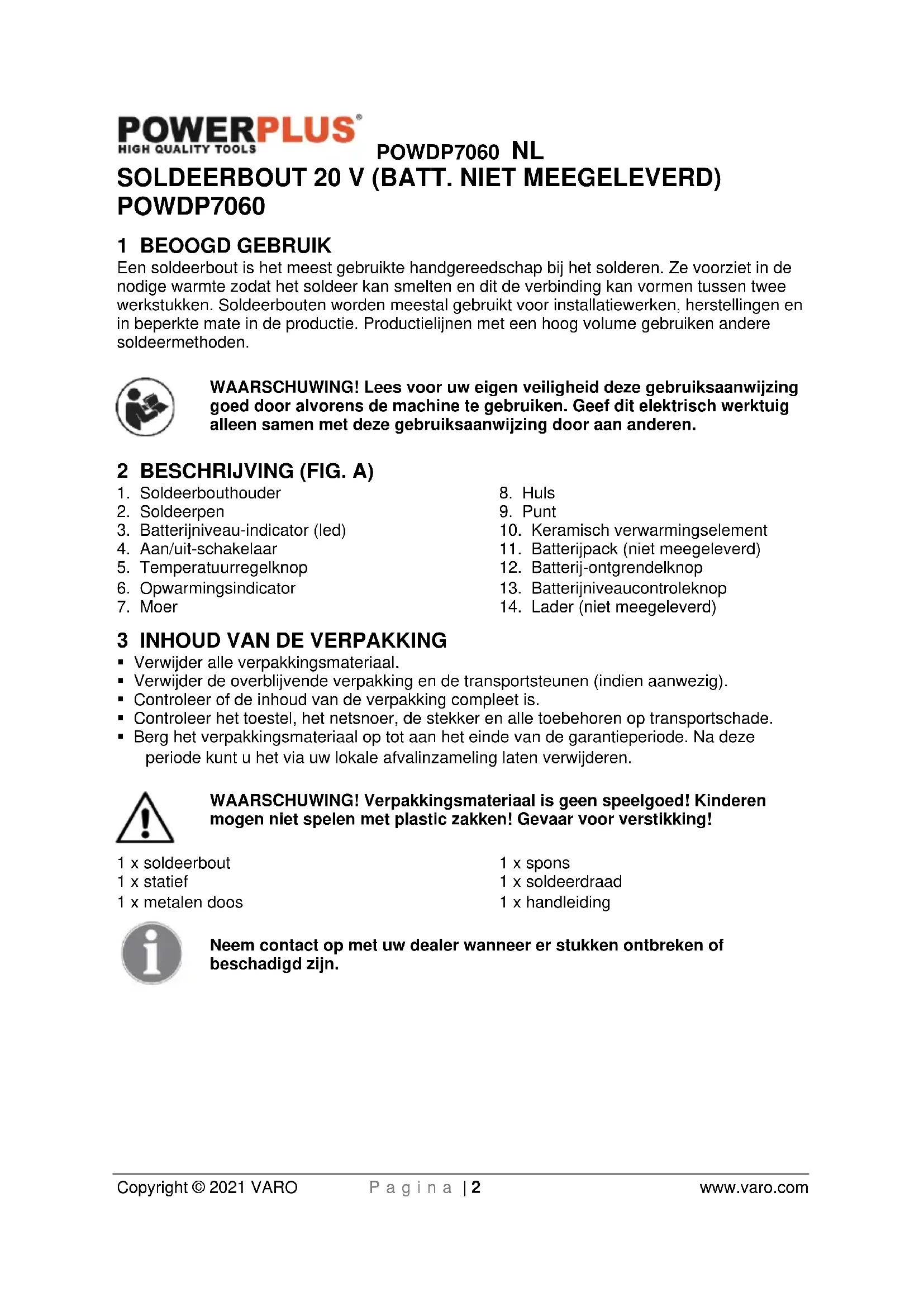 - Berg het verpakkingsmateriaal op tot aan het einde van de garantieperiode. Na deze periode kunt u het via uw lokale afvalinzameling laten verwijderen. WAARSCHUWING! Verpakkingsmateriaal is geen speelgoed! Kinderen mogen niet spelen met plastic zakken! Gevaar voor verstikking! 1 x soldeerbout 1 x statief 1 x metalen doos 1 x spons 1 x soldeerdraad 1 x handleiding Neem contact op met uw dealer wanneer er stukken ontbreken of beschadigd zijn.POWDP7060 NL Copyright © 2021 VARO P a g i n a | 3 www.varo.com