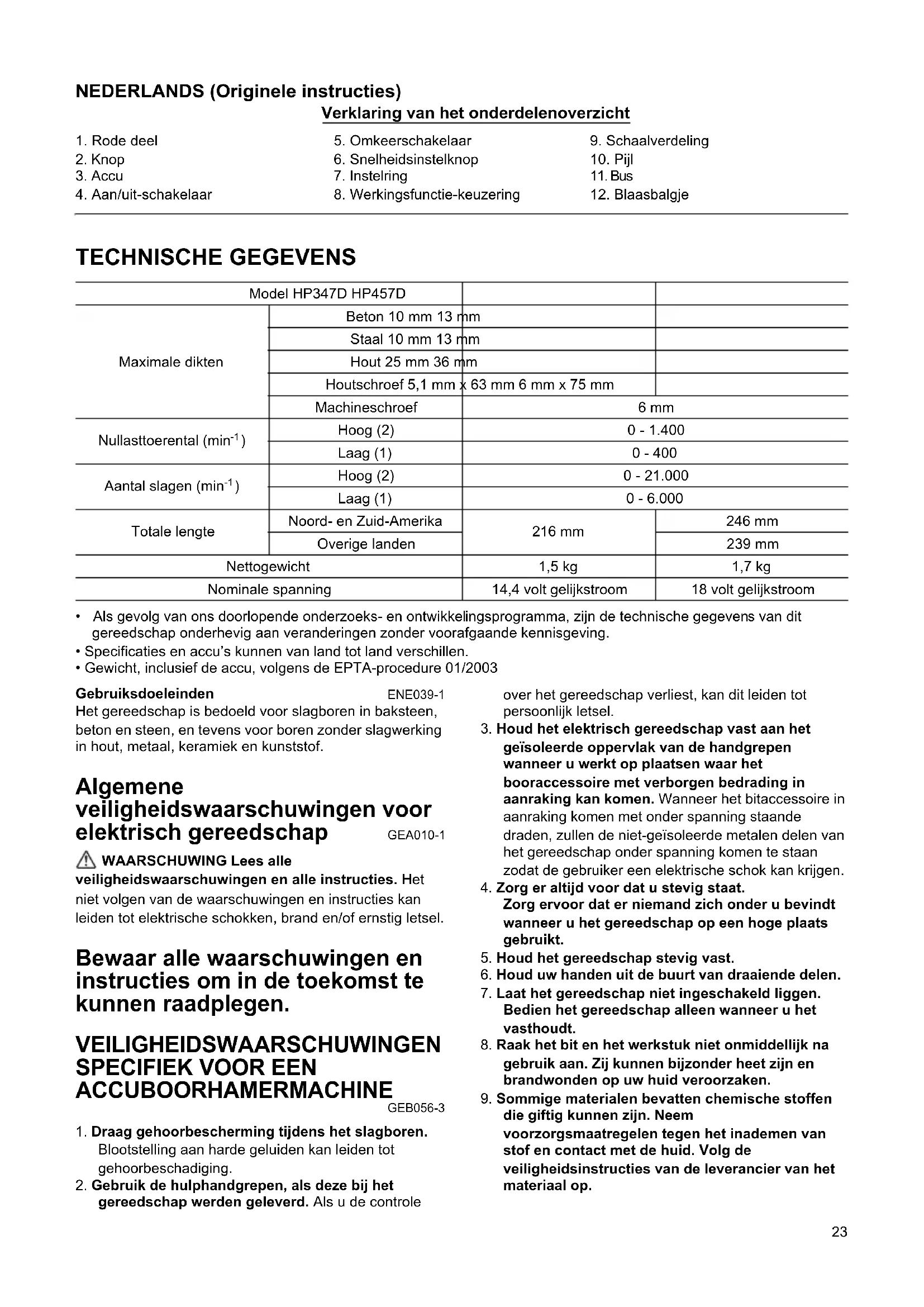 - Gewicht, inclusief de accu, volgens de EPTA-procedure 01/2003 Gebruiksdoeleinden ENE039-1 Het gereedschap is bedoeld voor slagboren in baksteen, beton en steen, en tevens voor boren zonder slagwerking in hout, metaal, keramiek en kunststof. Algemene veiligheidswaarschuwingen voor elektrisch gereedschap GEA010-1 WAARSCHUWING Lees alle veiligheidswaarschuwingen en alle instructies. Het niet volgen van de waarschuwingen en instructies kan leiden tot elektrische schokken, brand en/of ernstig letsel. Bewaar alle waarschuwingen en instructies om in de toekomst te kunnen raadplegen. VEILIGHEIDSWAARSCHUWINGEN