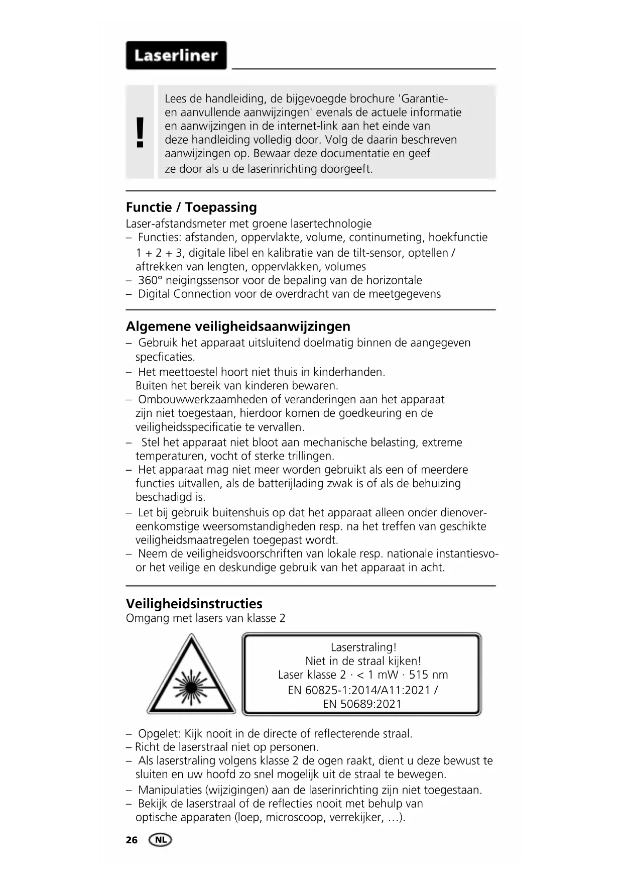 EU and UK directives and disposal This device complies with all necessary standards for the free movement of goods within the EU and the UK. This product, including accessories and packaging, is an electrical appliance that must be recycled in an environmentally appropriate manner in accordance with European and UK directives on waste electrical and electronic equipment, batteries and packaging, in order to recover valuable raw materials. Electrical devices, batteries and packaging do not belong in household waste. Users are obliged by law to surrender used batteries or battery packs to a public collection point, to sales outlets, or to technical customer services, free of charge. Remove the battery from the device without damaging it using standard commercial tools: arrange separate collection before returning the device for disposal. Please do not hesitate to contact the UMAREX-LASERLINER service department if you have any queries regarding removing the battery. Look for information on local disposal facilities and note the relevant disposal and safety information at the collection points. Further safety and supplementary notices at: http://laserliner.com/info?an=AHE EN26 Algemene veiligheidsaanwijzingen – Gebruik het apparaat uitsluitend doelmatig binnen de aangegeven speccaties. – Het meettoestel hoort niet thuis in kinderhanden. Buiten het bereik van kinderen bewaren. – Ombouwwerkzaamheden of veranderingen aan het apparaat zijn niet toegestaan, hierdoor komen de goedkeuring en de veiligheidsspecicatie te vervallen. – Stel het apparaat niet bloot aan mechanische belasting, extreme temperaturen, vocht of sterke trillingen. – Het apparaat mag niet meer worden gebruikt als een of meerdere functies uitvallen, als de batterijlading zwak is of als de behuizing beschadigd is. – Let bij gebruik buitenshuis op dat het apparaat alleen onder dienover- eenkomstige weersomstandigheden resp. na het treffen van geschikte veiligheidsmaatregelen toegepast wordt. – Neem de veiligheidsvoorschriften van lokale resp. nationale instantiesvo- or het veilige en deskundige gebruik van het apparaat in acht. Veiligheidsinstructies Omgang met lasers van klasse 2 Laserstraling! Niet in de straal kijken! Laser klasse 2 · < 1 mW · 515 nm EN 60825-1:2014/A11:2021 / EN 50689:2021 Functie / Toepassing Laser-afstandsmeter met groene lasertechnologie – Functies: afstanden, oppervlakte, volume, continumeting, hoekfunctie 1 + 2 + 3, digitale libel en kalibratie van de tilt-sensor, optellen / aftrekken van lengten, oppervlakken, volumes – 360° neigingssensor voor de bepaling van de horizontale – Digital Connection voor de overdracht van de meetgegevens Lees de handleiding, de bijgevoegde brochure 'Garantie- en aanvullende aanwijzingen' evenals de actuele informatie en aanwijzingen in de internet-link aan het einde van deze handleiding volledig door. Volg de daarin beschreven aanwijzingen op. Bewaar deze documentatie en geef ze door als u de laserinrichting doorgeeft.