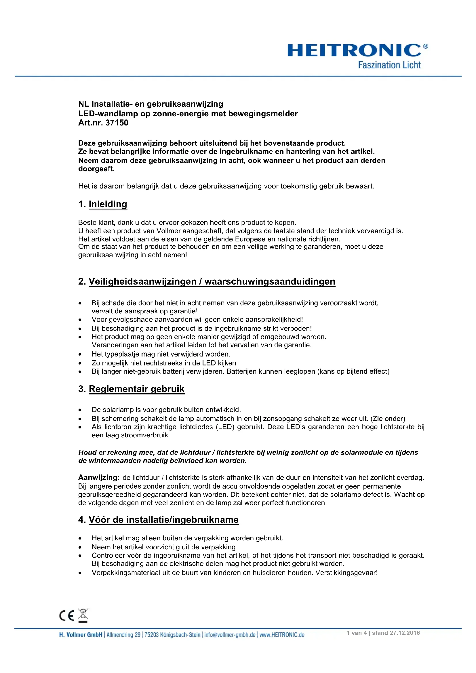 protec- tion 37150 1x accumulateur Li-Ion, 7,4 V Ampoule LED, non remplaçable IP 54 III1 van 4 | stand 27.12.2016 NL Installatie- en gebruiksaanwijzing LED-wandlamp op zonne-energie met bewegingsmelder Art.nr. 37150 Deze gebruiksaanwijzing behoort uitsluitend bij het bovenstaande product. Ze bevat belangrijke informatie over de ingebruikname en hantering van het artikel. Neem daarom deze gebruiksaanwijzing in acht, ook wanneer u het product aan derden doorgeeft. Het is daarom belangrijk dat u deze gebruiksaanwijzing voor toekomstig gebruik bewaart.
