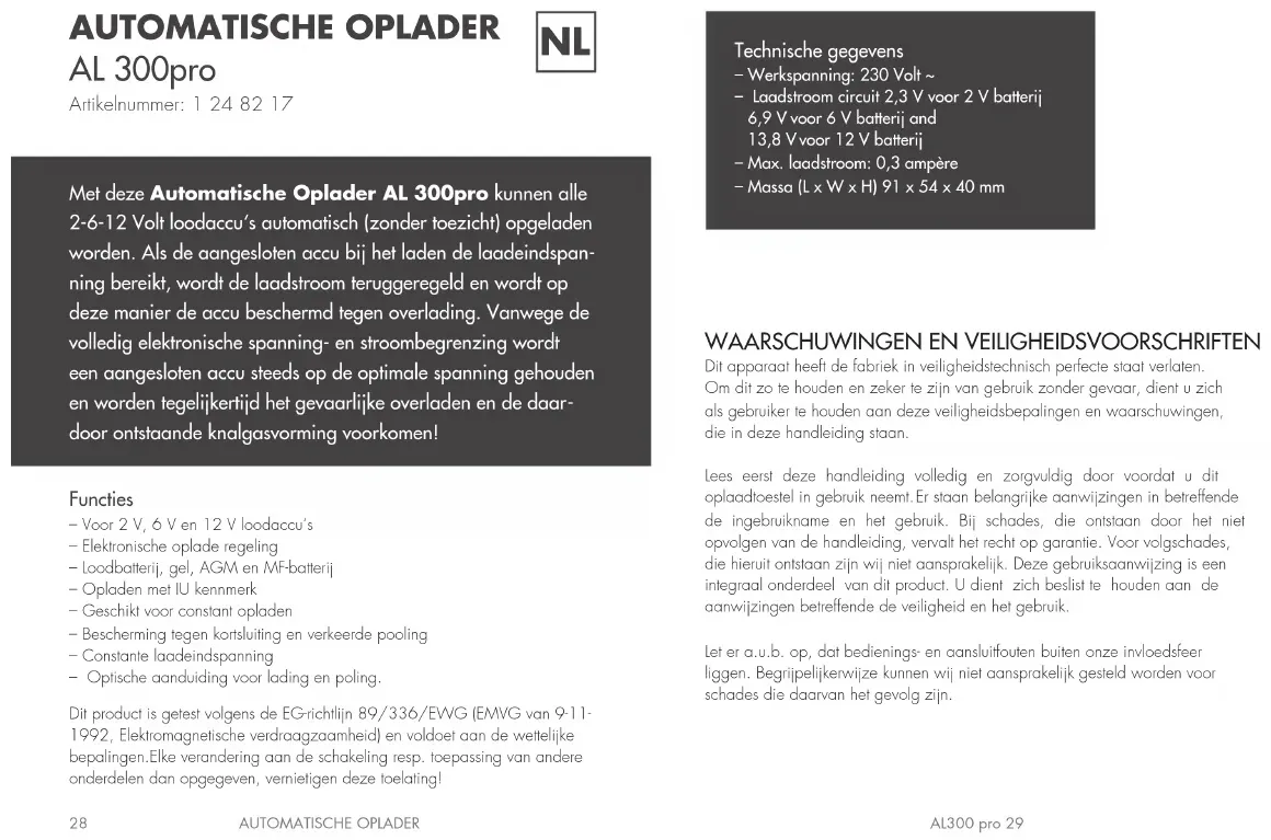 Technische gegevens – Werkspanning: 230 Volt ~ – Laadstroom circuit 2,3 V voor 2 V batterij 6,9 V voor 6 V batterij and 13,8 V voor 12 V batterij – Max. laadstroom: 0,3 ampère – Massa (L x W x H) 91 x 54 x 40 mm Dit product is getest volgens de EG-richtlijn 89/336/EWG (EMVG van 9-11-1992, Elektromagnetische verdraagzaamheid) en voldoet aan de wettelijkebepalingen.Elke verandering aan de schakeling resp. toepassing van andere onderdelen dan opgegeven, vernietigen deze toelating!30 AL300 pro 31 AUTOMATISCHE OPLADER