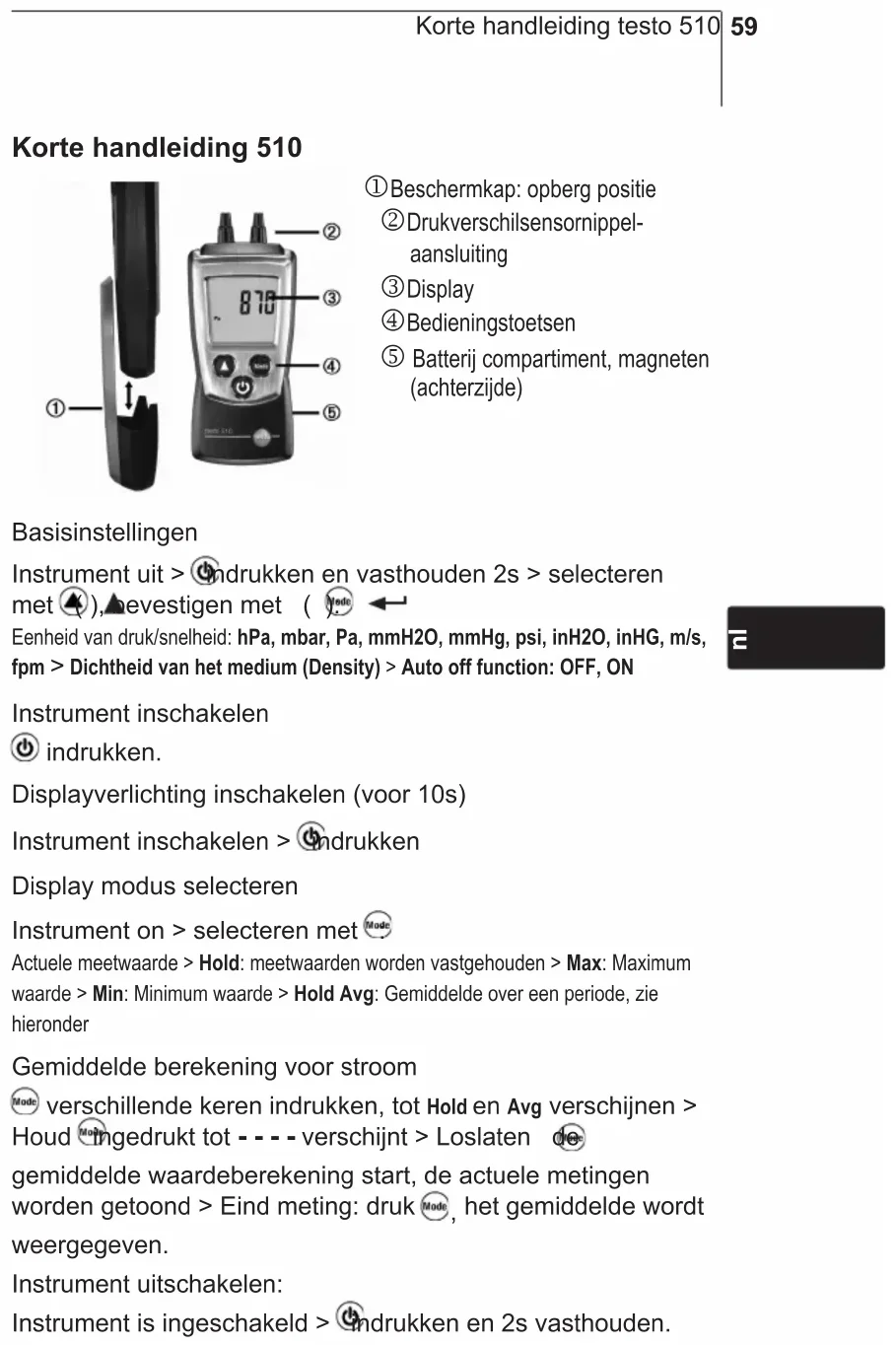 Korte handleiding 510 jBeschermkap: opberg positie k Drukverschilsensor nippel- aansluiting l Display mBedieningstoetsen n Batterij compartiment, magneten (achterzijde) Basisinstellingen Instrument uit > indrukken en vasthouden 2s > selecteren met ( ), bevestigen met ( ): Eenheid van druk/snelheid: hPa, mbar, Pa, mmH2O, mmHg, psi, inH2O, inHG, m/s, fpm > Dichtheid van het medium (Density) > Auto off function: OFF, ON Instrument inschakelen indrukken. Displayverlichting inschakelen (voor 10s) Instrument inschakelen > indrukken Display modus selecteren Instrument on > selecteren met : Actuele meetwaarde > Hold: meetwaarden worden vastgehouden > Max: Maximum waarde > Min: Minimum waarde > Hold Avg: Gemiddelde over een periode, zie hieronder Gemiddelde berekening voor stroom verschillende keren indrukken, tot Hold en Avg verschijnen > Houd ingedrukt tot - - - - verschijnt > Loslaten de gemiddelde waardeberekening start, de actuele metingen worden getoond > Eind meting: druk