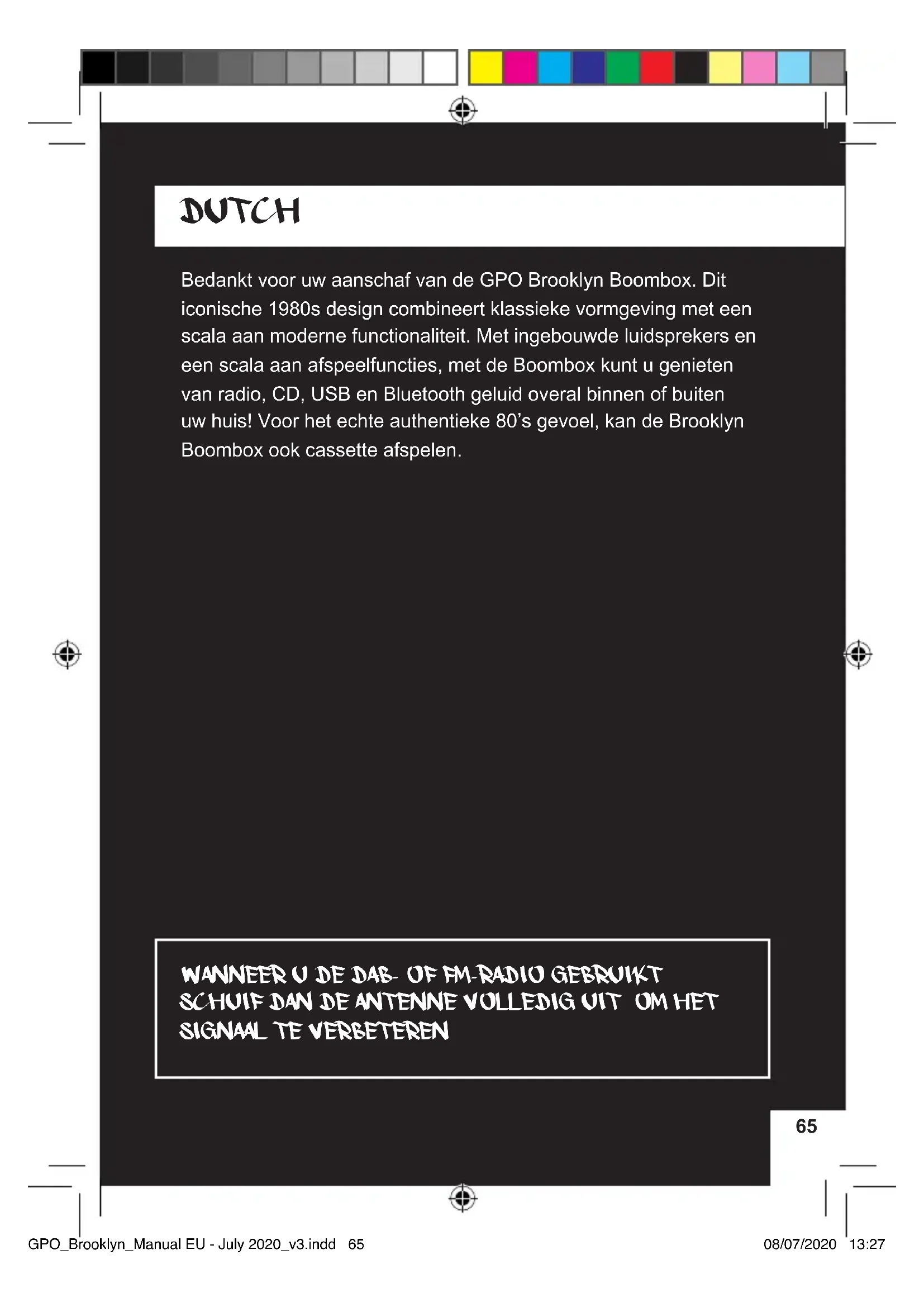 volume du microphone GPO_Brooklyn_Manual EU - July 2020_v3.indd 62GPO_Brooklyn_Manual EU - July 2020_v3.indd 62 08/07/2020 13:2708/07/2020 13:2763 En cas de problämes L’appareil ne s’allume pas Assurez-vous que l’appareil est complètement chargé et que l’indicateur de chargement est bleu Si ce n’est pas le cas, veuillez charger le dispositif avec le câble de chargement fourni. Si votre batterie ne se charge pas, contactez GPO Retro directement pour obtenir un remplacement ainsi que des instructions. NE PAS ouvrir le compartiment batterie sans nous consulter préalablement Le CD ne fonctionne pas Si vous recevez un message d’erreur de lecture du CD, il se peut que vous ayez inséré le CD dans le mauvais sens. Éjectez le CD et retournez-le de manière à ce que le côté de l’étiquette soit dirigé vers l’arrière de l’appareil. Je n’arrive pas à contrôler la musique sur l’appareil Si vous utilisez une fonction Bluetooth, la lecture doit être contrôlée depuis le dispositif apparié. La lecture CD et USB peut être contrôlée depuis le panneau de commande principal au-dessus de la fente cassette, et la lecture cassette depuis le panneau de commande cassette au-dessous de la fente cassette. Je ne trouve pas l’appareil avec Bluetooth Lorsqu’un dispositif est déjà apparié à l’appareil et se trouve à portée de connexion, le dispositif peut ne pas apparaître sur les balayages Bluetooth ultérieurs. Essayez de désapparier tout autre dispositif et réessayez. Avez-vous besoin d’aide ? Visit www.gporetro.com GPO_Brooklyn_Manual EU - July 2020_v3.indd 63GPO_Brooklyn_Manual EU - July 2020_v3.indd 63 08/07/2020 13:2708/07/2020 13:2764 GPO_Brooklyn_Manual EU - July 2020_v3.indd 64GPO_Brooklyn_Manual EU - July 2020_v3.indd 64 08/07/2020 13:2708/07/2020 13:276565 DUTCH Bedankt voor uw aanschaf van de GPO Brooklyn Boombox. Dit iconische 1980s design combineert klassieke vormgeving met een scala aan moderne functionaliteit. Met ingebouwde luidsprekers en een scala aan afspeelfuncties, met de Boombox kunt u genieten van radio, CD, USB en Bluetooth geluid overal binnen of buiten uw huis! Voor het echte authentieke 80’s gevoel, kan de Brooklyn Boombox ook cassette afspelen. Wanneer u de DAB- of FM-radio gebruikt schuif dan de antenne volledig uit om het signaal te verbeteren GPO_Brooklyn_Manual EU - July 2020_v3.indd 65GPO_Brooklyn_Manual EU - July 2020_v3.indd 65 08/07/2020 13:2708/07/2020 13:2766 Aan de slag met je GPO Brooklyn Verwijder het apparaat uit de verpakking en plaats het op een vlakke, stabiele ondergrond. 1 – UK & EU 2 – UK 3 – EU Lokaliseer de 3 stukken kabel die samen de voedingskabel vormen. Als u denkt dat u een van deze stukken mist, controleer dan de verpak- king opnieuw, omdat ze soms in het polystyreen vast komen te zitten. Identiceer het stuk dat in uw plaats in de stopcontacten past (2 of 3) en sluit dat aan op de transformator (1). Controleer of de batterij al is geïnstalleerd door het deksel van het batterijvak aan de achterkant van het apparaat te openen. Zo niet, zie dan het installeren van een batterij in uw Brooklyn hieronder. GPO_Brooklyn_Manual EU - July 2020_v3.indd 66GPO_Brooklyn_Manual EU - July 2020_v3.indd 66 08/07/2020 13:2708/07/2020 13:2767 Omdat de batterij tijdens het transport waarschijnlijk ontladen is, moet u beginnen met de stroomvoorziening, dus steek de stekker van het DC-gedeelte in de achterkant van de Brooklyn, bevestig de stekker in het stopcontact en schakel het apparaat in bij de muur. De LED-indica- tor moet rood zijn, om aan te geven dat uw batterij nu wordt opgeladen: UK EU Voor regelmatig gebruik raden wij u aan om ‘s nachts zo op te laden en uw Brooklyn overdag op de batterij te gebruiken. Let op: Om de batterij optimaal op te laden is de DAB-radio tijdelijk uitgeschakeld terwijl de batterij minder dan 75% is opgeladen. Als u hem gedurende deze tijd gebruikt, kunt u aanzienlijke interferentie ondervinden. GPO_Brooklyn_Manual EU - July 2020_v3.indd 67GPO_Brooklyn_Manual EU - July 2020_v3.indd 67 08/07/2020 13:2708/07/2020 13:2768 Gebruik van de LED-indicator De LED-indicator op de achterkant van uw Brooklyn vertelt u de laad- status: Geen licht - uw Brooklyn is niet aangesloten op het lichtnet; hij werkt op batterijvoeding. Houd er rekening mee dat wanneer het display knippert, uw batterijlading kritisch laag is. Rood - uw Brooklyn is op het lichtnet aangesloten; er is een batterij geïnsta lleerd en deze wordt opgeladen. Blauw met knipperend uw Brooklyn werkt op netstroom; er is geen rood licht - batterij geïnstalleerd. Blauw - uw Brooklyn is aangesloten op het lichtnet; er is een batterij geïnstalleerd en deze is volledig opgeladen. De batterij wordt voll- edig opgeladen, maar mag niet overladen worden