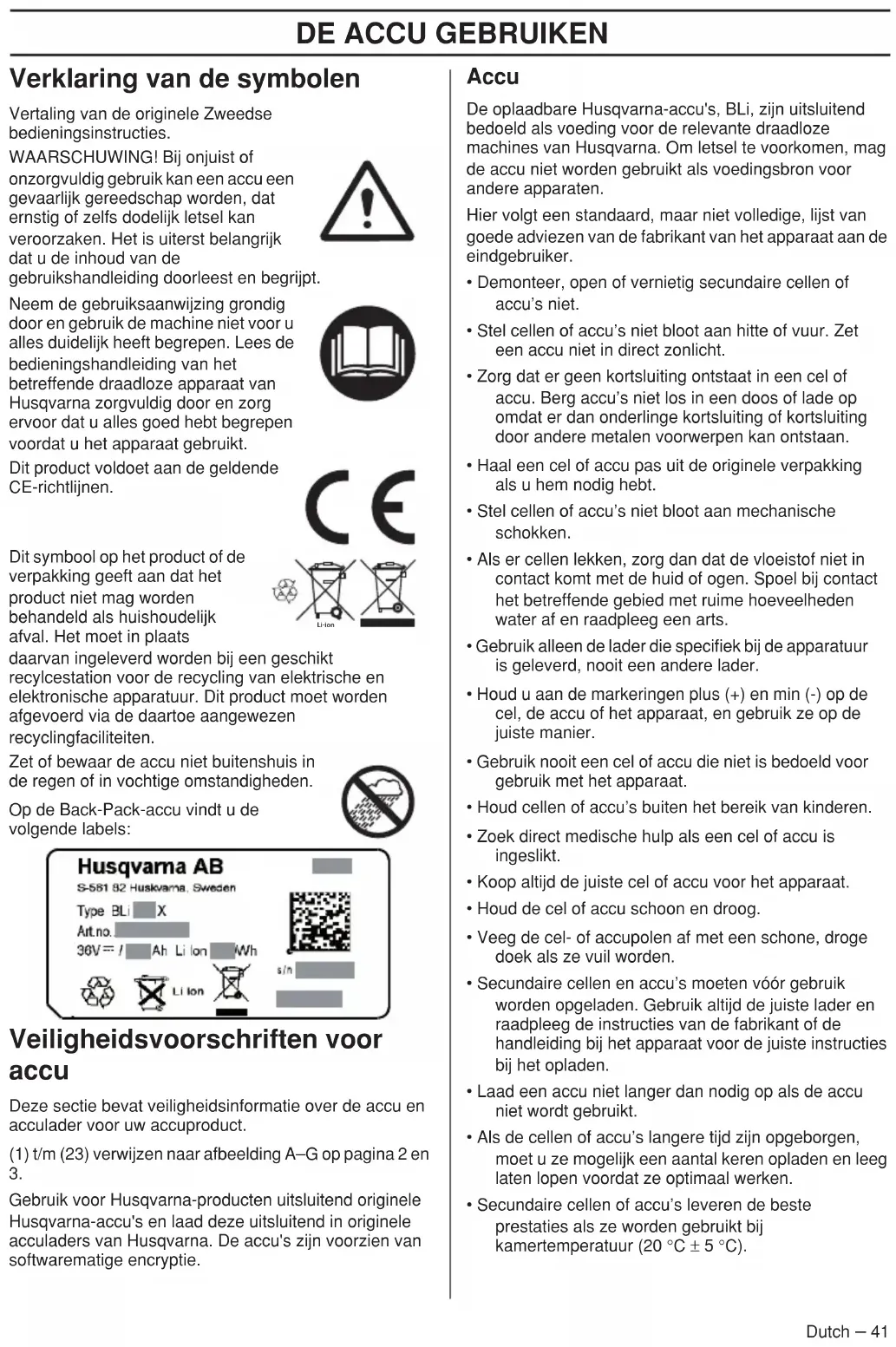 Dutch – 41 Verklaring van de symbolen Vertaling van de originele Zweedse bedieningsinstructies. WAARSCHUWING! Bij onjuist of onzorgvuldig gebruik kan een accu een gevaarlijk gereedschap worden, dat ernstig of zelfs dodelijk letsel kan veroorzaken. Het is uiterst belangrijk dat u de inhoud van de gebruikshandleiding doorleest en begrijpt. Neem de gebruiksaanwijzing grondig door en gebruik de machine niet voor u alles duidelijk heeft begrepen. Lees de bedieningshandleiding van het betreffende draadloze apparaat van Husqvarna zorgvuldig door en zorg ervoor dat u alles goed hebt begrepen voordat u het apparaat gebruikt. Dit product voldoet aan de geldende CE-richtlijnen. Dit symbool op het product of de verpakking geeft aan dat het product niet mag worden behandeld als huishoudelijk afval. Het moet in plaats daarvan ingeleverd worden bij een geschikt recylcestation voor de recycling van elektrische en elektronische apparatuur. Dit product moet worden afgevoerd via de daartoe aangewezen recyclingfaciliteiten. Zet of bewaar de accu niet buitenshuis in de regen of in vochtige omstandigheden. Op de Back-Pack-accu vindt u de volgende labels: Veiligheidsvoorschriften voor accu Deze sectie bevat veiligheidsinformatie over de accu en acculader voor uw accuproduct. (1) t/m (23) verwijzen naar afbeelding A–G op pagina 2 en