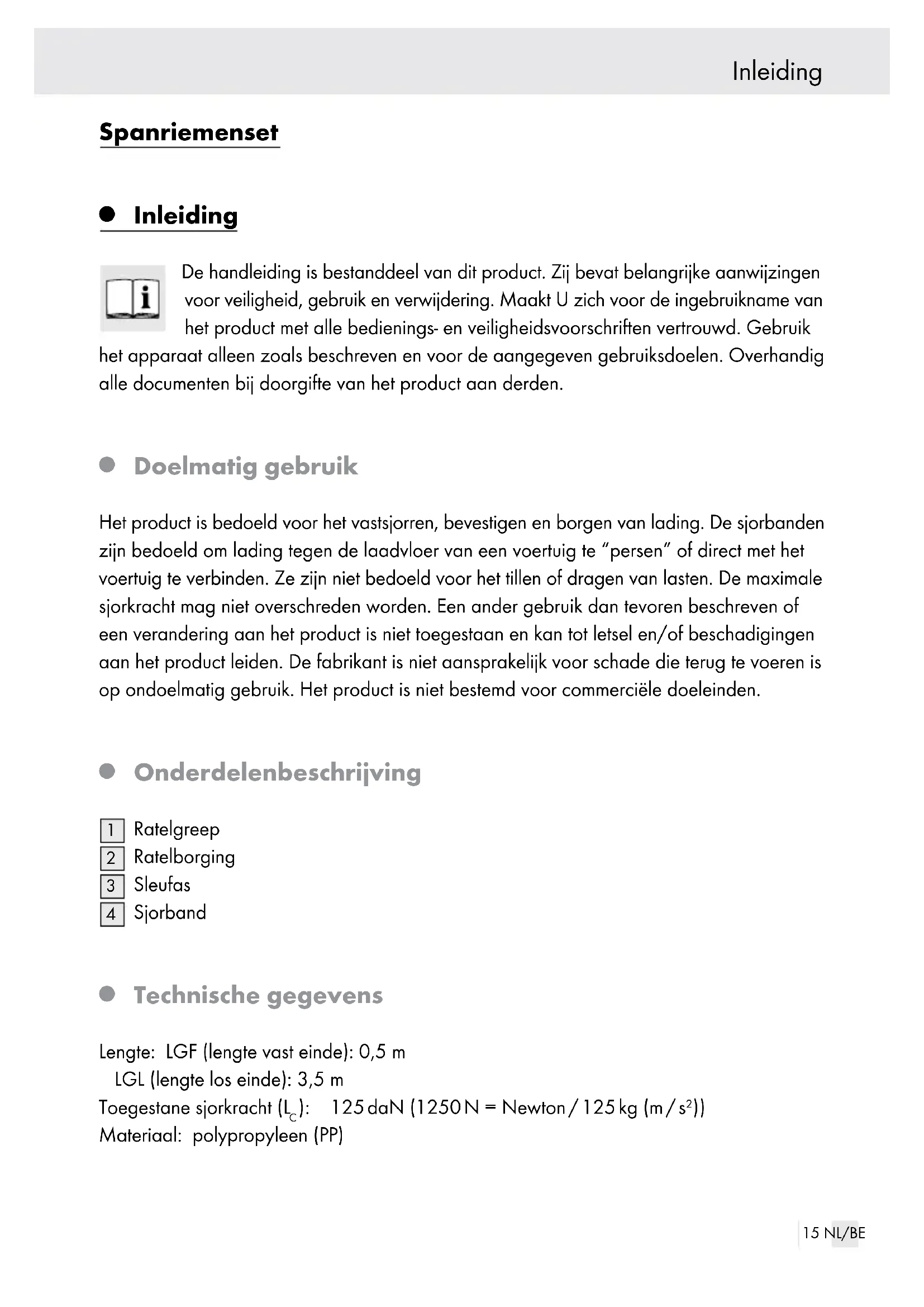 Doelmatig gebruik Het product is bedoeld voor het vastsjorren, bevestigen en borgen van lading. De sjorbanden zijn bedoeld om lading tegen de laadvloer van een voertuig te “persen” of direct met het voertuig te verbinden. Ze zijn niet bedoeld voor het tillen of dragen van lasten. De maximale sjorkracht mag niet overschreden worden. Een ander gebruik dan tevoren beschreven of een verandering aan het product is niet toegestaan en kan tot letsel en/of beschadigingen aan het product leiden. De fabrikant is niet aansprakelijk voor schade die terug te voeren is op ondoelmatig gebruik. Het product is niet bestemd voor commerciële doeleinden.