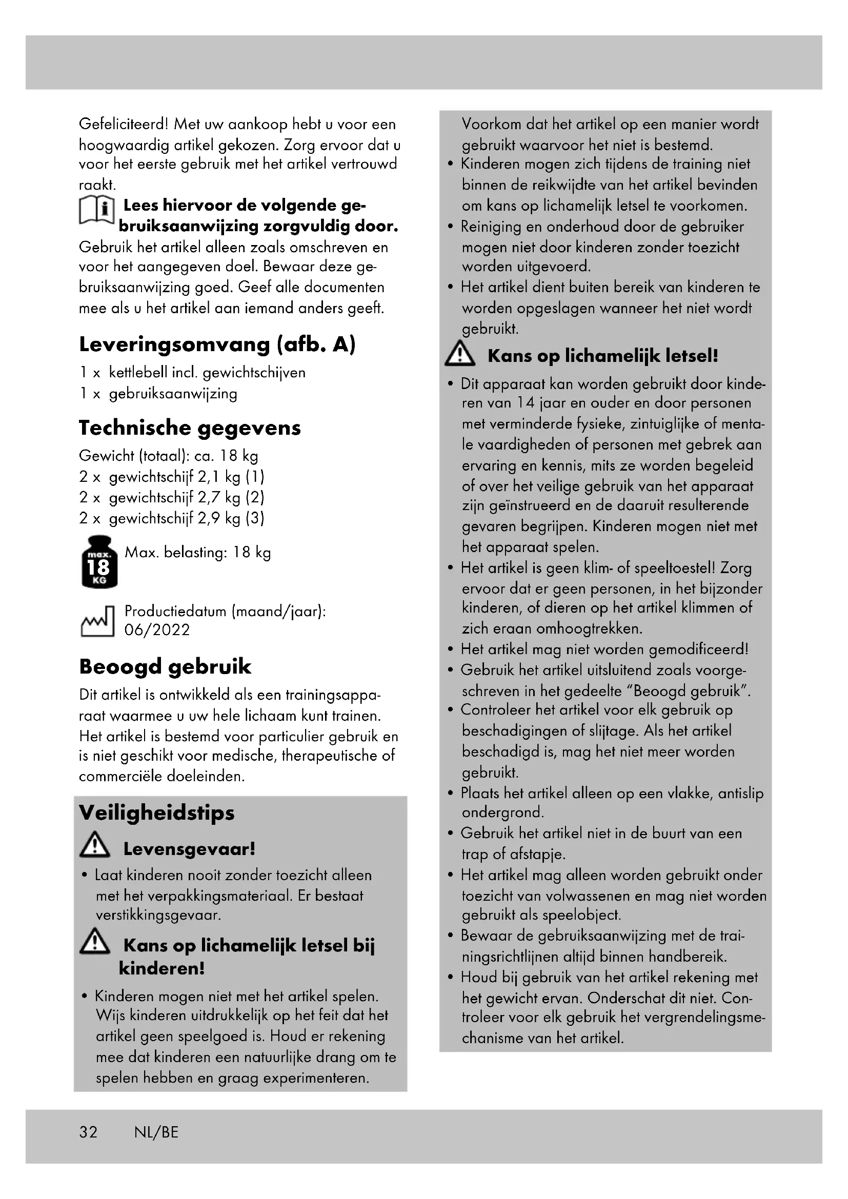 Max. belasting: 18 kg Productiedatum (maand/jaar): 06/2022 Beoogd gebruik Dit artikel is ontwikkeld als een trainingsappa- raat waarmee u uw hele lichaam kunt trainen. Het artikel is bestemd voor particulier gebruik en is niet geschikt voor medische, therapeutische of commerciële doeleinden. Veiligheidstips Levensgevaar!