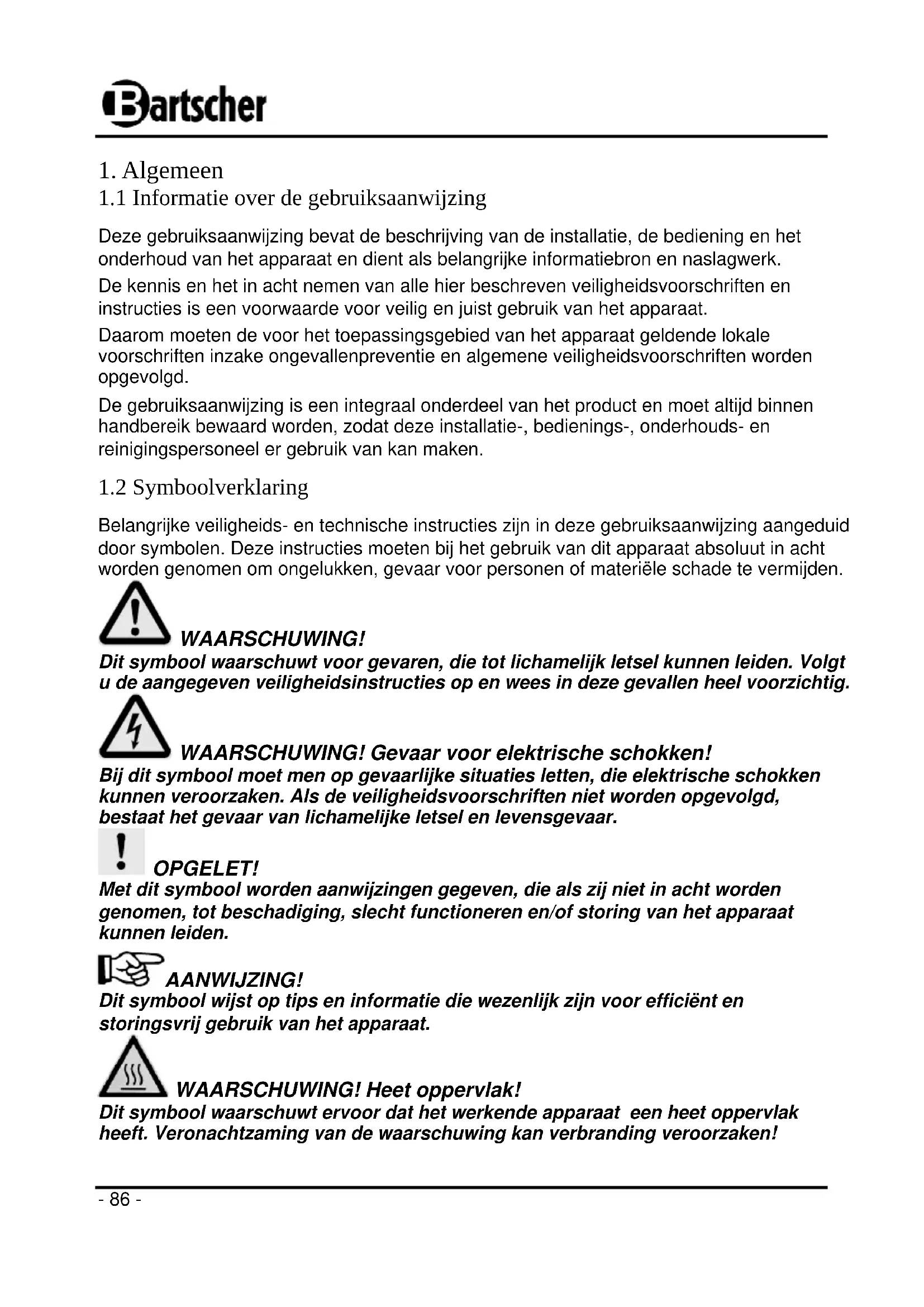 Belangrijke veiligheids- en technische instructies zijn in deze gebruiksaanwijzing aangeduid door symbolen. Deze instructies moeten bij het gebruik van dit apparaat absoluut in acht worden genomen om ongelukken, gevaar voor personen of materiële schade te vermijden. WAARSCHUWING! Dit symbool waarschuwt voor gevaren, die tot lichamelijk letsel kunnen leiden. Volgt u de aangegeven veiligheidsinstructies op en wees in deze gevallen heel voorzichtig. WAARSCHUWING! Gevaar voor elektrische schokken! Bij dit symbool moet men op gevaarlijke situaties letten, die elektrische schokken kunnen veroorzaken. Als de veiligheidsvoorschriften niet worden opgevolgd, bestaat het gevaar van lichamelijke letsel en levensgevaar. OPGELET! Met dit symbool worden aanwijzingen gegeven, die als zij niet in acht worden genomen, tot beschadiging, slecht functioneren en/of storing van het apparaat kunnen leiden. AANWIJZING! Dit symbool wijst op tips en informatie die wezenlijk zijn voor efficiënt en storingsvrij gebruik van het apparaat. WAARSCHUWING! Heet oppervlak! Dit symbool waarschuwt ervoor dat het werkende apparaat een heet oppervlak heeft. Veronachtzaming van de waarschuwing kan verbranding veroorzaken!- 87 -