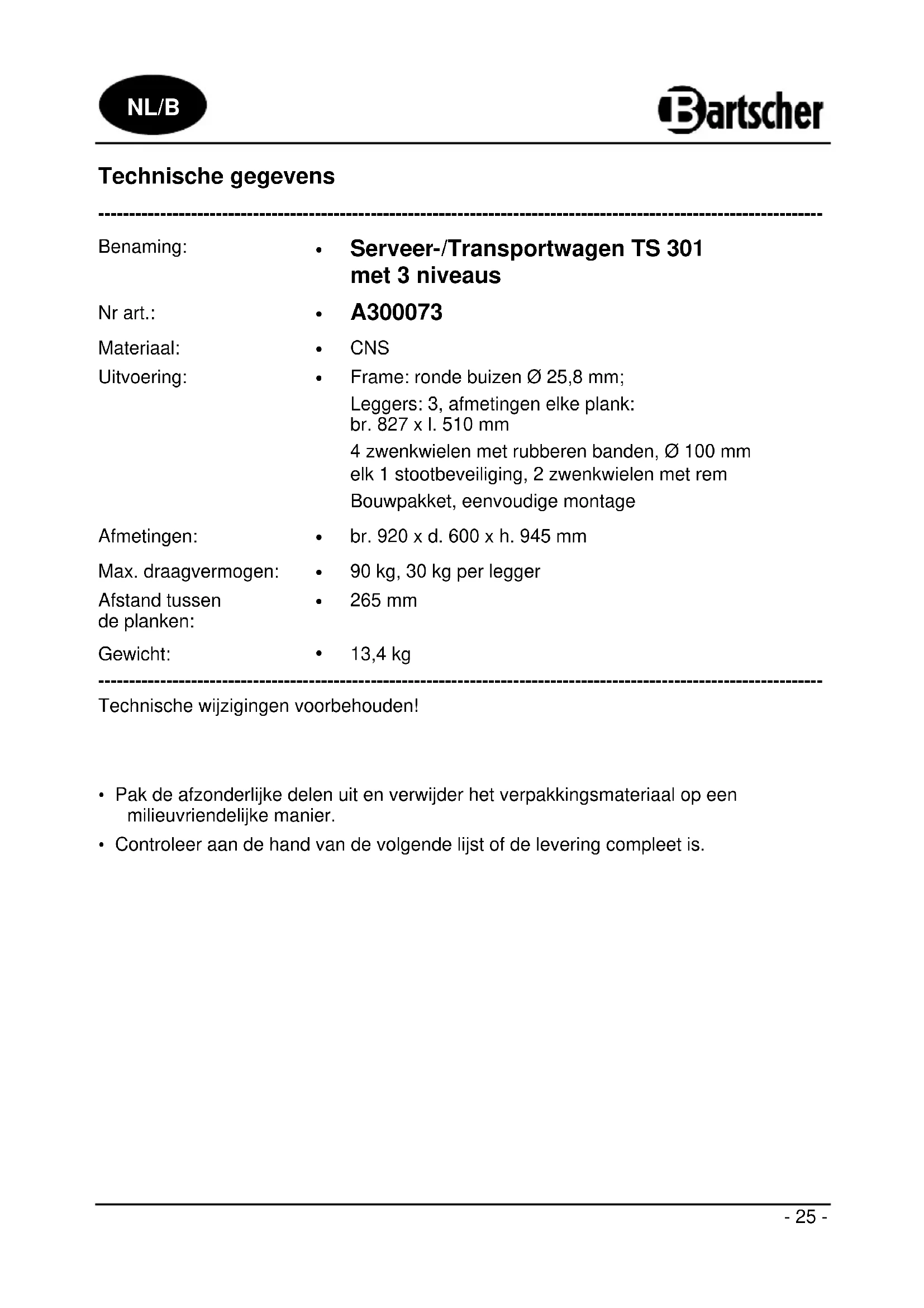Frame: ronde buizen Ø 25,8 mm; Leggers: 3, afmetingen elke plank: br. 827 x l. 510 mm 4 zwenkwielen met rubberen banden, Ø 100 mm elk 1 stootbeveiliging, 2 zwenkwielen met rem Bouwpakket, eenvoudige montage Afmetingen: