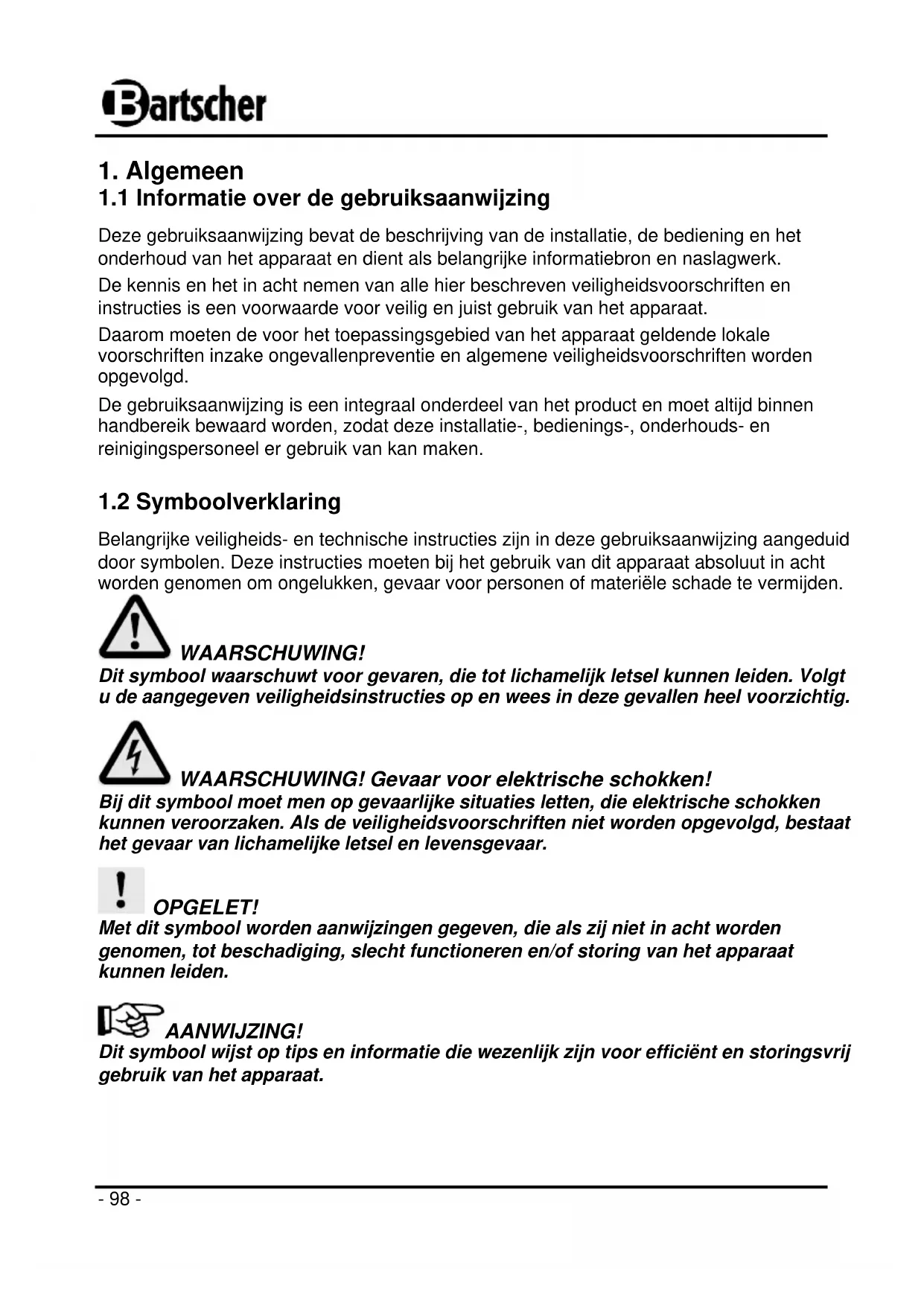 Belangrijke veiligheids- en technische instructies zijn in deze gebruiksaanwijzing aangeduid door symbolen. Deze instructies moeten bij het gebruik van dit apparaat absoluut in acht worden genomen om ongelukken, gevaar voor personen of materiële schade te vermijden. WAARSCHUWING! Dit symbool waarschuwt voor gevaren, die tot lichamelijk letsel kunnen leiden. Volgt u de aangegeven veiligheidsinstructies op en wees in deze gevallen heel voorzichtig. WAARSCHUWING! Gevaar voor elektrische schokken! Bij dit symbool moet men op gevaarlijke situaties letten, die elektrische schokken kunnen veroorzaken. Als de veiligheidsvoorschriften niet worden opgevolgd, bestaat het gevaar van lichamelijke letsel en levensgevaar. OPGELET! Met dit symbool worden aanwijzingen gegeven, die als zij niet in acht worden genomen, tot beschadiging, slecht functioneren en/of storing van het apparaat kunnen leiden. AANWIJZING! Dit symbool wijst op tips en informatie die wezenlijk zijn voor efficiënt en storingsvrij gebruik van het apparaat.- 99 -
