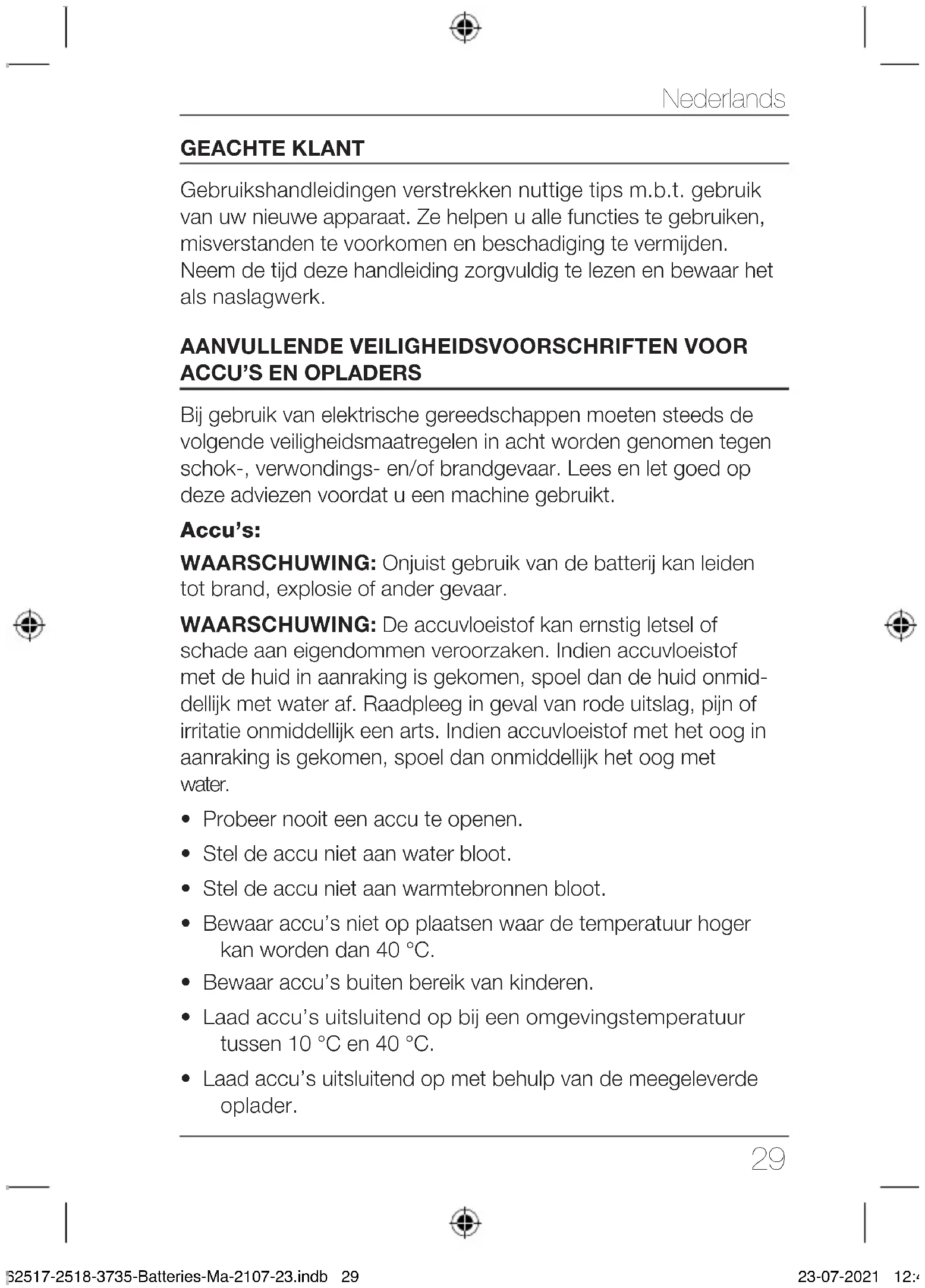 - Belangrijk! Gevaar! Laat de batterij nooit kortsluiten of stel de batterij niet bloot aan vocht. Bewaar de batterij niet samen met metalen onderdelen die kunnen kortsluiting veroorzaken van de contactpunten. De batterij kan overver- hit raken, gaan branden of ontploffen. Onder extreme gebruikscondities kan er vloeistof uit de accu vrijkomen. Als u vloeistof op de batterijen opmerkt, verwijder met behulp van een doekje voorzichtig de vloeistof van de accu. Vermijd huidcontact. Als de vloeistof toch in aanraking komt met de huid of de ogen, volgt u de onderstaande instructies op. Opladers Uw oplader is ontwikkeld voor een bepaalde spanning. Contro- leer altijd of de netspanning overeenkomt met het voltage op het typeplaatje. 7062517-2518-3735-Batteries-Ma-2107-23.indb 307062517-2518-3735-Batteries-Ma-2107-23.indb 30 23-07-2021 12:4323-07-2021 12:4331 Nederlands