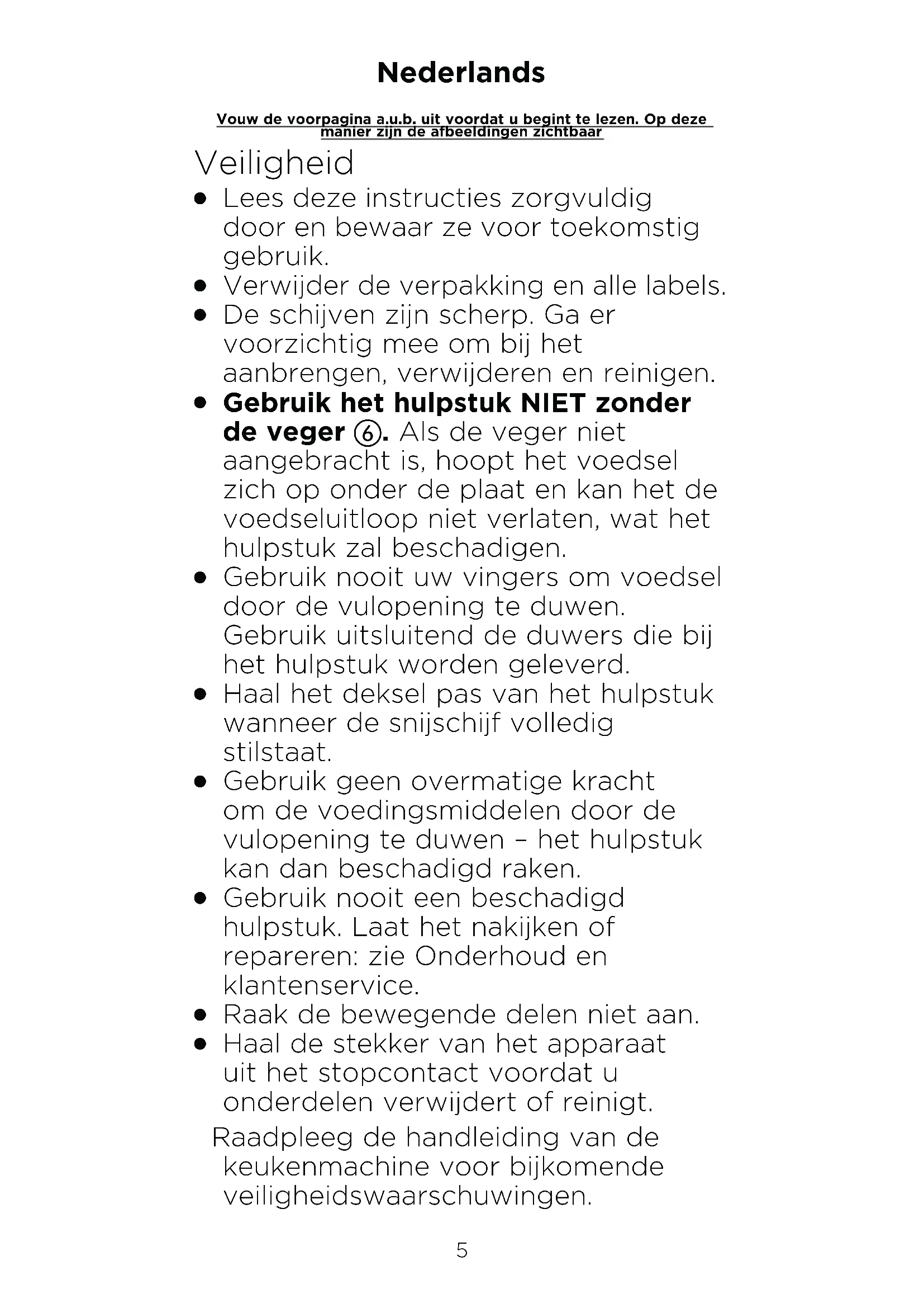 Gebruik nooit uw vingers om voedsel door de vulopening te duwen. Gebruik uitsluitend de duwers die bij het hulpstuk worden geleverd.