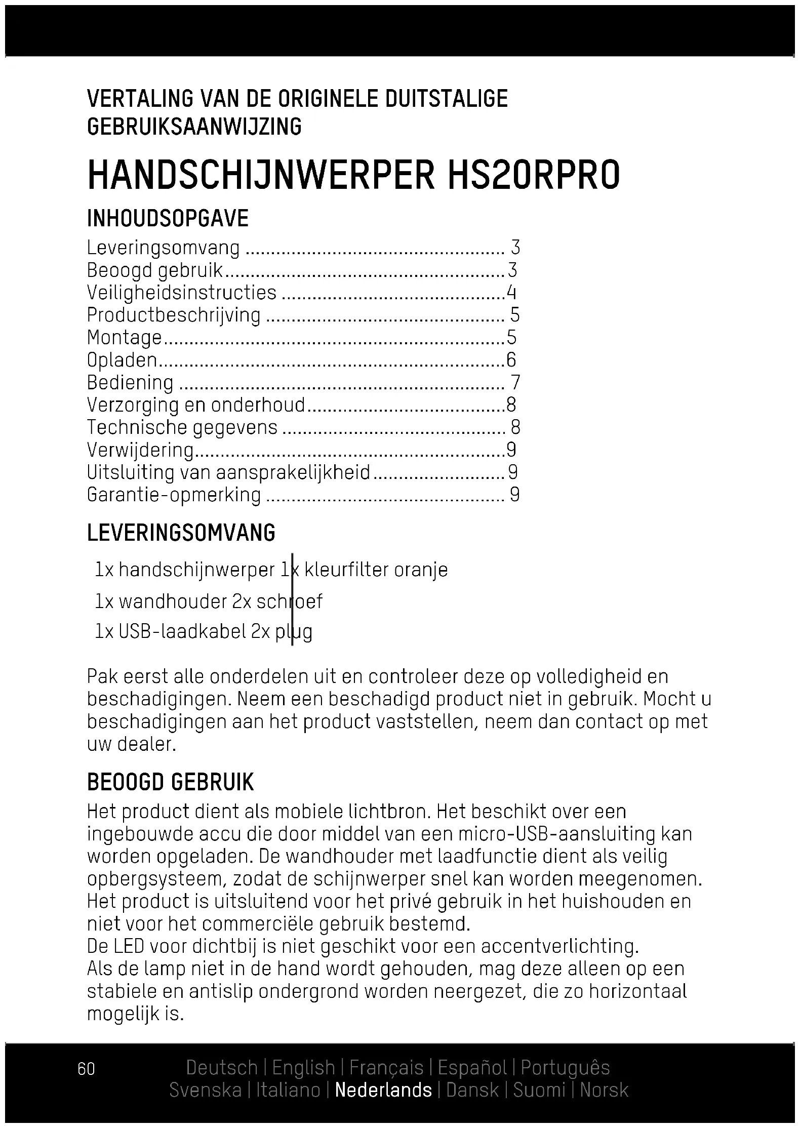 - Garantie-opmerking LEVERINGSOMVANG 1x handschijnwerper 1x kleurfilter oranje 1x wandhouder 2x schroef 1x USB-laadkabel 2x plug Pak eerst alle onderdelen uit en controleer deze op volledigheid en beschadigingen. Neem een beschadigd product niet in gebruik. Mocht u beschadigingen aan het product vaststellen, neem dan contact op met uw dealer. BEOOGD GEBRUIK Het product dient als mobiele lichtbron. Het beschikt over een ingebouwde accu die door middel van een micro-USB-aansluiting kan worden opgeladen. De wandhouder met laadfunctie dient als veilig opbergsysteem, zodat de schijnwerper snel kan worden meegenomen. Het product is uitsluitend voor het privé gebruik in het huishouden en niet voor het commerciële gebruik bestemd. De LED voor dichtbij is niet geschikt voor een accentverlichting. Als de lamp niet in de hand wordt gehouden, mag deze alleen op een stabiele en antislip ondergrond worden neergezet, die zo horizontaal mogelijk is. Deutsch | English | Français | Español | Português Svenska | Italiano | Nederlands | Dansk | Suomi | Norsk61 VEILIGHEIDSINSTRUCTIES Lees vóór ingebruikname van het product de complete gebruiksaanwijzing zorgvuldig door. Deze bevat belangrijke aanwijzingen betreffende de omgang met het product. Als u het product aan derde personen doorgeeft, geef deze gebruiksaanwijzing dan ook mee. p. 9