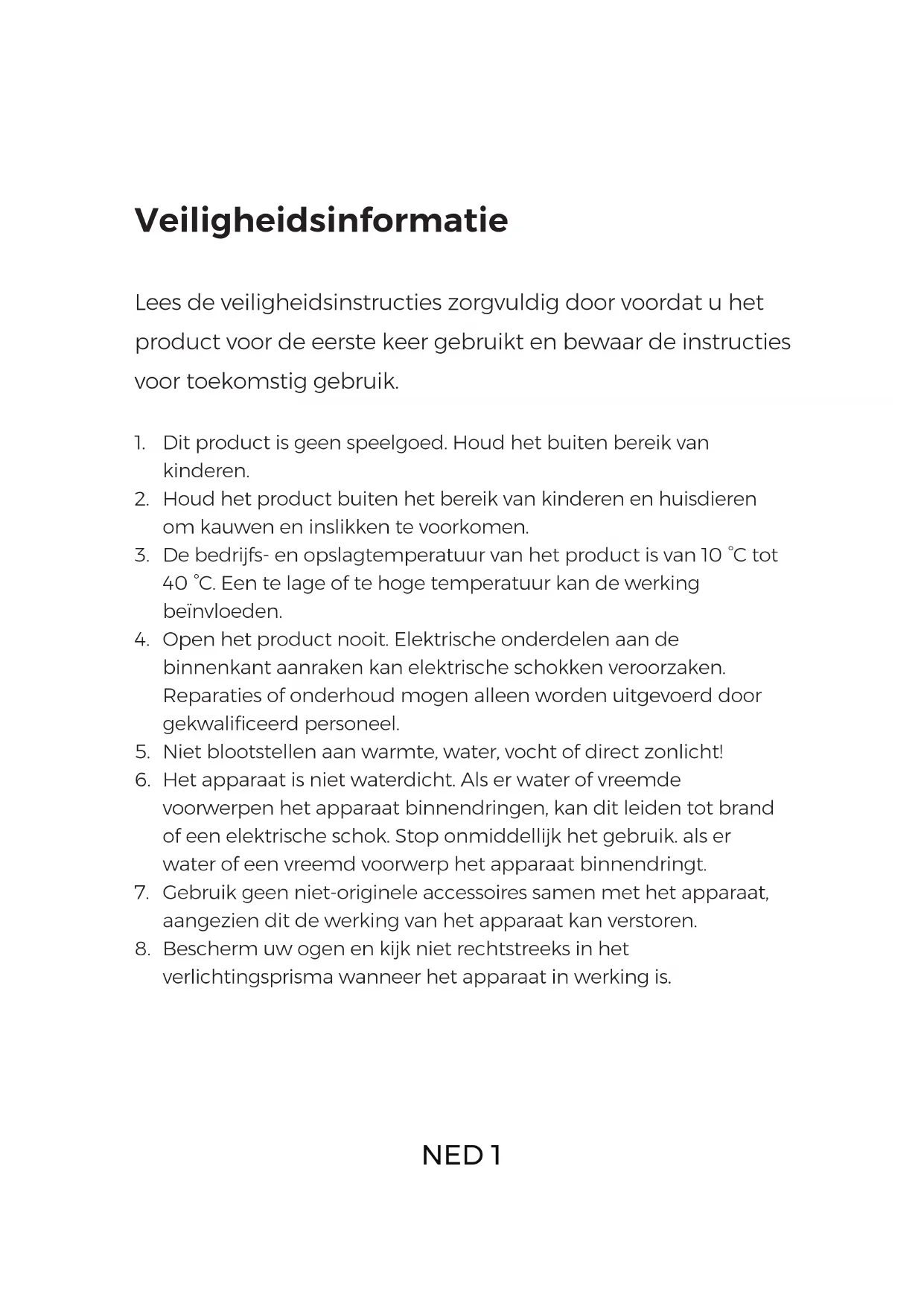 NED 1 Dit product is geen speelgoed. Houd het buiten bereik van kinderen. Houd het product buiten het bereik van kinderen en huisdieren om kauwen en inslikken te voorkomen. De bedrijfs- en opslagtemperatuur van het product is van 10 °C tot 40 °C. Een te lage of te hoge temperatuur kan de werking beïnvloeden. Open het product nooit. Elektrische onderdelen aan de binnenkant aanraken kan elektrische schokken veroorzaken. Reparaties of onderhoud mogen alleen worden uitgevoerd door gekwalificeerd personeel. Niet blootstellen aan warmte, water, vocht of direct zonlicht! Het apparaat is niet waterdicht. Als er water of vreemde voorwerpen het apparaat binnendringen, kan dit leiden tot brand of een elektrische schok. Stop onmiddellijk het gebruik. als er water of een vreemd voorwerp het apparaat binnendringt. Gebruik geen niet-originele accessoires samen met het apparaat, aangezien dit de werking van het apparaat kan verstoren. Bescherm uw ogen en kijk niet rechtstreeks in het verlichtingsprisma wanneer het apparaat in werking is. Lees de veiligheidsinstructies zorgvuldig door voordat u het product voor de eerste keer gebruikt en bewaar de instructies voor toekomstig gebruik.Discolamp met afstandsbediening