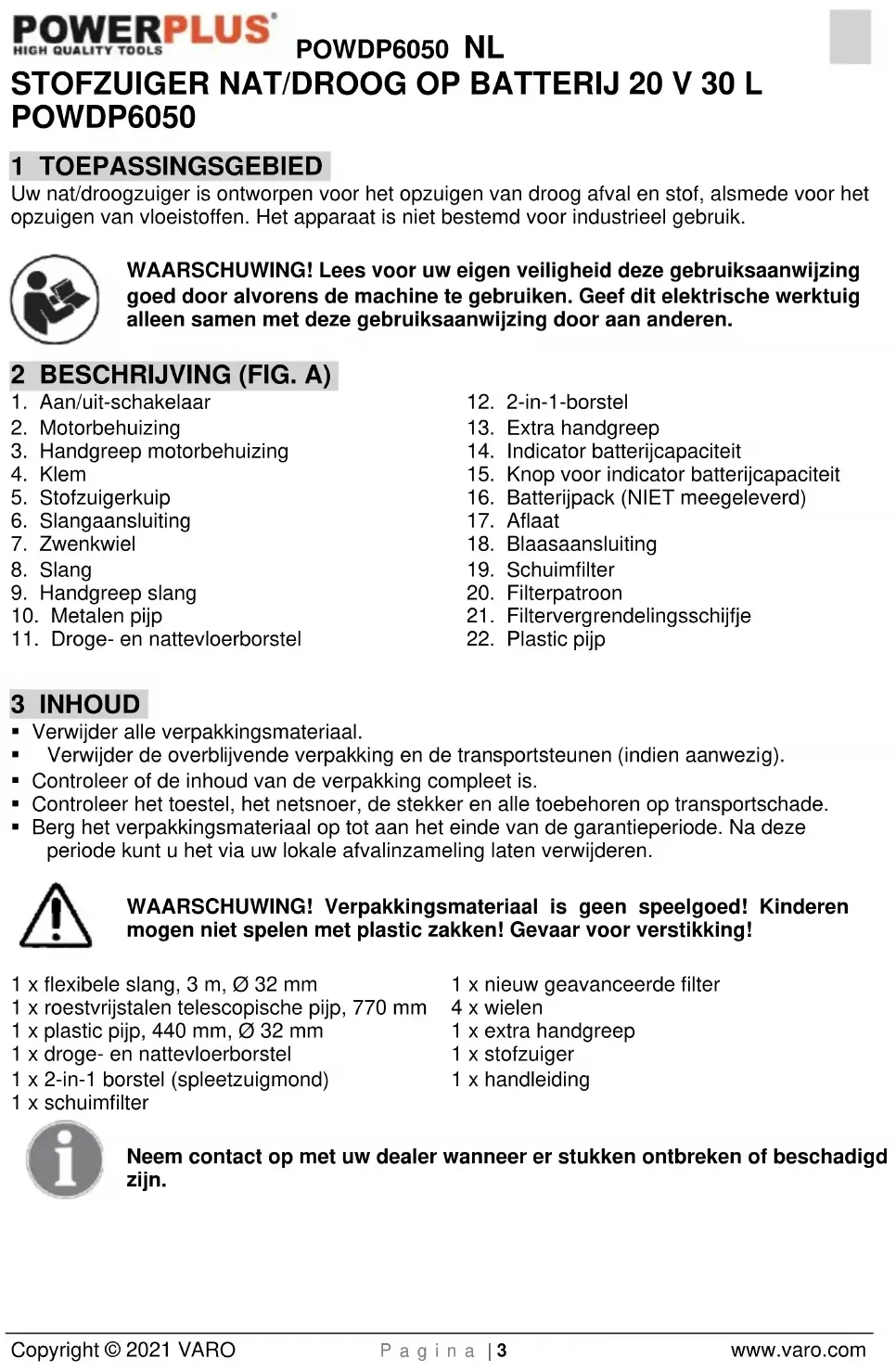 - Berg het verpakkingsmateriaal op tot aan het einde van de garantieperiode. Na deze periode kunt u het via uw lokale afvalinzameling laten verwijderen. WAARSCHUWING! Verpakkingsmateriaal is geen speelgoed! Kinderen mogen niet spelen met plastic zakken! Gevaar voor verstikking! 1 x flexibele slang, 3 m, Ø 32 mm 1 x roestvrijstalen telescopische pijp, 770 mm 1 x plastic pijp, 440 mm, Ø 32 mm 1 x droge- en nattevloerborstel 1 x 2-in-1 borstel (spleetzuigmond) 1 x schuimfilter 1 x nieuw geavanceerde filter 4 x wielen 1 x extra handgreep 1 x stofzuiger 1 x handleiding Neem contact op met uw dealer wanneer er stukken ontbreken of beschadigd zijn.POWDP6050 NL Copyright © 2021 VARO P a g i n a | 4 www.varo.com