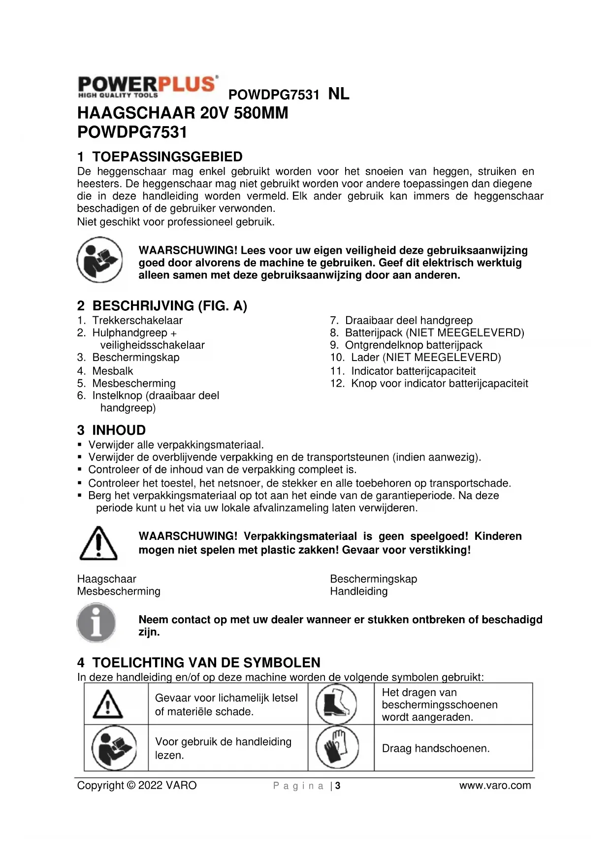 - Uw toestel moet minstens 1x per maand opgeladen worden, opdat de werking van dit toestel optimaal blijft. 14 MILIEU Indien u, na zekere tijd, beslist uw machine te vervangen, werp deze dan niet weg bij uw huishoudelijk afval maar doe dit op een milieuvriendelijke wijze. Afval geproduceerd door elektrische machines mag niet op dezelfde manier behandeld worden als het gewone huishoudelijke afval. Breng het naar een recyclagecentrum op plaatsen waar zulke gepaste installaties bestaan. Raadpleeg de plaatselijke instanties of de verkoper voor adviezen over inzameling en verwerking.POWDPG7531 NL Copyright © 2022 VARO P a g i n a | 11 www.varo.com 15 CONFORMITEITSVERKLARING VARO – Vic. Van Rompuy N.V. - Joseph Van Instraat 9 - BE2500 Lier - BELGIUM, verklaart dat, Product: Haagschaar Handelsmerk: PowerPlus Model: POWDPG7531 voldoet aan de essentiële eisen en aan de overige relevante bepalingen van de van toepassing zijnde Europese Richtlijnen, gebaseerd op de toepassing van Europese geharmoniseerde normen. Elke niet-toegelaten modificatie van het apparaat maakt deze verklaring nietig. Europese Richtlijnen (inclusief, indien van toepassing, hun wijzigingen tot op de datum van ondertekening); 2011/65/EU 2006/42/EC 2014/30/EU 2000/14/EC Annex V LwA Measured 90 dB(A) Guaranteed 93 dB(A) Europese geharmoniseerde normen (inclusief, indien van toepassing, hun wijzigingen tot op de datum van ondertekening); EN60745-1 : 2009 EN60745-2-15 : 2009 EN55014-1 : 2017 EN55014-2 : 2015 Beheerder van de technische documentatie: Philippe Vankerkhove, VARO – Vic. Van Rompuy N.V. Ondergetekende handelt in opdracht van de bedrijfsleider, Ludo Mertens Regelgevings- en compliancemanager 30/12/2021, Lier - BelgiumPOWDPG7531 FR Copyright © 2022 VARO P a g e | 1 www.varo.com 1 UTILISATION ................................................................................... 2