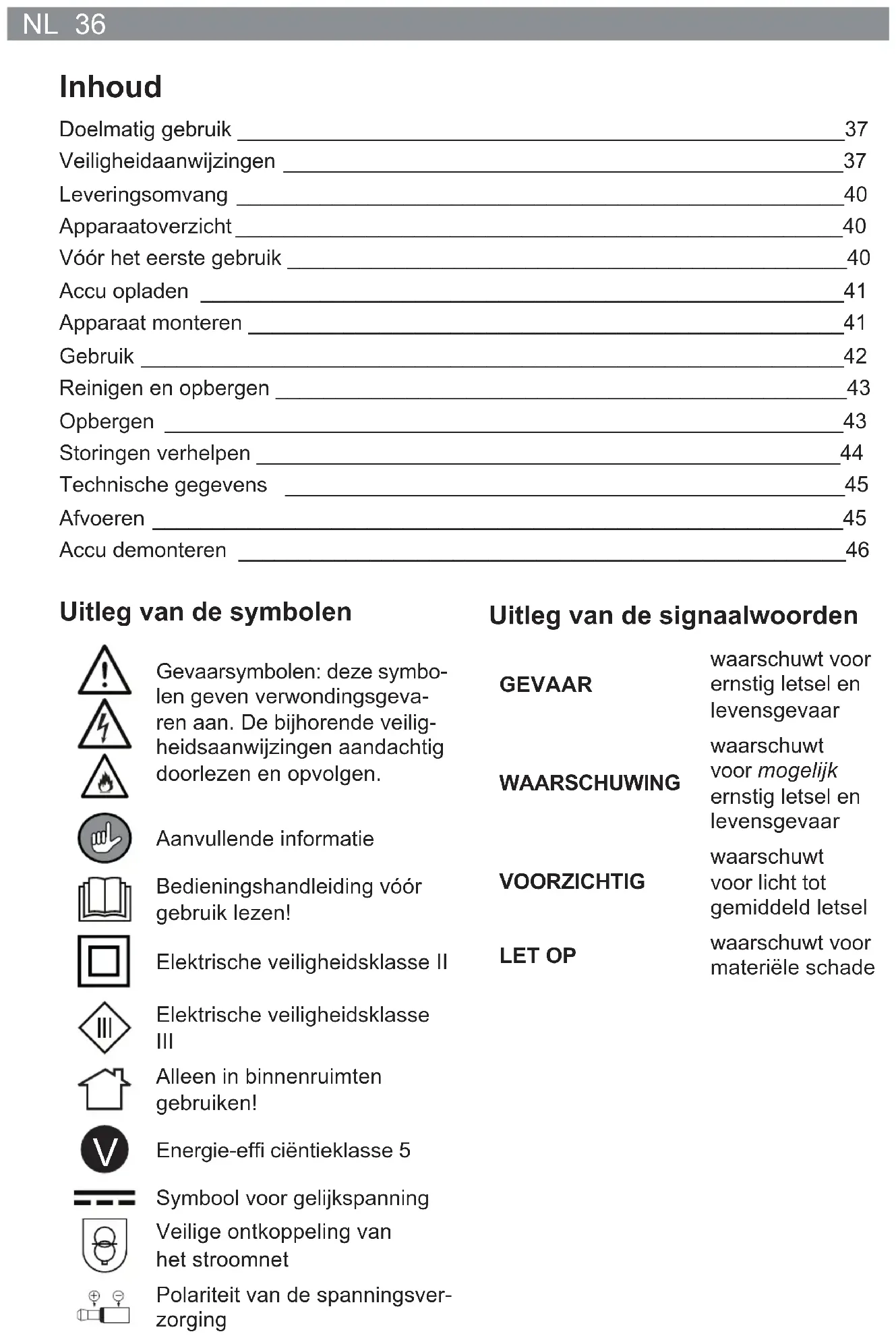 - Berg het apparaat en alle toebehoren op een koele, droge, tegen direct zonlicht beschermde plaats op, buiten bereik van kinderen en dieren.NL 44 Storingen verhelpen Wanneer het apparaat niet op de juiste wijze functioneert, kunt u nagaan of u een prob- leem zelf kunt oplossen. Neem contact op met de klantenservice als het probleem met de genoemde stappen niet kan worden opgelost. Probeer niet om een elektrisch apparaat zelf te repareren! Probleem Mogelijke oorzaak Oplossing Het apparaat werkt lang- zaam of helemaal niet. De accu is leeg. De accu opladen (zie hoofdstuk ‘Accu opladen’). De zuigkracht is zwak. Het opvangreservoir (5) is vol. Het opvangreservoir legen (zie hoofdstuk ‘Reinigen en opbergen’ – ‘Op- vangreservoir legen en reinigen’). De zuigopening resp. het mondstuk is verstopt. Het apparaat uitschakelen en de verstopping verwij- deren. Het controlelampje gaat niet branden, wanneer het apparaat wordt aangeslo- ten op het stroomnet. De adapter zit niet goed in de contactdoos resp. de voedingsplug niet goed in de aansluitbus van het apparaat. De plaatsing corrigeren. De contactdoos is defect. Probeer een andere con- tactdoos. De zekering in de zeke- ringskast is gesprongen. Aantal van de apparaten in de stroomkring vermin- deren. Er ontstaan strepen bij het reinigen van ruiten resp. gladde oppervlakken. De trekker is vervuild. Het mondstuk met trekker reinigen (zie hoofdstuk ‘Reinigen en opbergen’). Het reinigingsmiddel is verkeerd gedoseerd. De dosering corrigeren. Vreemde geur. Het apparaat is nieuw. Bij het eerste gebruik van het apparaat is een nieu- we geur normaal, die zal met de tijd verdwijnen.45 NL Technische gegevens Artikelnummer: – 00332 (lime groen) – 01147 (blauw) – 01599 (turkoois-wit) – 02304 (geel) – 02930 (turkoois) ID Anleitung: Z 00332_01147_01599_02304_02930 M DS V7 1118 Apparaat Model: HL-3202 Spanningsvoorziening: 3,7 V DC (1 x Li-ion-accu, type 18650), 1500 mAh Vermogen: 10 W Oplaadduur accu: ca. 3 – 3,5 uur Gebruiksduur accu: ca. 20 – 28 minuten Beschermingsklasse: III / IPX6 Vulhoeveelheid: 100 ml Voedingseenheid Model: DK5-050-0600-EU Spanningsvoorziening: 100 – 240 V~ 50 / 60 Hz Uitgang: 5 V DC, 600 mA Beschermingsklasse: II / IP44 Afvoeren Verwerk het verpakkingsmateriaal milieuvriendelijk en breng dit naar een recyc- lepunt. Dit apparaat valt onder de Europese richtlijn 2012/19/EU voor afgedankte elekt- rische en elektronische apparatuur (Waste Electrical and Electronical Equipment - WEEE). Dit apparaat mag niet bij het normale huisafval worden gedaan, maar dient milieuvriendelijk te worden verwerkt door een erkend afvalverwerkingsbe- drijf. De accu moet vóór het afvoeren van het apparaat worden verwijderd en moet gescheiden van het apparaat worden afgedankt. Binnen het kader van de mili- eubescherming mogen batterijen en accu’s niet met het normale huisvuil worden afgevoerd, maar moeten op de betreffende verzamelpunten worden afgegeven.NL 46 Accu demonteren PAS OP! ■ De hoofdeenheid mag alleen maar worden geopend voor het afvoeren van de accu. ■ De accu mag niet worden gedemonteerd, in vuur geworpen, in vloeistoffen onder- gedompeld of kortgesloten. Dit apparaat bevat een ingebouwde accu, deze moet voor het afvoeren van het afge- dankte apparaat worden gedemonteerd.