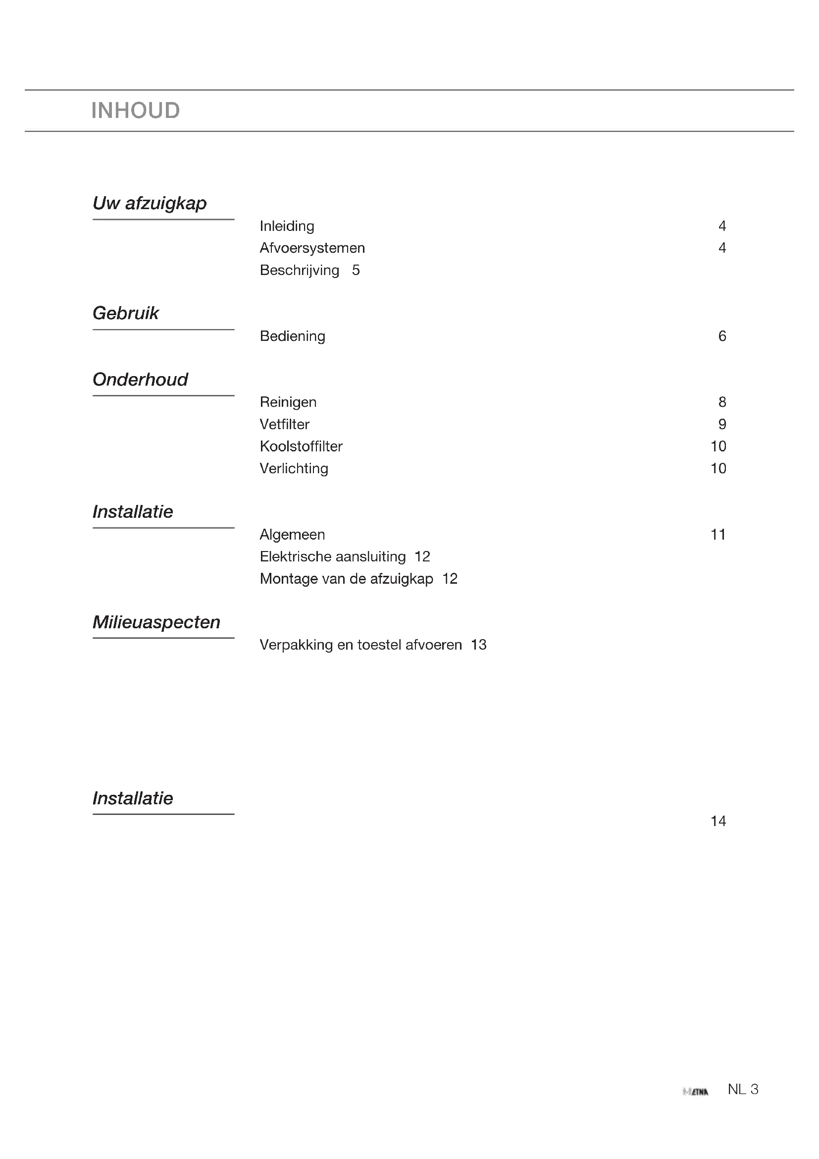 - Verwijder overtollig water. Let op dat het filter niet beschadigd raakt. Laat het filter in de oven gedurende minstens 1 uur drogen bij een maximum temperatuur van 80 °C. Na 4 keer reinigen (of als het filter beschadigd is) dient het filter vervangen te worden. Verlichting Deze afzuigkap is uitgevoerd met een lichtsysteem. Dit lichtsysteem mag alleen vervangen worden door een erkend installateur. Vervang het niet zelf. De lamp in dit huishoudelijke apparaat is uitsluitend bedoeld voor verlichting van dit apparaat. De lamp is niet geschikt voor de verlichting van een huishoudelijke ruimte. ONDERHOUDNL 11 INSTALLATIE Algemeen De aansluiting van dit apparaat op het lichtnet moet worden uitgevoerd door een erkend installateur, die de juiste veiligheidsvoorschriften kent en toepast. Het apparaat voldoet aan de Europese voorschriften. Belangrijk om te weten: