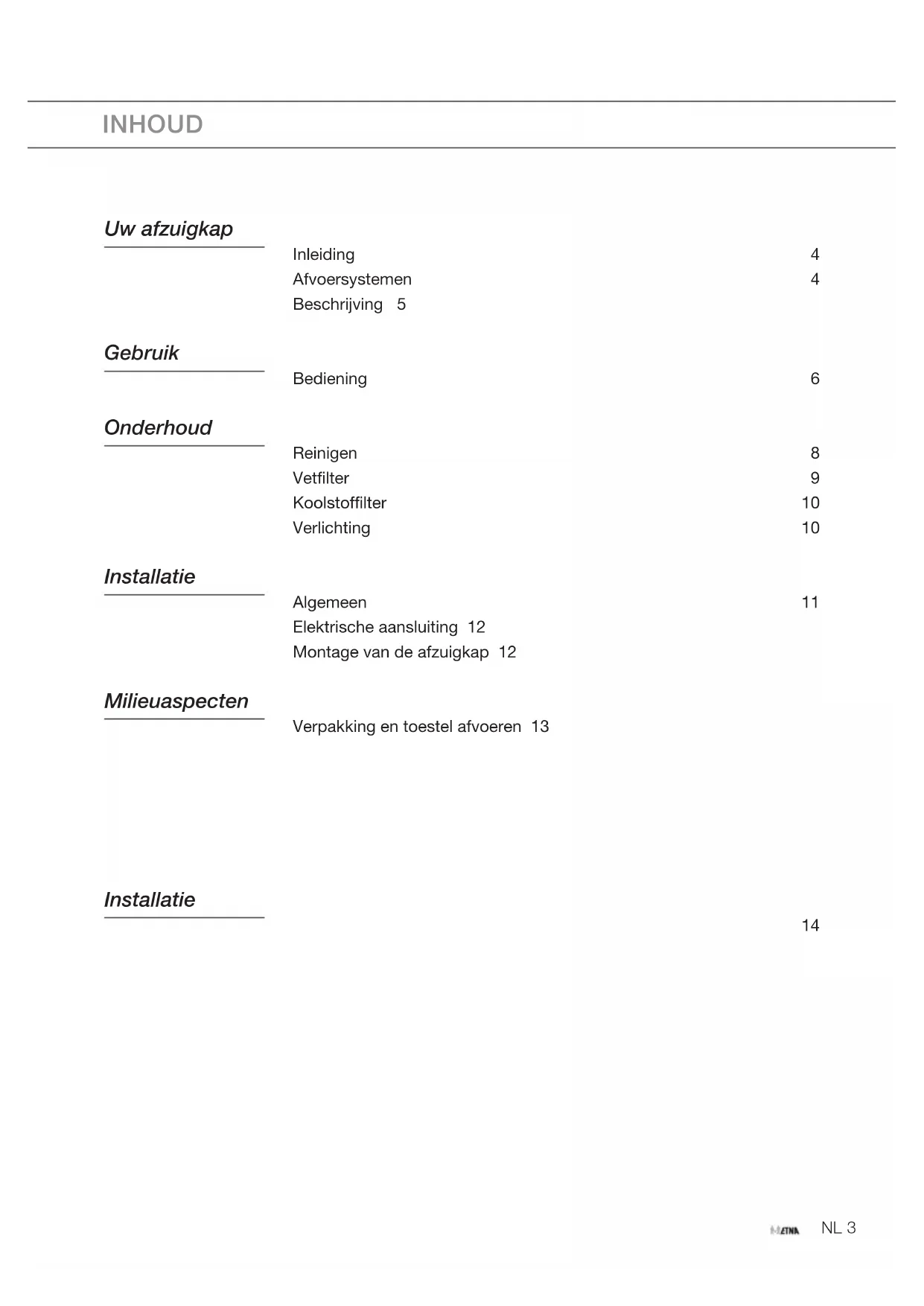 DUNSTABZUGSHAUBE COOKER HOOD AIP790 ---NL Gebruiksaanwijzing NL 3 - NL 18 FR Mode d’emploi FR 3 - FR 18 DE Bedienungsanleitung DE 3 - DE 18 EN Instructions for use EN 3 - EN 18 Scan de QR-code of kijk op de website etna.nl/connected hoe u een verbinding tot stand kunt brengen met uw toestel. Scan the QR code or visit the website etna.nl/connected to find out how to establish a connection with your appliance. Scannen Sie den QR-Code oder besuchen Sie die Website etna.nl/connected, um zu sehen, wie Sie eine Verbindung mit Ihrem Gerät herstellen können. Scannez le code QR ou visitez le site Web etna.be/connected pour savoir comment établir une connexion avec votre appareil. Gebruikte pictogrammen - Pictogrammes utilisés - Benutzte Piktogramme Pictograms used Belangrijk om te weten - Important à savoir - Wissenswertes - Important information Tip - Conseil - TippNL 3 INHOUD Uw afzuigkap Inleiding 4 Afvoersystemen 4 Beschrijving 5 Gebruik Bediening 6 Onderhoud Reinigen 8 Vetfilter 9 Koolstoffilter 10 Verlichting 10 Installatie Algemeen 11 Elektrische aansluiting 12 Montage van de afzuigkap 12 Milieuaspecten Verpakking en toestel afvoeren 13 Installatie 14NL 4 Inleiding Als u deze gebruiksaanwijzing doorleest, bent u snel op de hoogte van alle mogelijk heden die dit toestel u biedt. U vindt informatie voor uw veiligheid en over het onderhoud van het toestel. Bewaar de gebruiksaanwijzing en het installatievoorschrift. Een eventueel volgende gebruiker van dit toestel kan daar zijn voordeel mee doen. Op onze website kunt u de meest recente versie van de gebruiksaanwijzing vinden. Lees voor gebruik eerst de separate veiligheidsinstructies. Afvoersystemen De afzuigkap kan op twee manieren worden aangesloten:
