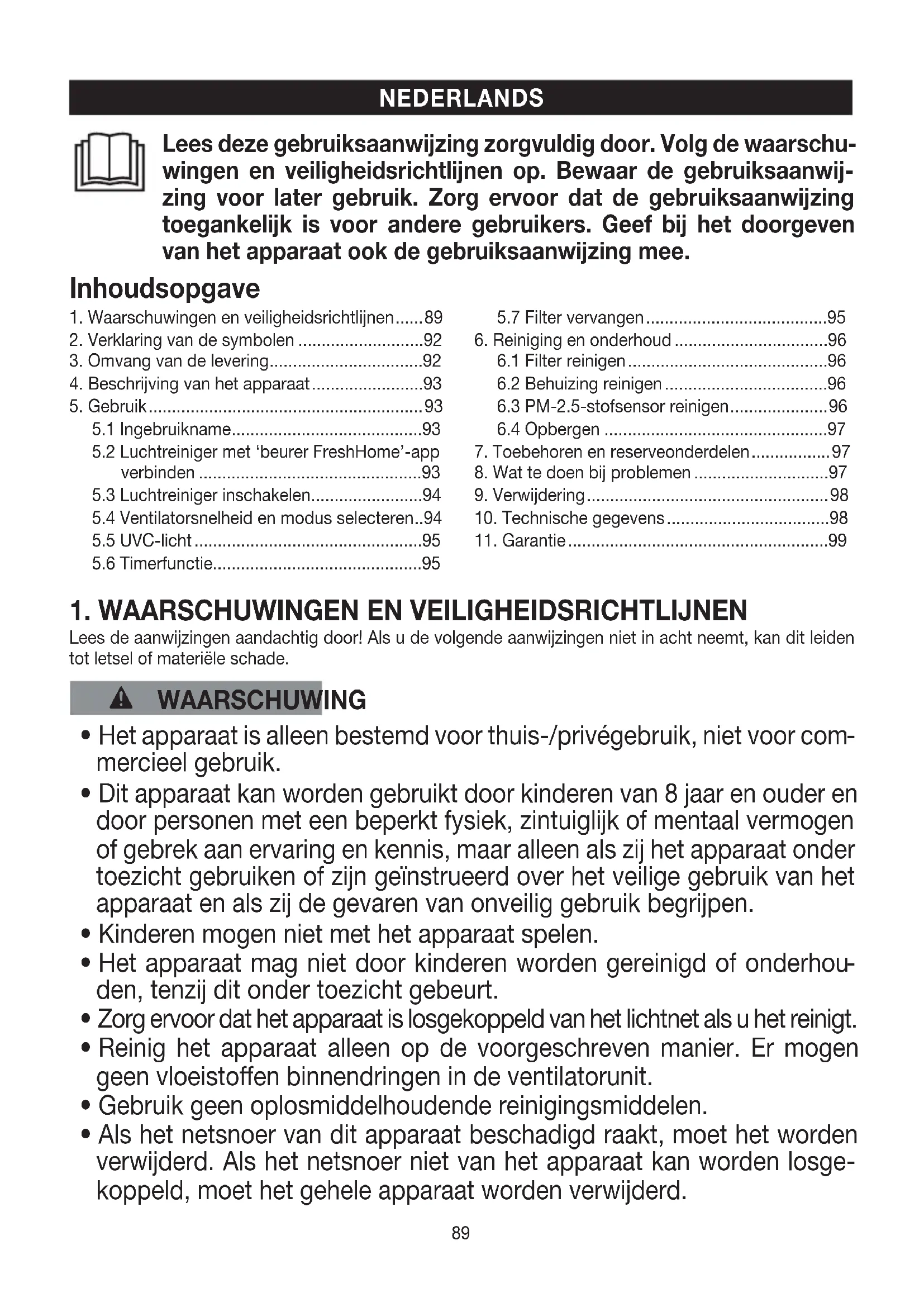 1. Waarschuwingen en veiligheidsrichtlijnen ...... 89