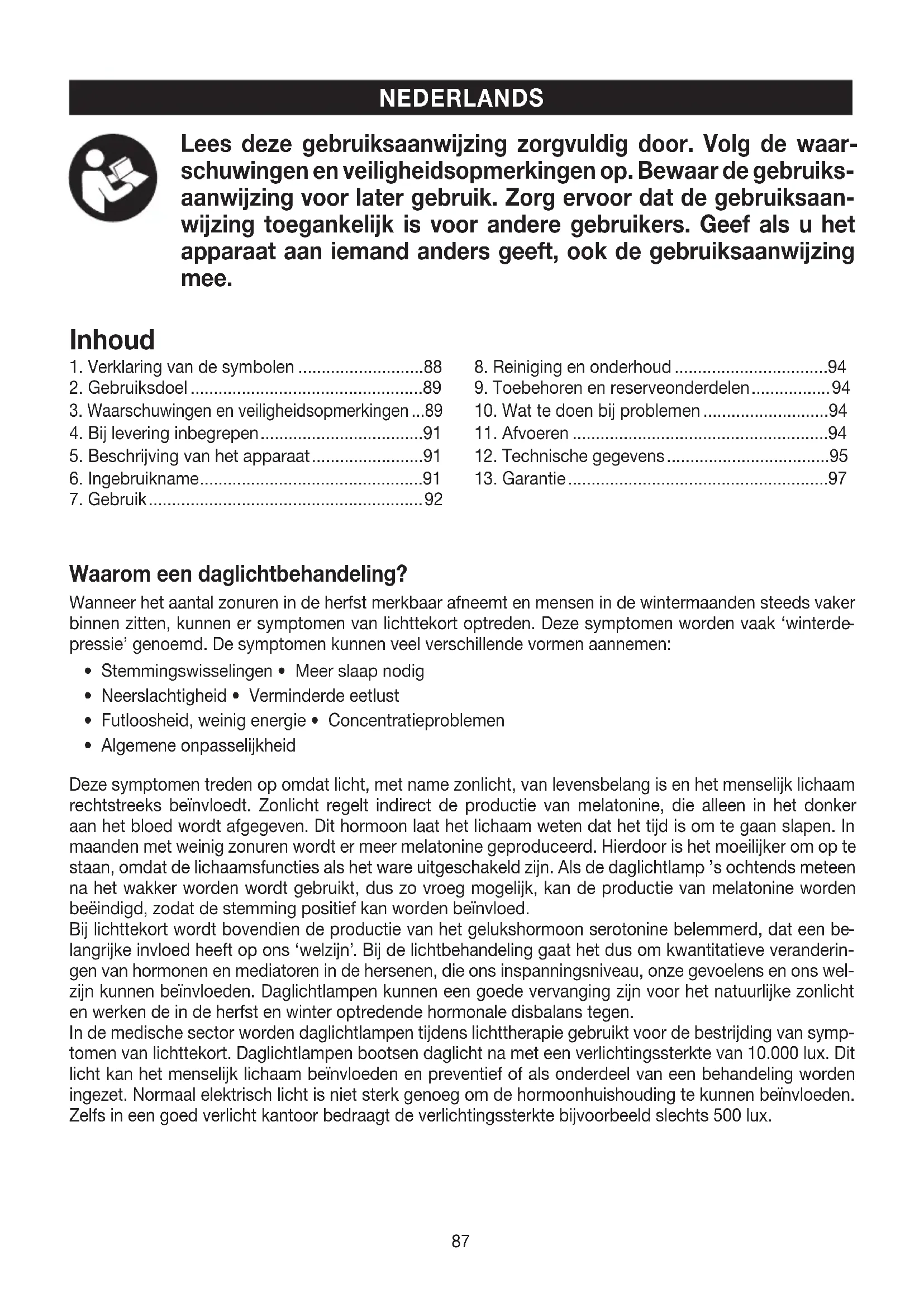 sić producentowi i/lub pełnomocnikowi producenta oraz odpowiedniemu krajowemu urzędowi państwa członkowskiego, wktórym znajduje się użytkownik/pacjent. Zastrzega się prawo do pomyłek izmian87 NEDERLANDS Lees deze gebruiksaanwijzing zorgvuldig door. Volg de waar- schuwingen en veiligheidsopmerkingen op. Bewaar de gebruiks- aanwijzing voor later gebruik. Zorg ervoor dat de gebruiksaan- wijzing toegankelijk is voor andere gebruikers. Geef als u het apparaat aan iemand anders geeft, ook de gebruiksaanwijzing mee. Waarom een daglichtbehandeling? Wanneer het aantal zonuren in de herfst merkbaar afneemt en mensen in de wintermaanden steeds vaker binnen zitten, kunnen er symptomen van lichttekort optreden. Deze symptomen worden vaak ‘winterde