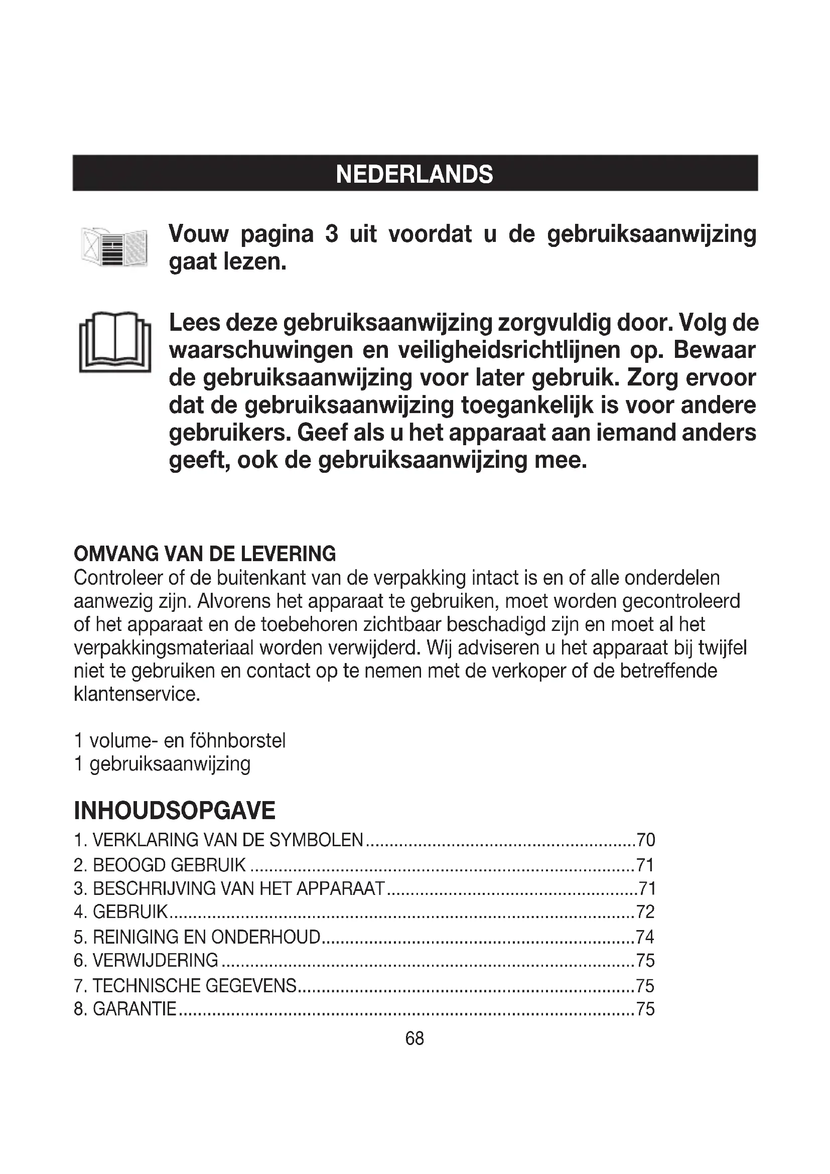 Controleer of de buitenkant van de verpakking intact is en of alle onderdelen aanwezig zijn. Alvorens het apparaat te gebruiken, moet worden gecontroleerd of het apparaat en de toebehoren zichtbaar beschadigd zijn en moet al het verpakkingsmateriaal worden verwijderd. Wij adviseren u het apparaat bij twijfel niet te gebruiken en contact op te nemen met de verkoper of de betreffende klantenservice. 1 volume- en föhnborstel 1 gebruiksaanwijzing