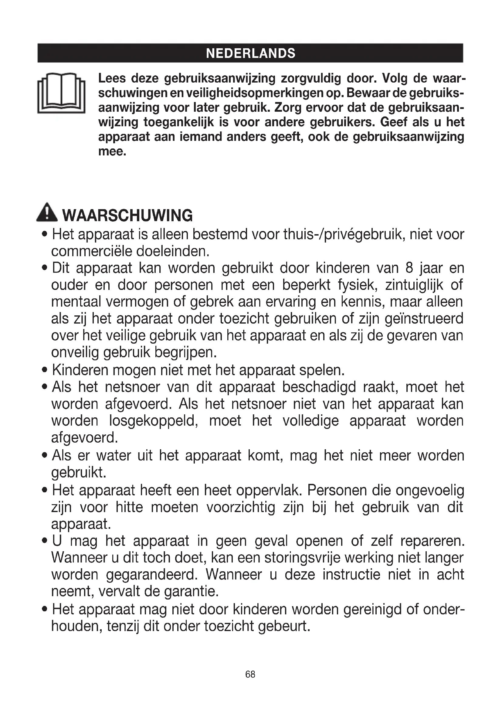 Szczegółowe informacje na temat gwarancji iwarunków gwarancji znajdują się wzałączonej ulotce gwa- rancyjnej.68 Lees deze gebruiksaanwijzing zorgvuldig door. Volg de waar- schuwingen en veiligheidsopmerkingen op. Bewaar de gebruiks- aanwijzing voor later gebruik. Zorg ervoor dat de gebruiksaan- wijzing toegankelijk is voor andere gebruikers. Geef als u het apparaat aan iemand anders geeft, ook de gebruiksaanwijzing mee. NEDERLANDS WAARSCHUWING