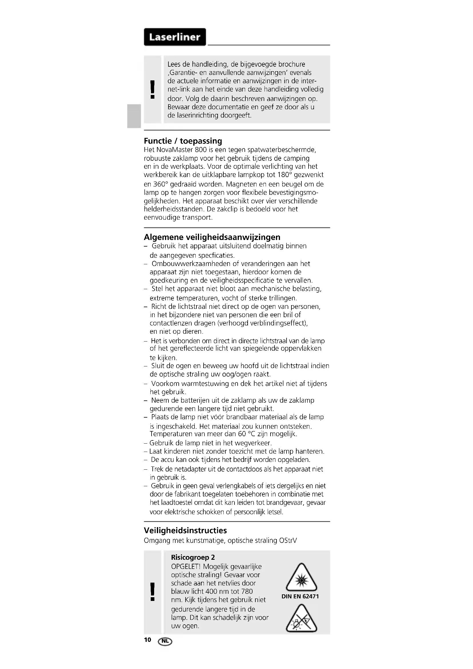 Veiligheidsinstructies Omgang met kunstmatige, optische straling OStrV Algemene veiligheidsaanwijzingen – Gebruik het apparaat uitsluitend doelmatig binnen de aangegeven specficaties. – Ombouwwerkzaamheden of veranderingen aan het apparaat zijn niet toegestaan, hierdoor komen de goedkeuring en de veiligheidsspecificatie te vervallen. – Stel het apparaat niet bloot aan mechanische belasting, extreme temperaturen, vocht of sterke trillingen. – Richt de lichtstraal niet direct op de ogen van personen, in het bijzondere niet van personen die een bril of contactlenzen dragen (verhoogd verblindingseffect), en niet op dieren. – Het is verbonden om direct in directe lichtstraal van de lamp of het gereecteerde licht van spiegelende oppervlakken te kijken. – Sluit de ogen en beweeg uw hoofd uit de lichtstraal indien de optische straling uw oog/ogen raakt. – Voorkom warmtestuwing en dek het artikel niet af tijdens het gebruik. – Neem de batterijen uit de zaklamp als uw de zaklamp gedurende een langere tijd niet gebruikt. – Plaats de lamp niet vóór brandbaar materiaal als de lamp is ingeschakeld. Het materiaal zou kunnen ontsteken. Temperaturen van meer dan 60°C zijn mogelijk. – Gebruik de lamp niet in het wegverkeer. – Laat kinderen niet zonder toezicht met de lamp hanteren. – De accu kan ook tijdens het bedrijf worden opgeladen. – Trek de netadapter uit de contactdoos als het apparaat niet in gebruik is. – Gebruik in geen geval verlengkabels of iets dergelijks en niet door de fabrikant toegelaten toebehoren in combinatie met het laadtoestel omdat dit kan leiden tot brandgevaar, gevaar voor elektrische schokken of persoonlijk letsel. Functie / toepassing Het NovaMaster 800 is een tegen spatwaterbeschermde, robuuste zaklamp voor het gebruik tdens de camping en in de werkplaats. Voor de optimale verlichting van het werkbereik kan de uitklapbare lampkop tot 180° gezwenkt en 360° gedraaid worden. Magneten en een beugel om de lamp op te hangen zorgen voor exibele bevestigingsmo- gelkheden. Het apparaat beschikt over vier verschillende helderheidsstanden. De zakclip is bedoeld voor het eenvoudige transport. Lees de handleiding, de bijgevoegde brochure ‚Garantie- en aanvullende aanwijzingen‘ evenals de actuele informatie en aanwijzingen in de inter- net-link aan het einde van deze handleiding volledig door. Volg de daarin beschreven aanwijzingen op. Bewaar deze documentatie en geef ze door als u de laserinrichting doorgeeft.